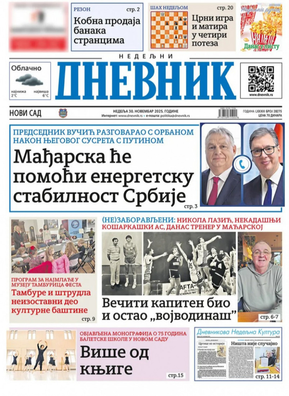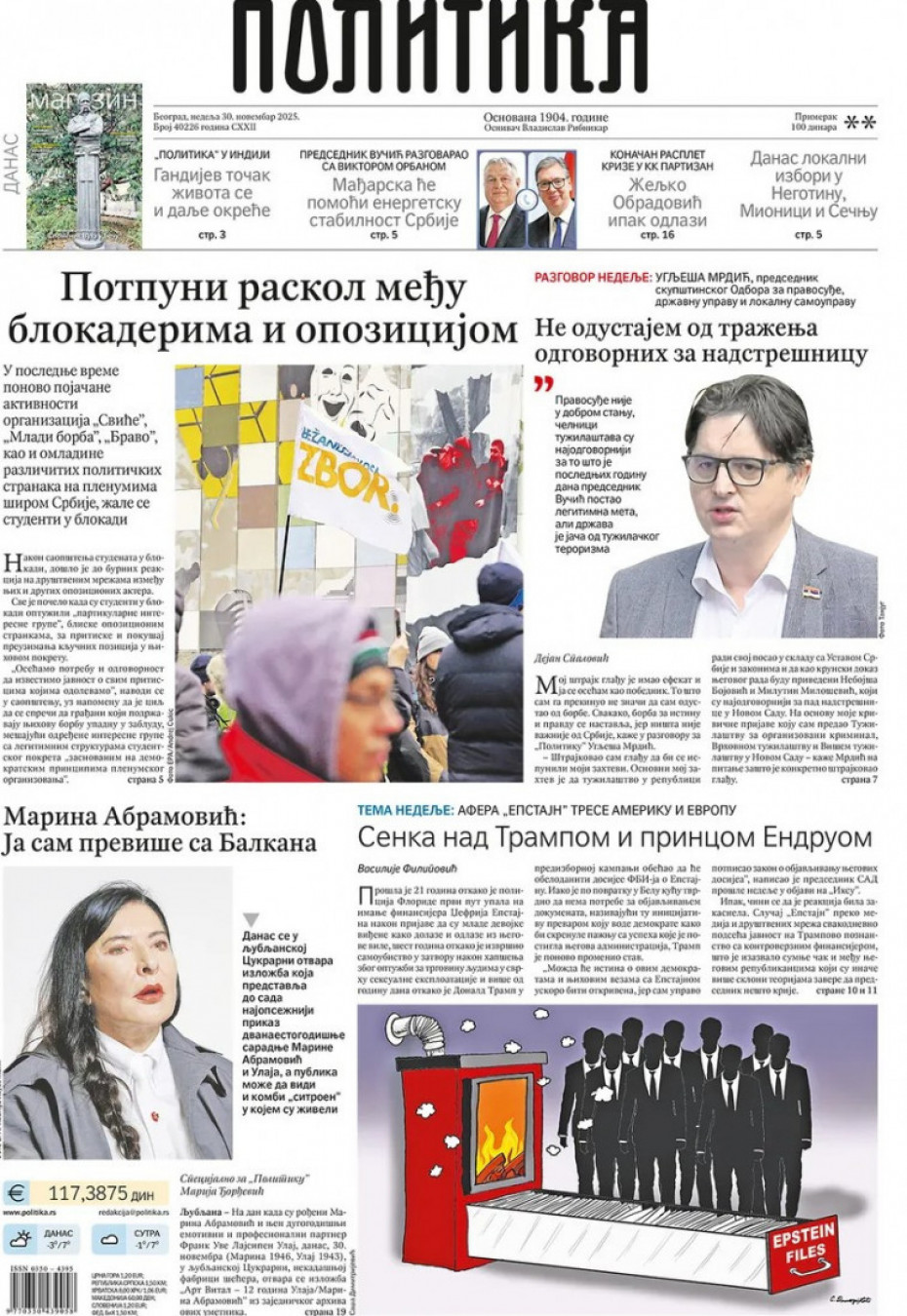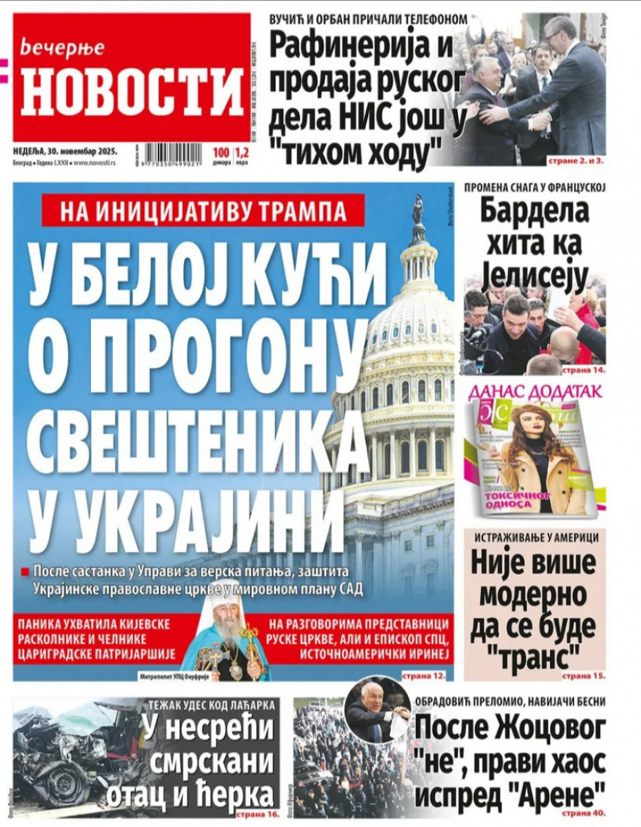 Naslovna Srbija Politika Politika Naslovne strane dnevne štampe za nedelju, 30. novembar Komentari Profimedia, Logo - Copyright Profimedia, Logo Autor: Euronews Srbija 29/11/2025 - 20:30 Podeli veličina teksta Aa Aa Pogledajte šta na naslovnim stranama donose dnevne novine u Srbiji u izdanju za nedelju, 30. novembar. Promo Pogledaj galeriju Promo Pogledaj galeriju Promo Pogledaj galeriju Promo Pogledaj galeriju Promo Pogledaj galeriju Promo Pogledaj galeriju Promo Pogledaj galeriju Promo Pogledaj galeriju Promo Pogledaj galeriju Više o... Naslovne strane Naslovnice Dnevne novine Dnevna štampa Top tagovi Euronews Montenegro Kosovo i Metohija Rat u Ukrajini Kriza na Bliskom istoku