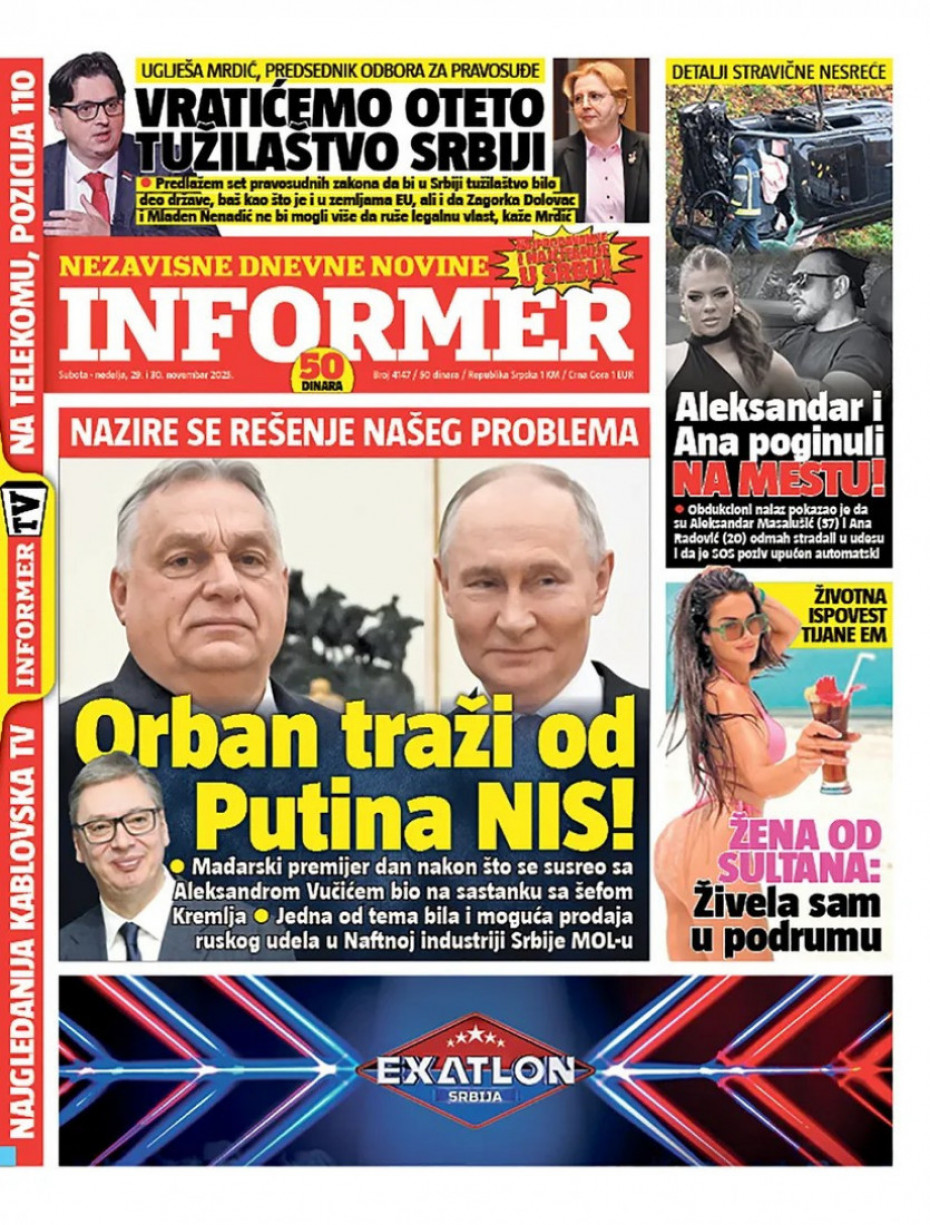 Politika Vučić: Razgovarao sam sa Orbanom, naglasio je da će Mađarska pomoći Srbiji On je na svom Instagram nalogu napisao da je sa Orbanom razgovarao telefonom i da ga je mađarski premijer obavestio o svom sastanku u Moskvi 29/11/2025 15:22 https://www.euronews.rs/srbija/politika/198964/vucic-i-orban-o-energetskoj-stabilnosti-srbije/vest pročitaj celu vest