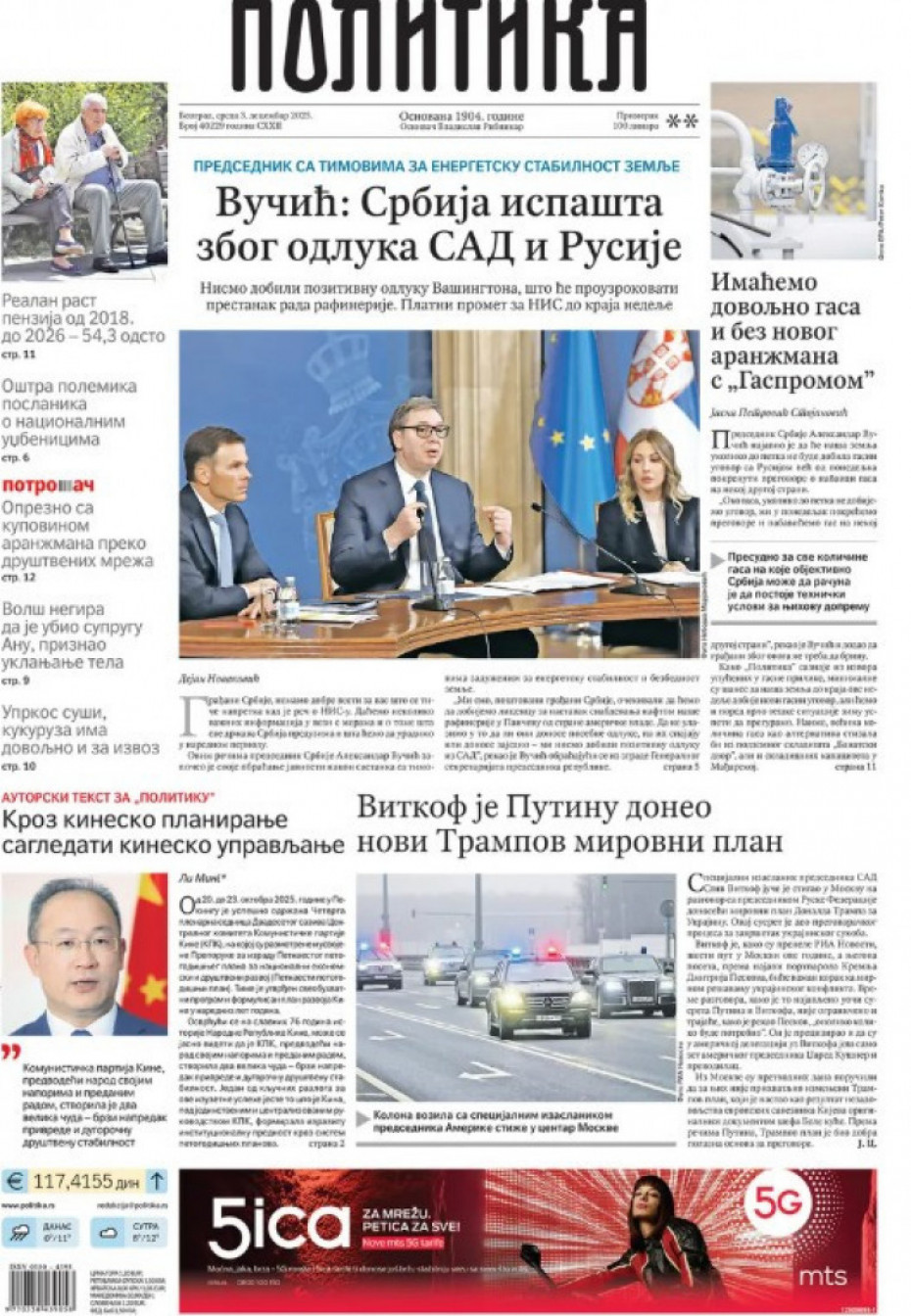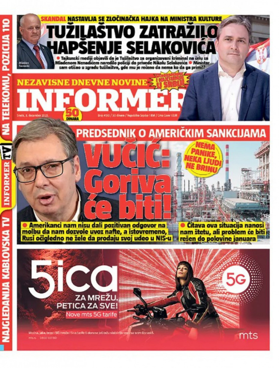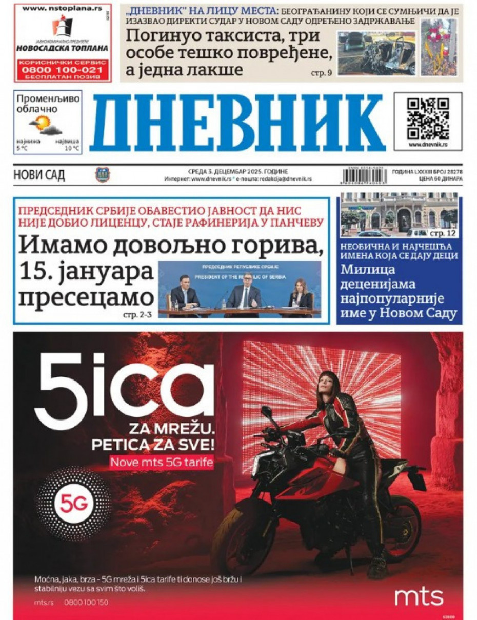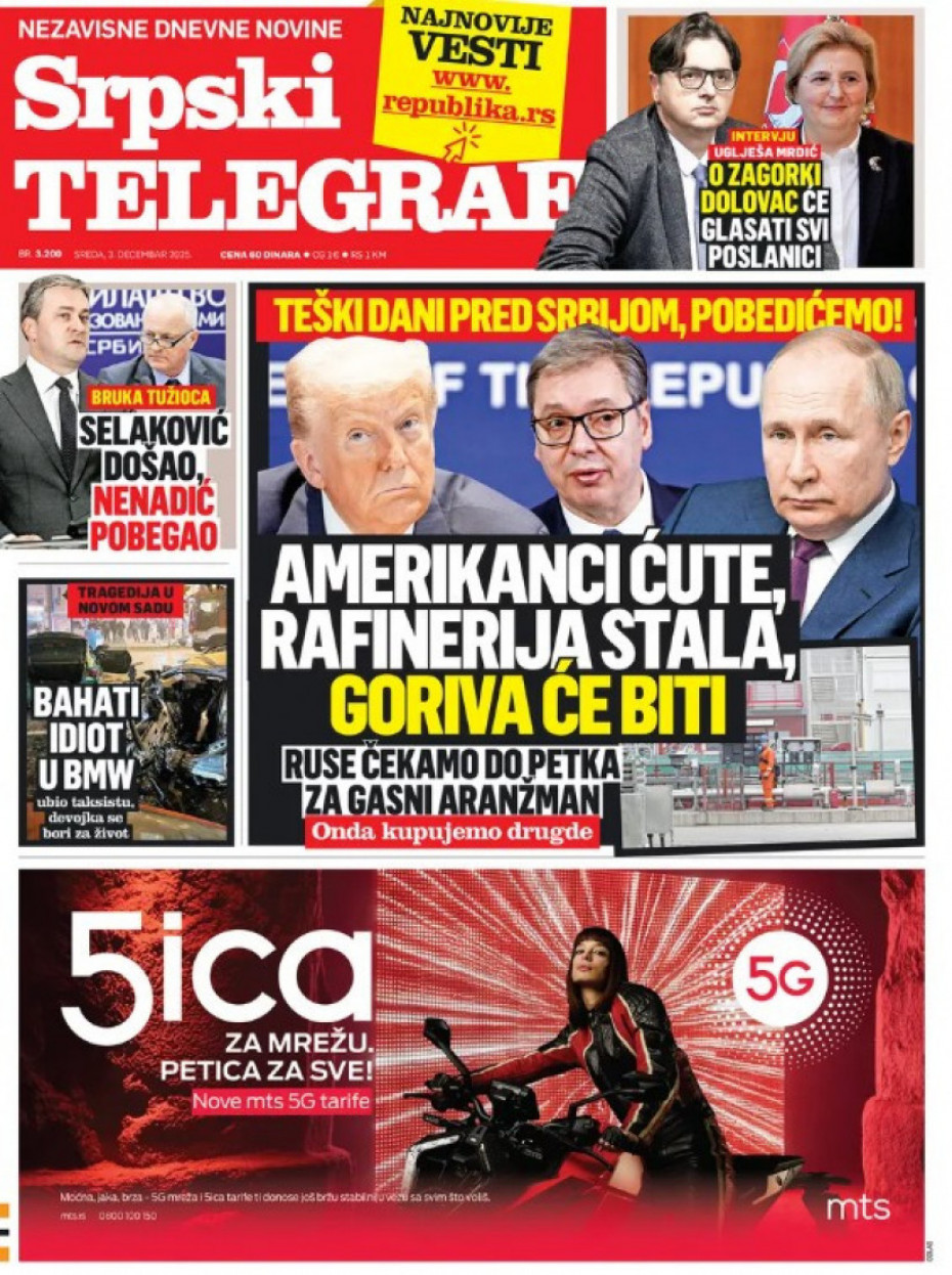 Pogledajte šta na naslovnim stranama donose dnevne novine u Srbiji u izdanju za sredu, 3. decembar