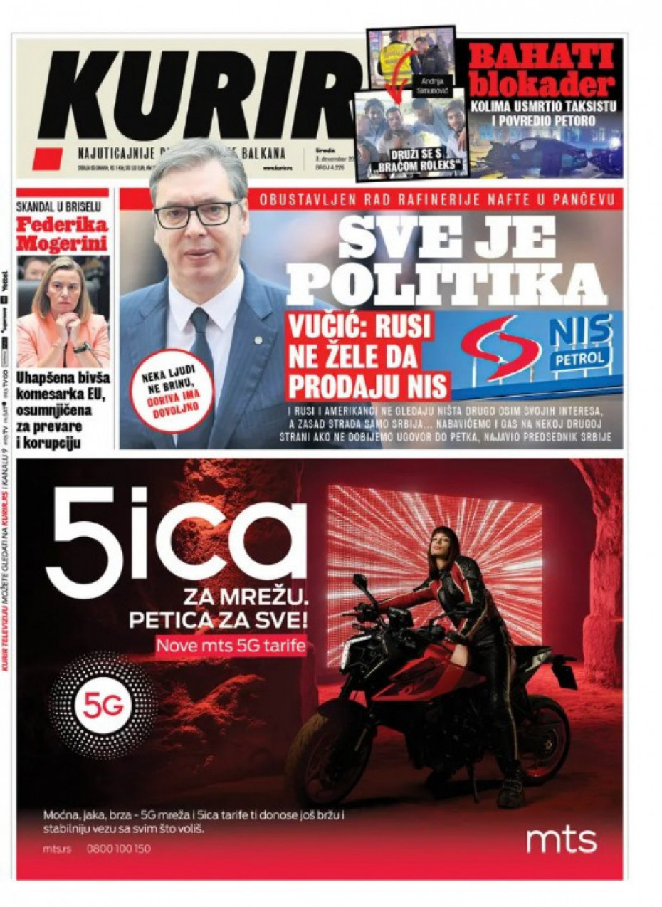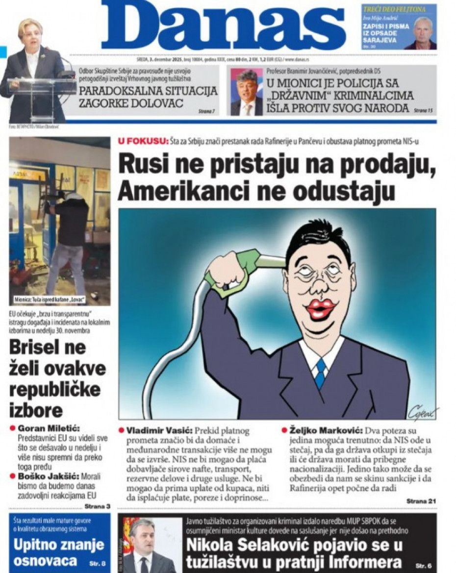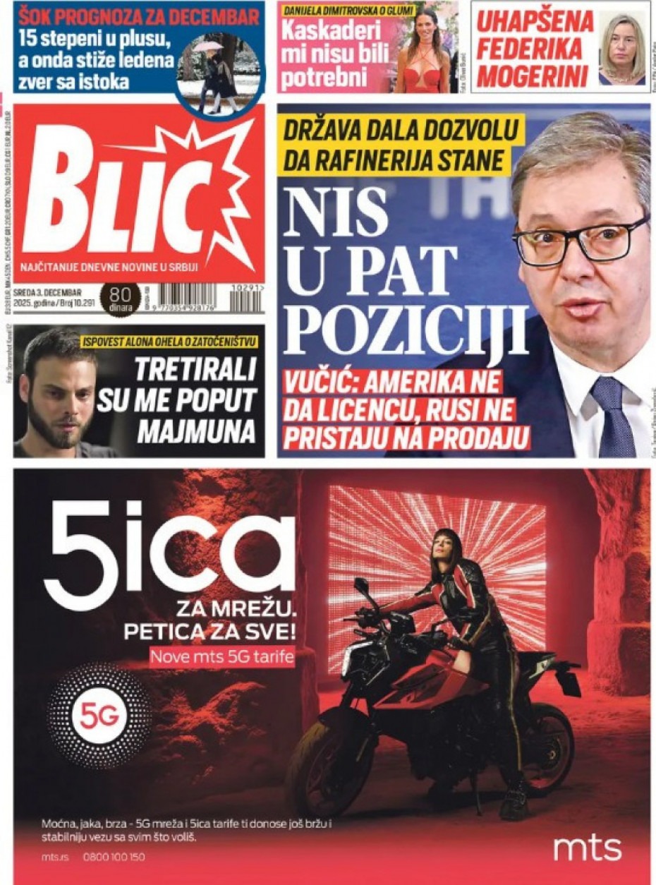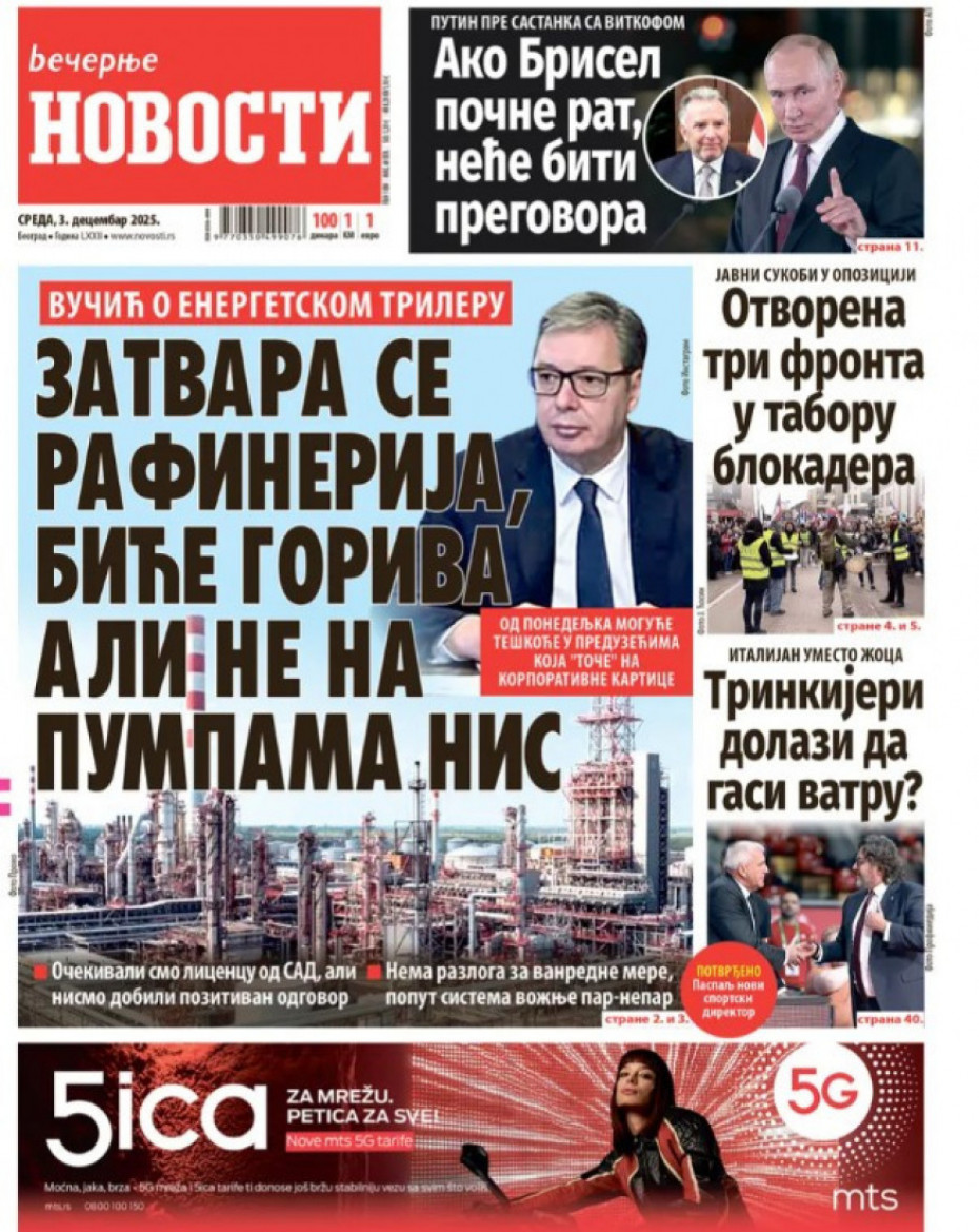 Naslovne strane dnevne štampe za sredu, 3. decembar