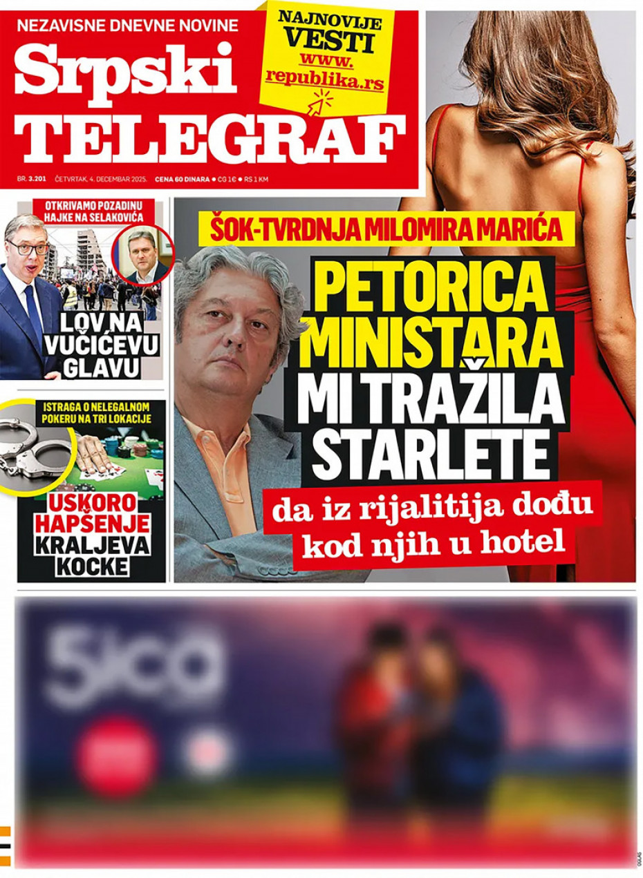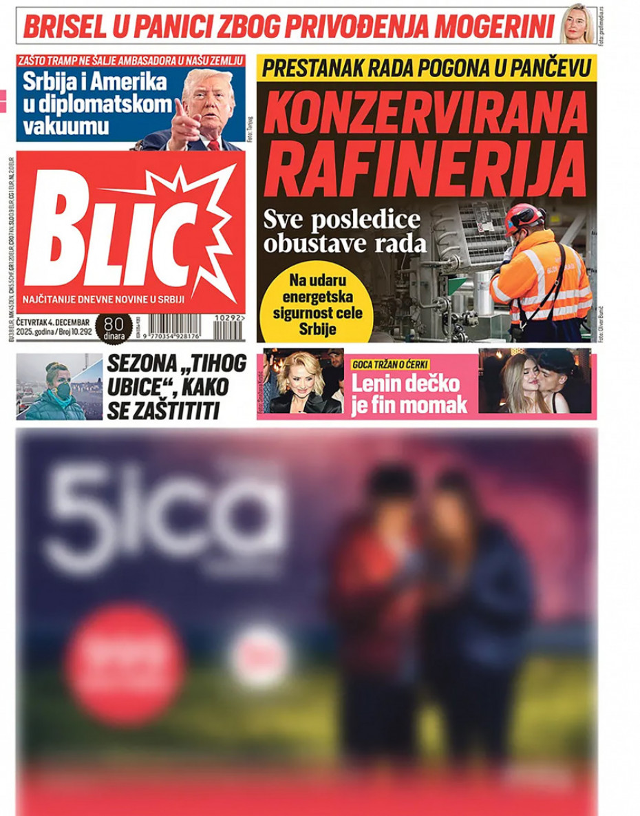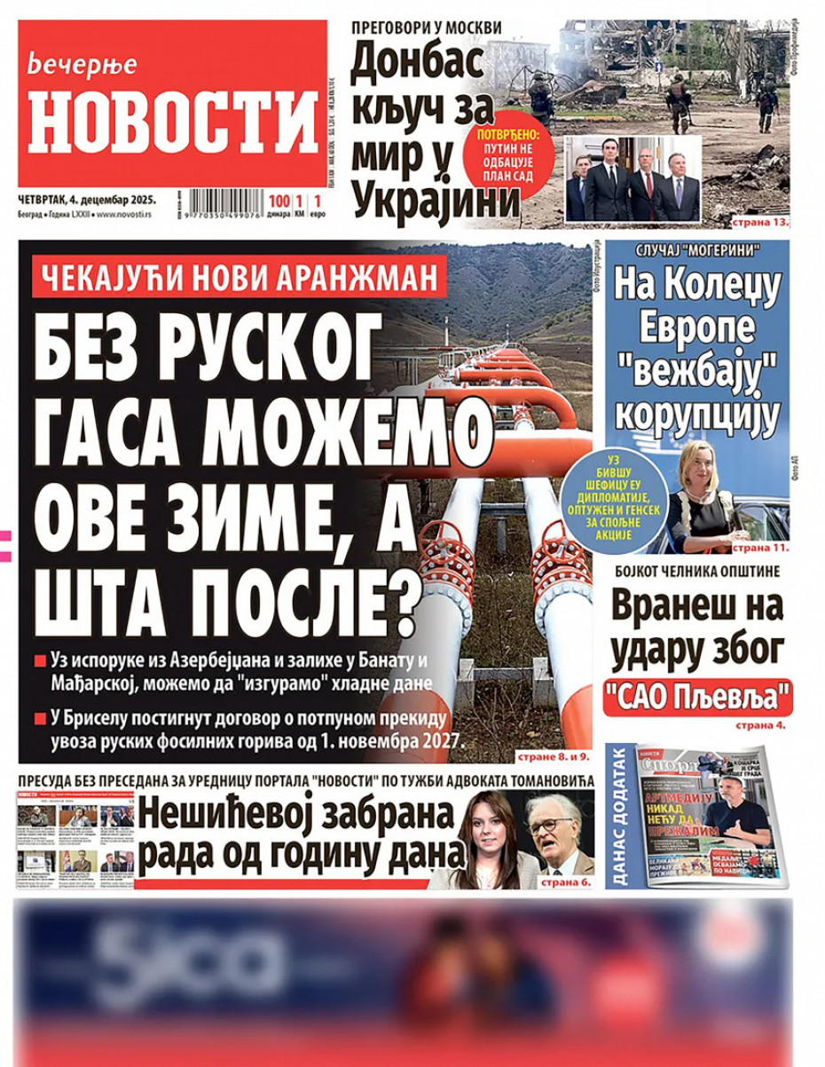 Pogledajte šta na naslovnim stranama donose dnevne novine u Srbiji u izdanju za četvrtak, 4. decembar