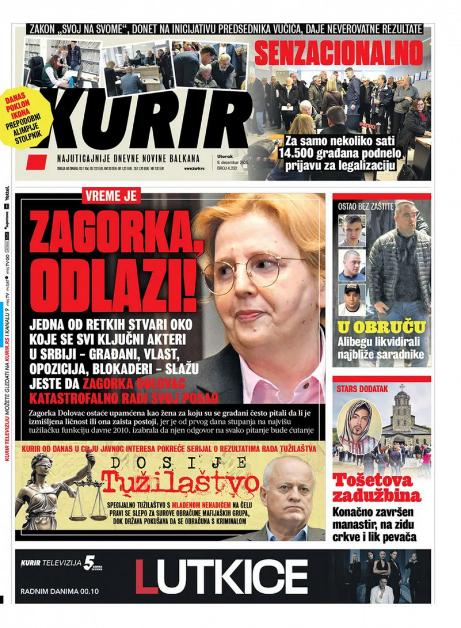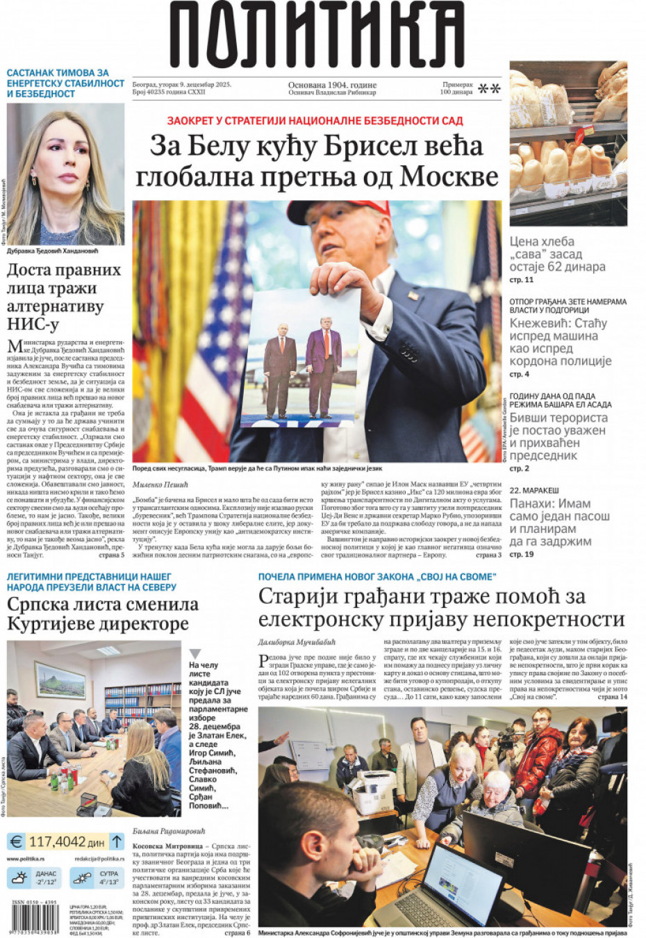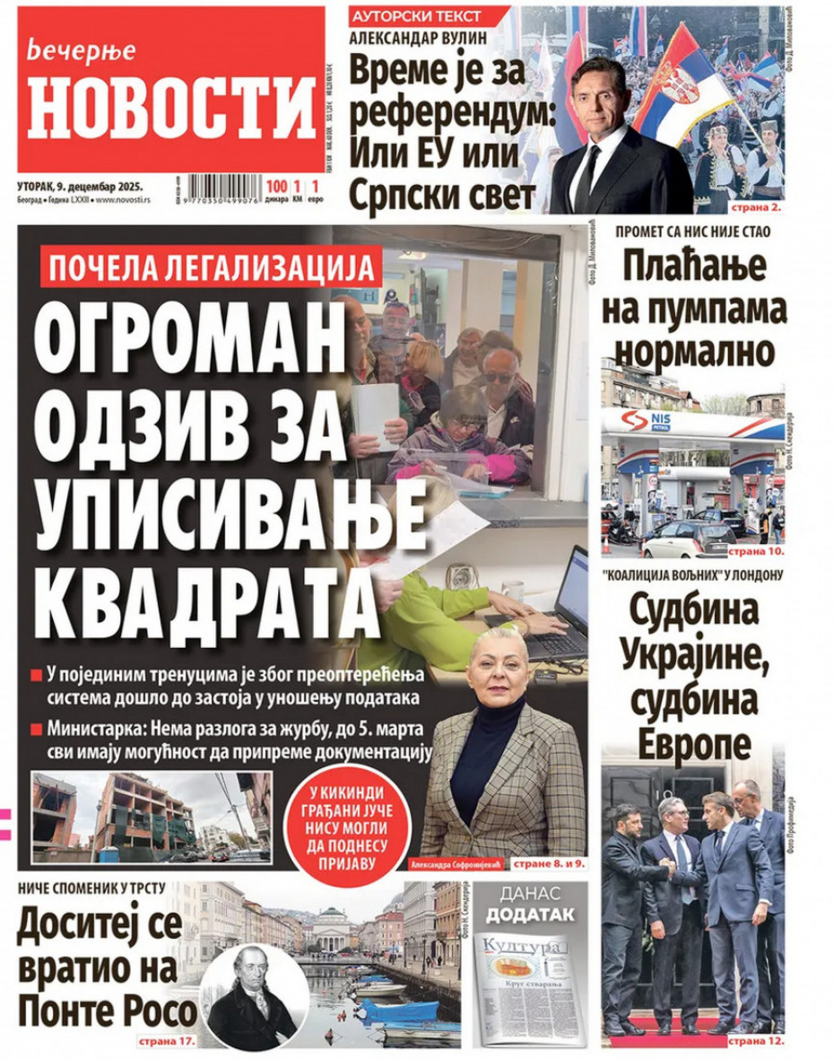 Pogledajte šta na naslovnim stranama donose dnevne novine u Srbiji u izdanju za utorak, 9. decembar