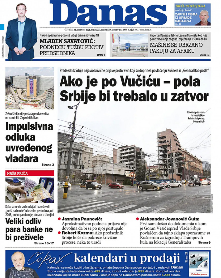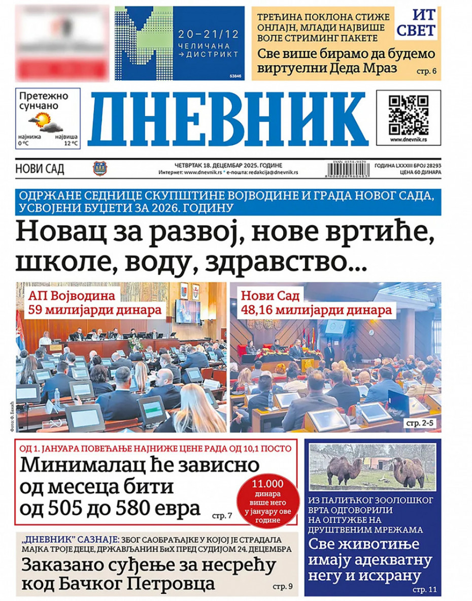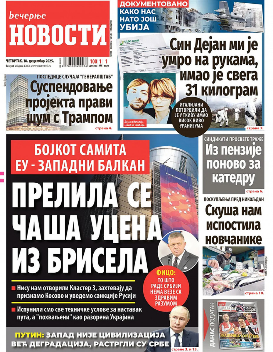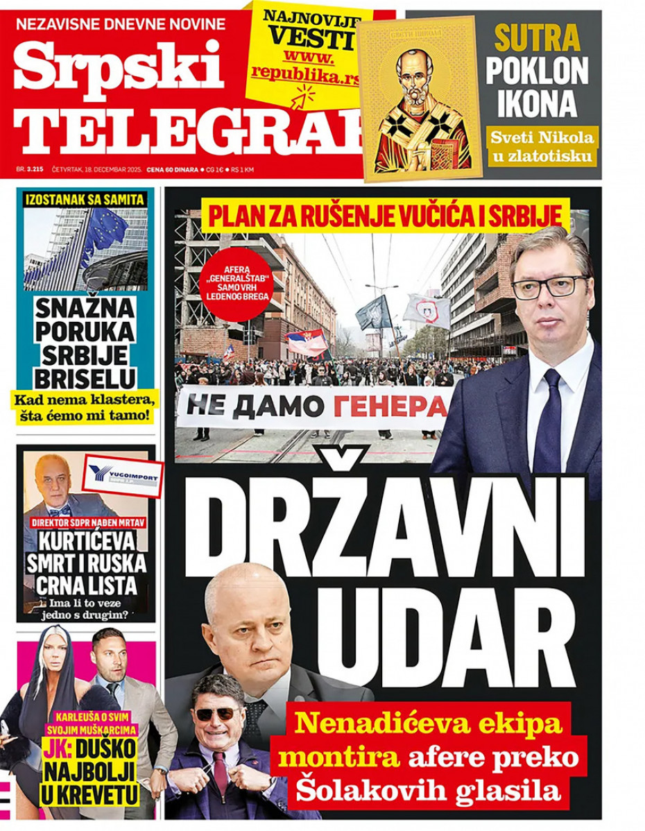 Pogledajte šta na naslovnim stranama donose dnevne novine u Srbiji u izdanju za četvrtak, 18. decembar.