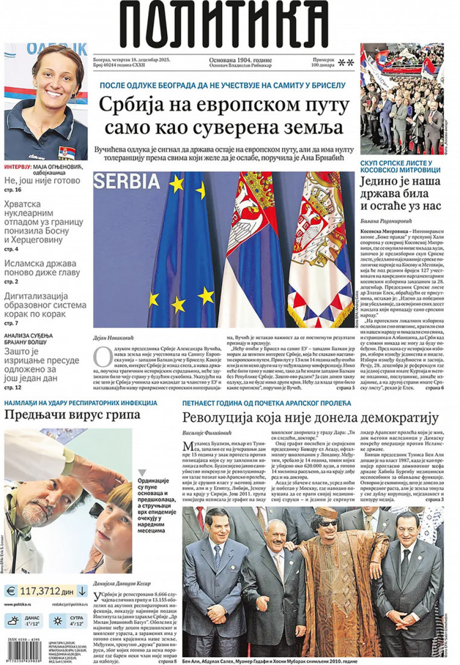 Naslovne strane dnevne štampe za četvrtak, 18. decembar