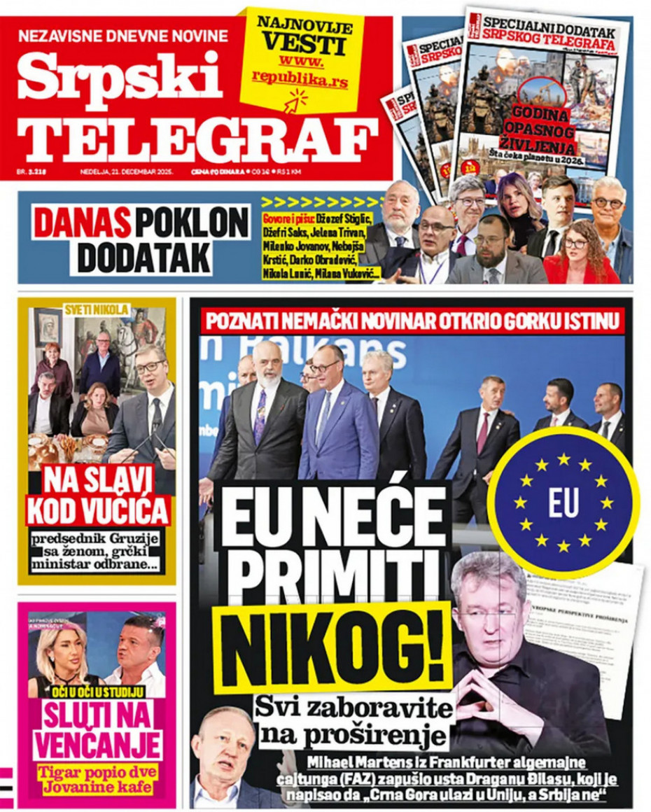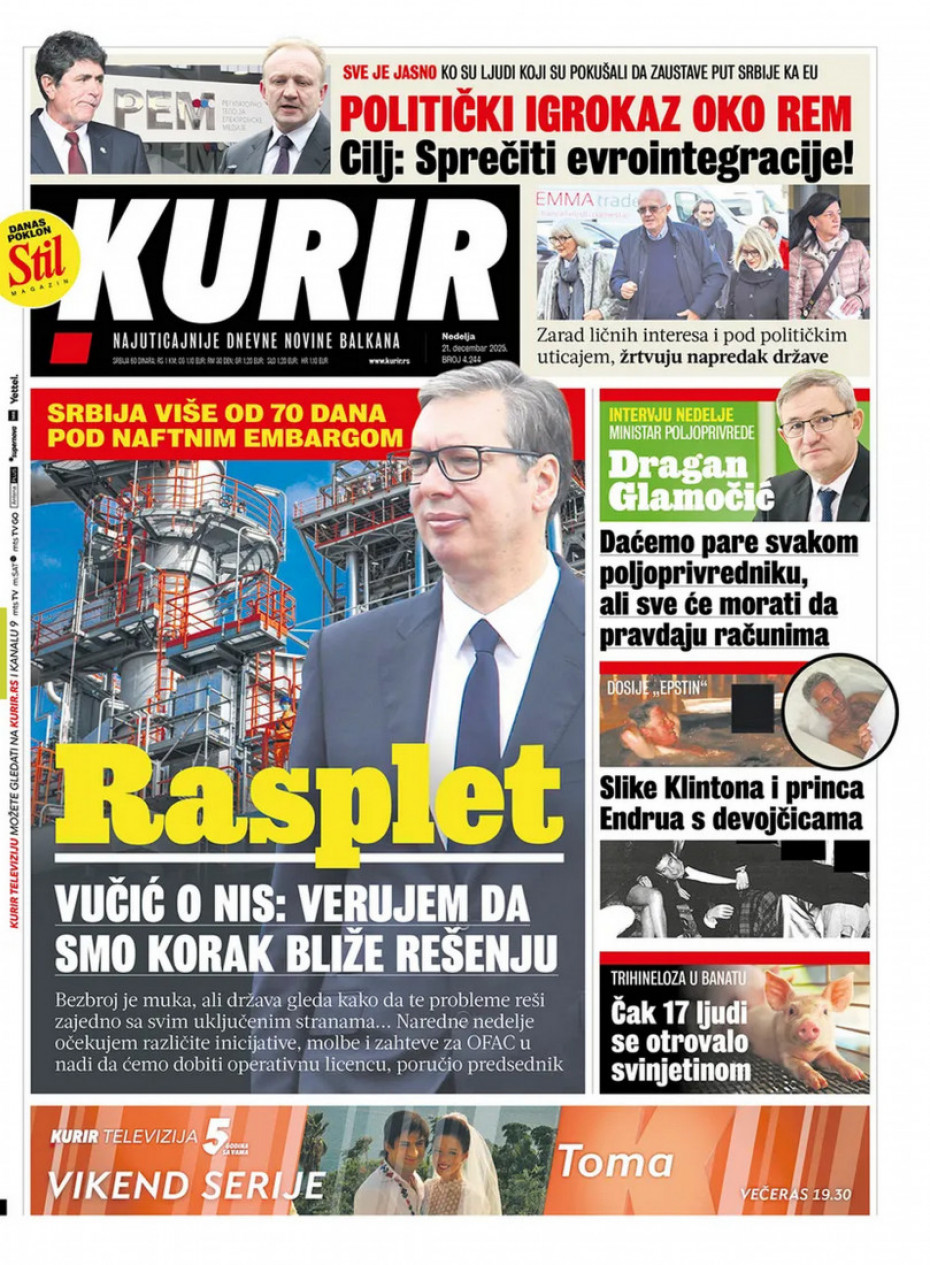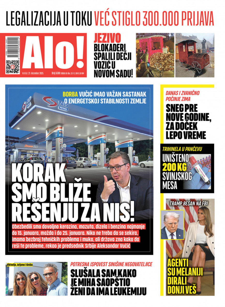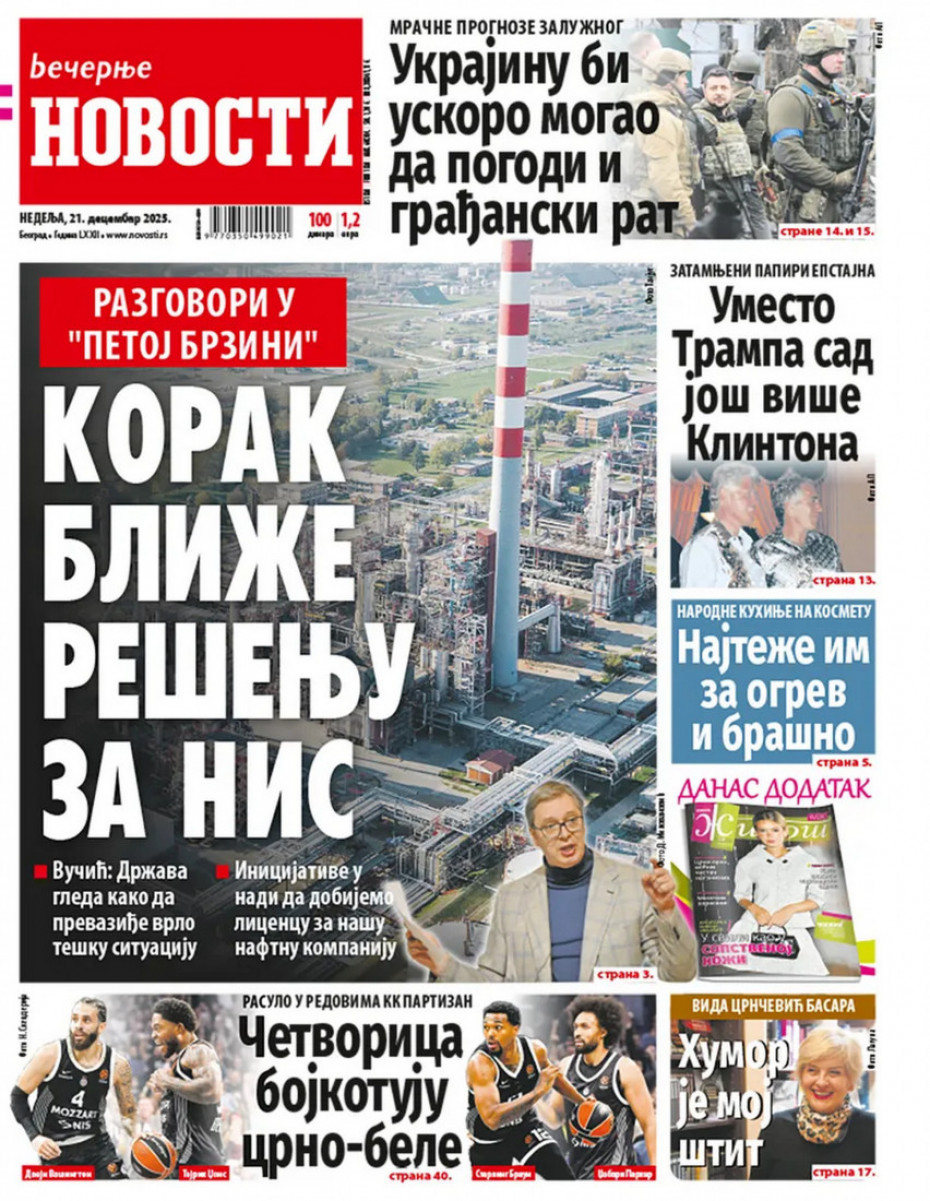 Naslovna Srbija Politika Politika Naslovne strane dnevne štampe za nedelju, 21. decembar Komentari Profimedia, Logo - Copyright Profimedia, Logo Autor: Euronews Srbija 20/12/2025 - 20:20 Podeli veličina teksta Aa Aa Pogledajte šta na naslovnim stranama donose dnevne novine u Srbiji u izdanju za nedelju, 21. decembar. Promo Pogledaj galeriju Promo Pogledaj galeriju Promo Pogledaj galeriju Promo Pogledaj galeriju Promo Pogledaj galeriju Promo Pogledaj galeriju Promo Pogledaj galeriju Promo Pogledaj galeriju Više o... Naslovne strane Dnevna štampa Dnevne novine Novine Top tagovi Euronews Montenegro Kosovo i Metohija Rat u Ukrajini Kriza na Bliskom istoku