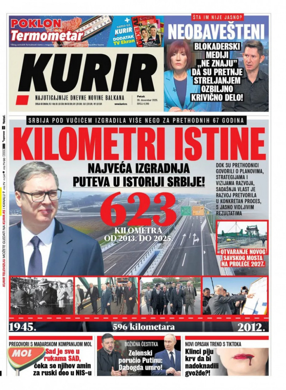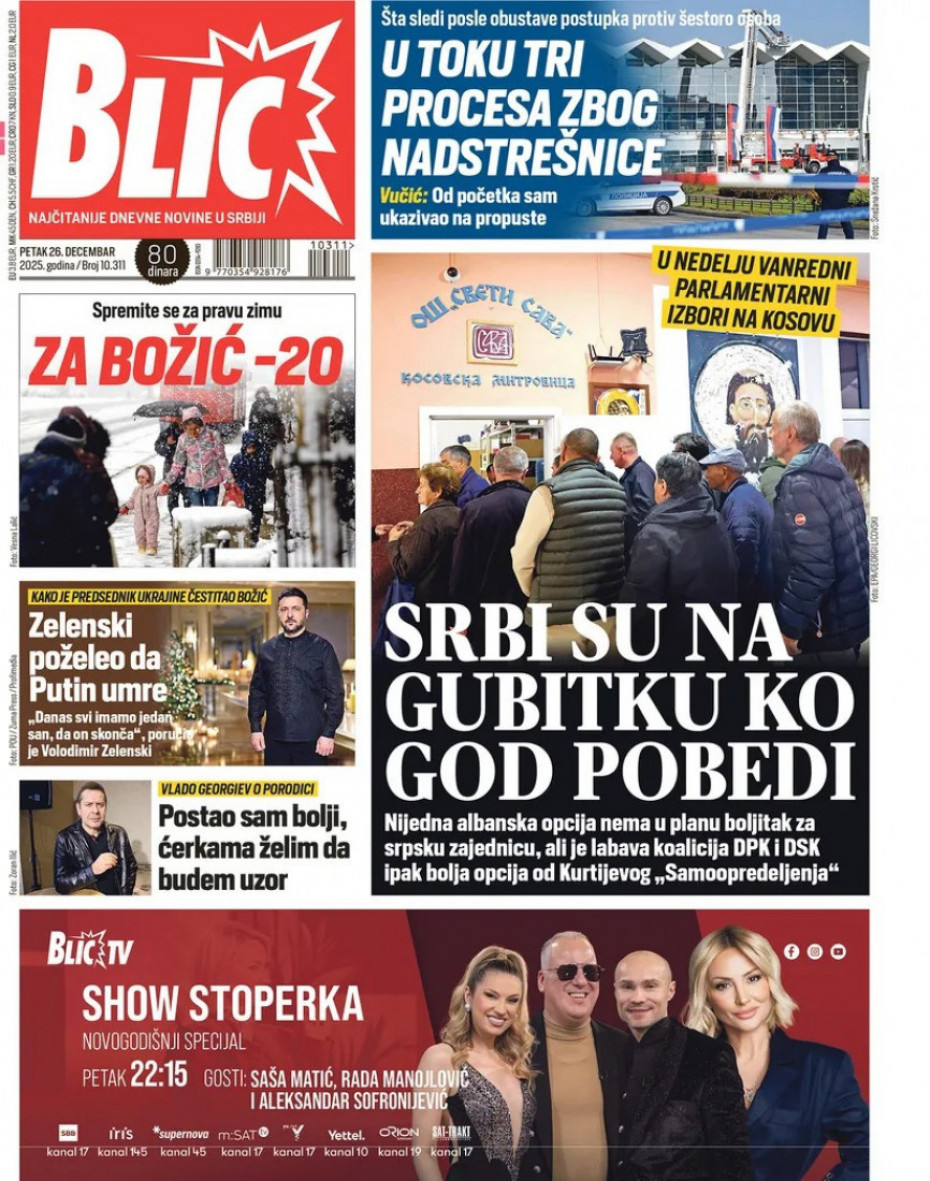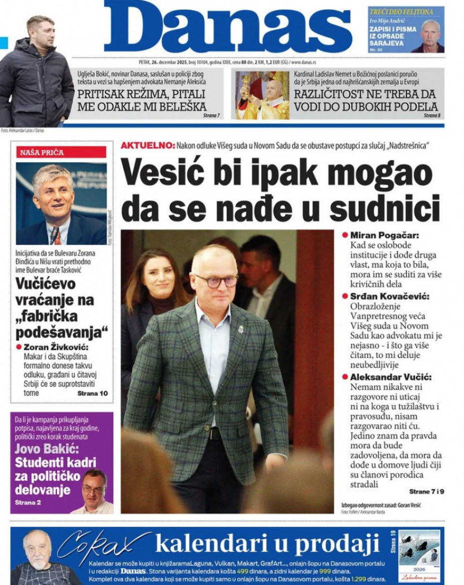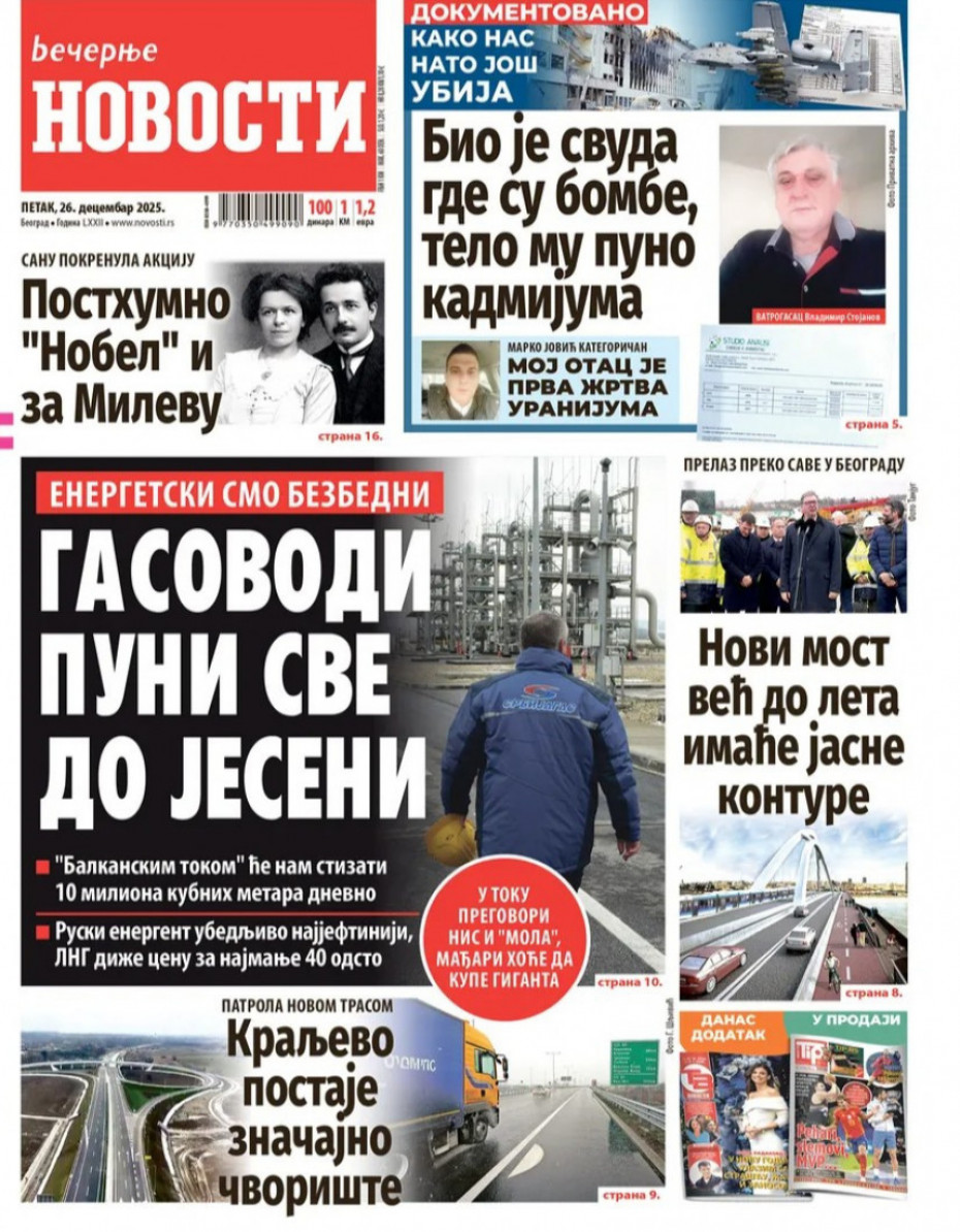 Pogledajte šta na naslovnim stranama donose dnevne novine u Srbiji u izdanju za petak, 26. decembar.