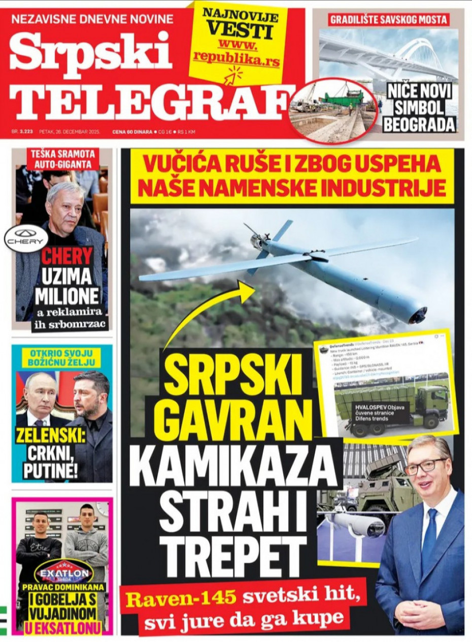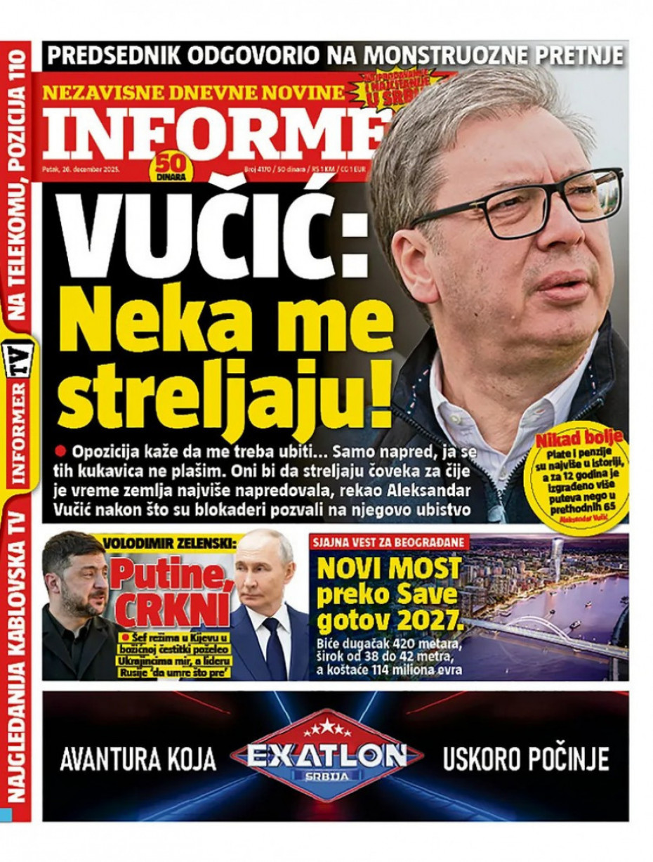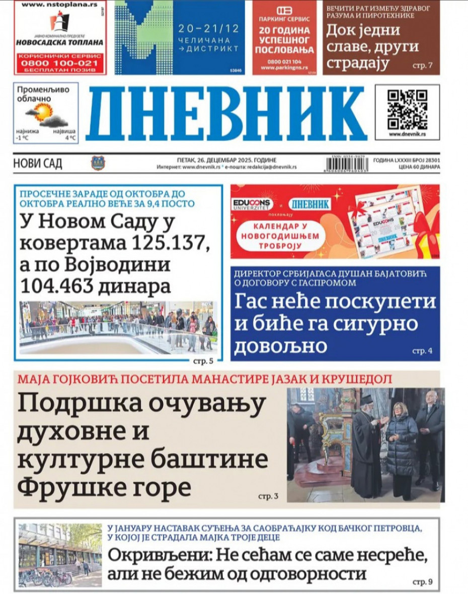 Pogledajte šta na naslovnim stranama donose dnevne novine u Srbiji u izdanju za petak, 26. decembar.