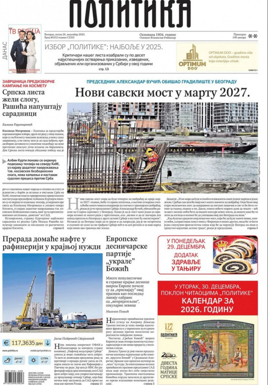 Naslovne strane dnevne štampe za petak, 26. decembar