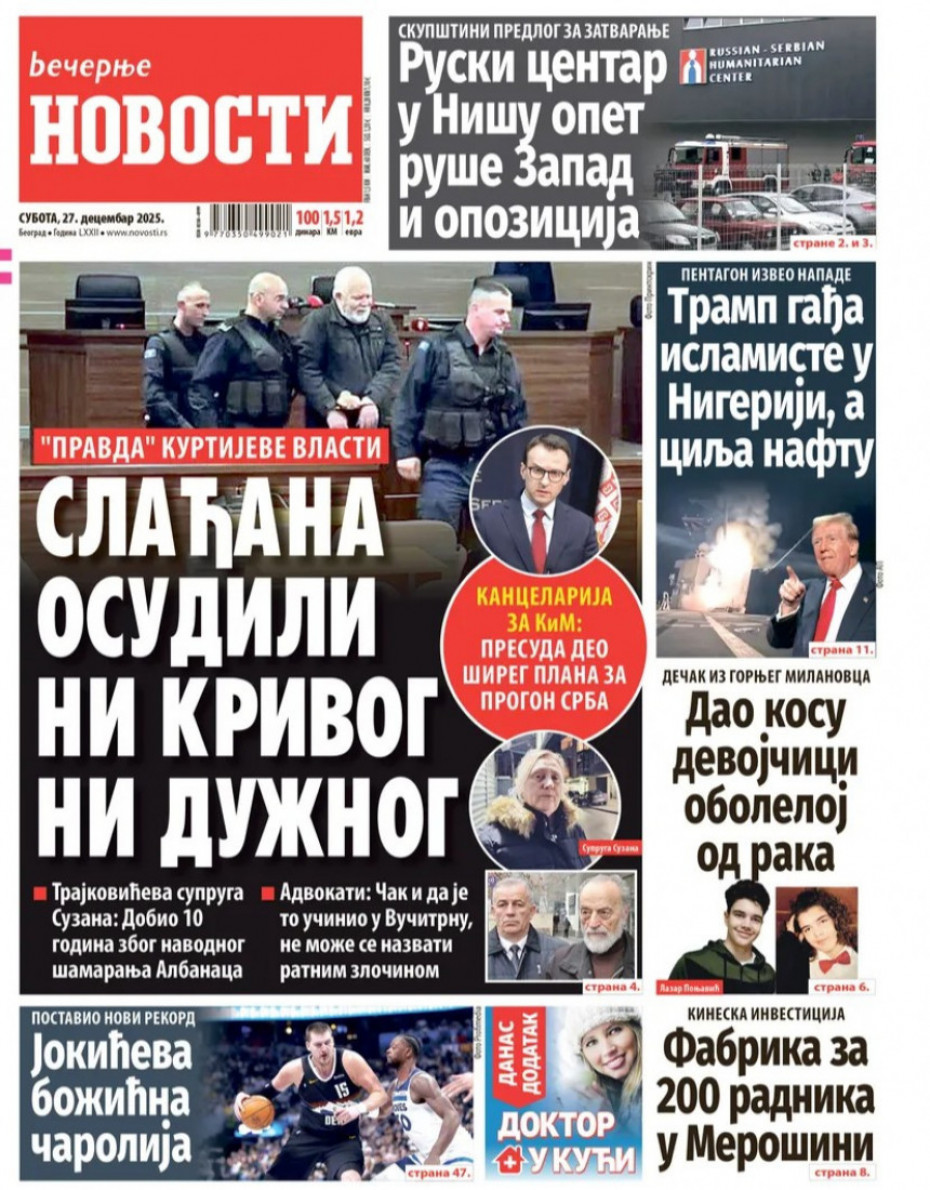 Naslovna Srbija Politika Politika Naslovne strane dnevne štampe za subotu, 27. decembar Komentari Naslovne strane dnevne štampe za subotu, 27. decembar - Copyright Profimedia, Logo Autor: Euronews Srbija 26/12/2025 - 20:40 Podeli veličina teksta Aa Aa Pogledajte šta na naslovnim stranama donose dnevne novine u Srbiji u izdanju za subotu, 27. decembar. Promo Pogledaj galeriju Promo Pogledaj galeriju Promo Pogledaj galeriju Promo Pogledaj galeriju Promo Pogledaj galeriju Promo Pogledaj galeriju Promo Pogledaj galeriju Promo Pogledaj galeriju Promo Pogledaj galeriju Više o... Naslovne strane Dnevna štampa Novine Naslovne strane sutrašnjih novina Top tagovi Euronews Montenegro Kosovo i Metohija Rat u Ukrajini Kriza na Bliskom istoku