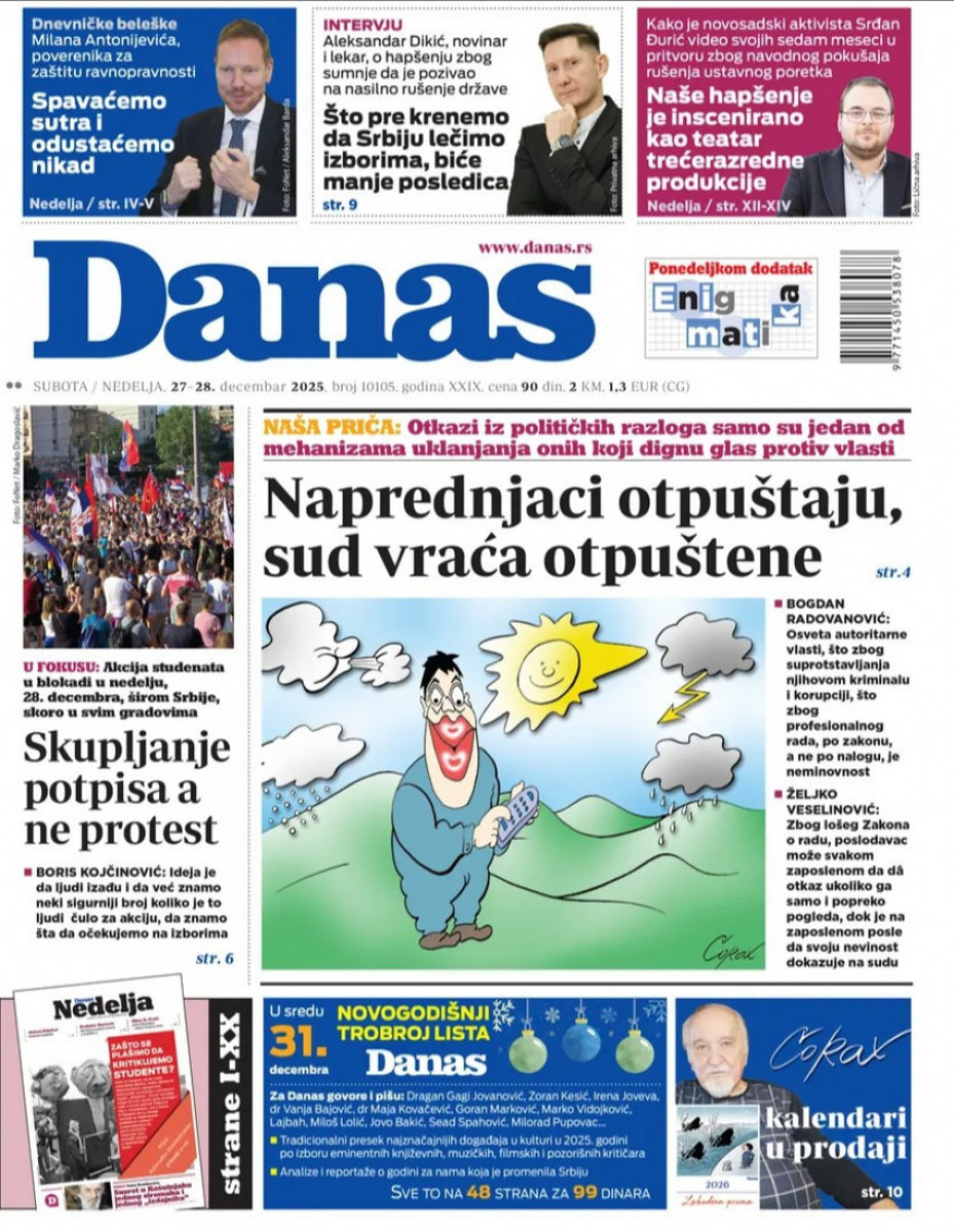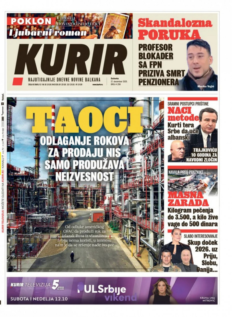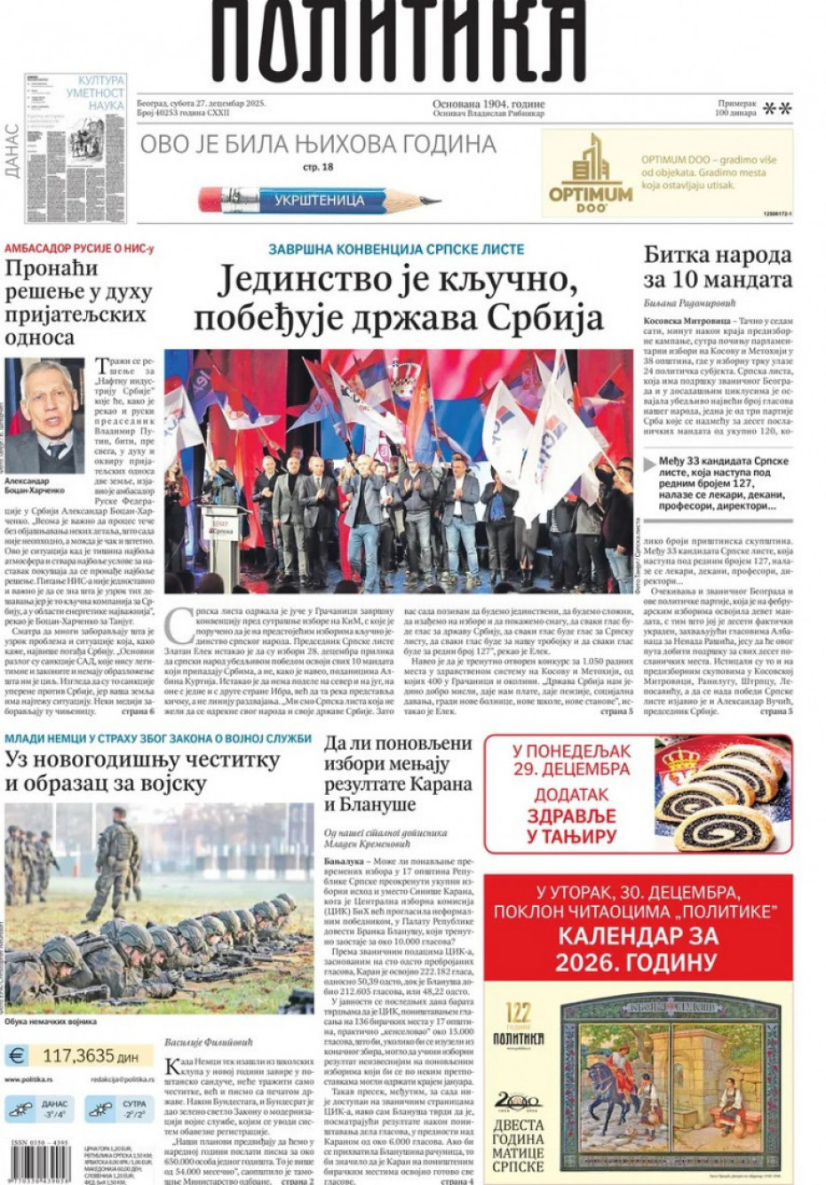 Politika Naslovne strane dnevne štampe za subotu, 27. decembar Pogledajte šta na naslovnim stranama donose dnevne novine u Srbiji u izdanju za subotu, 27. decembar. 26/12/2025 20:40 https://www.euronews.rs/srbija/politika/203206/naslovne-strane-novina-u-srbiji-za-27-decembar/vest pročitaj celu vest