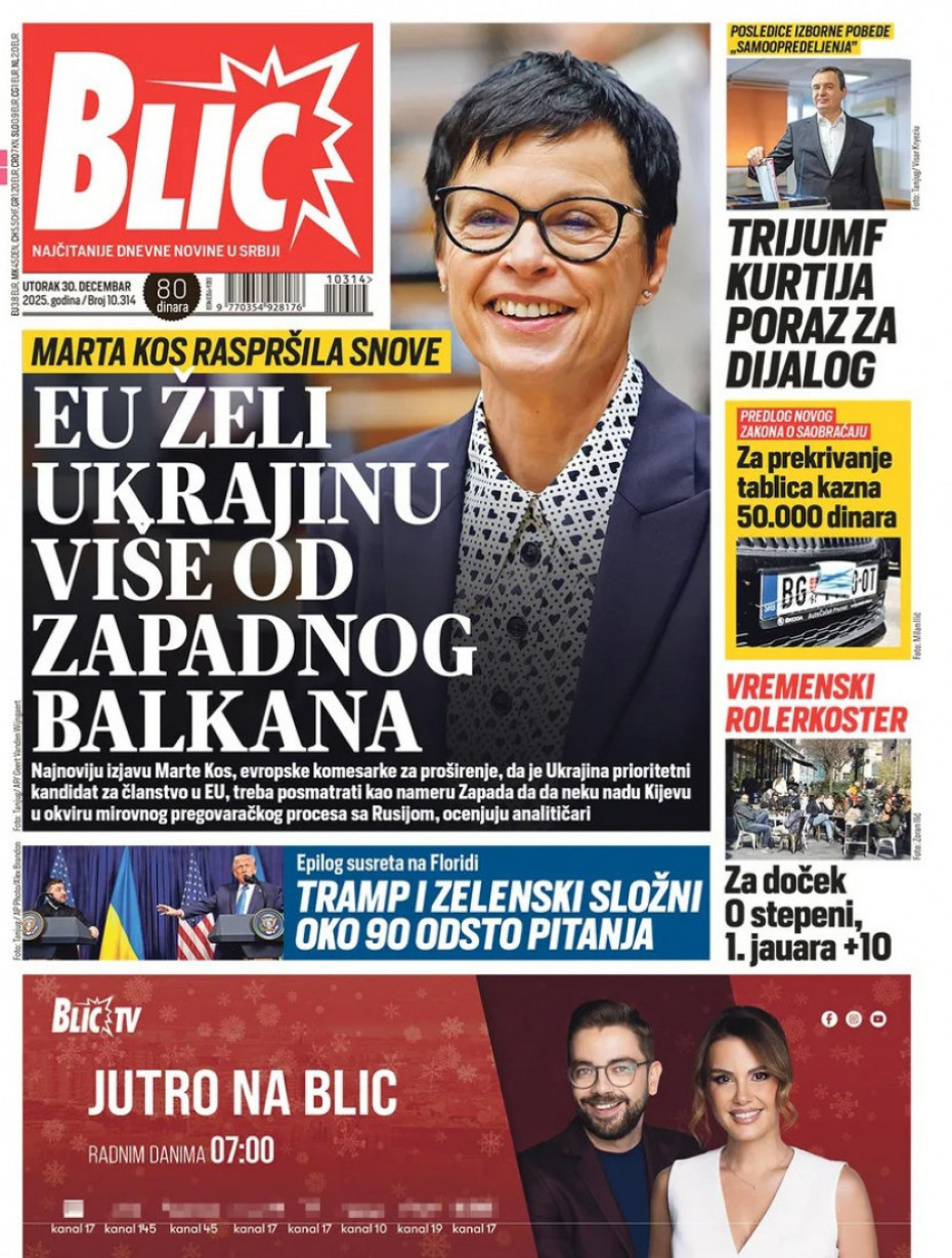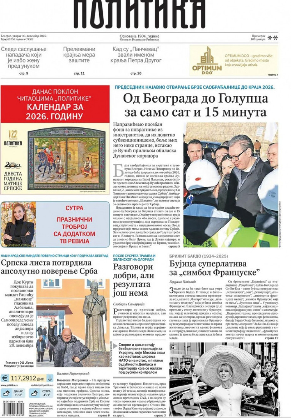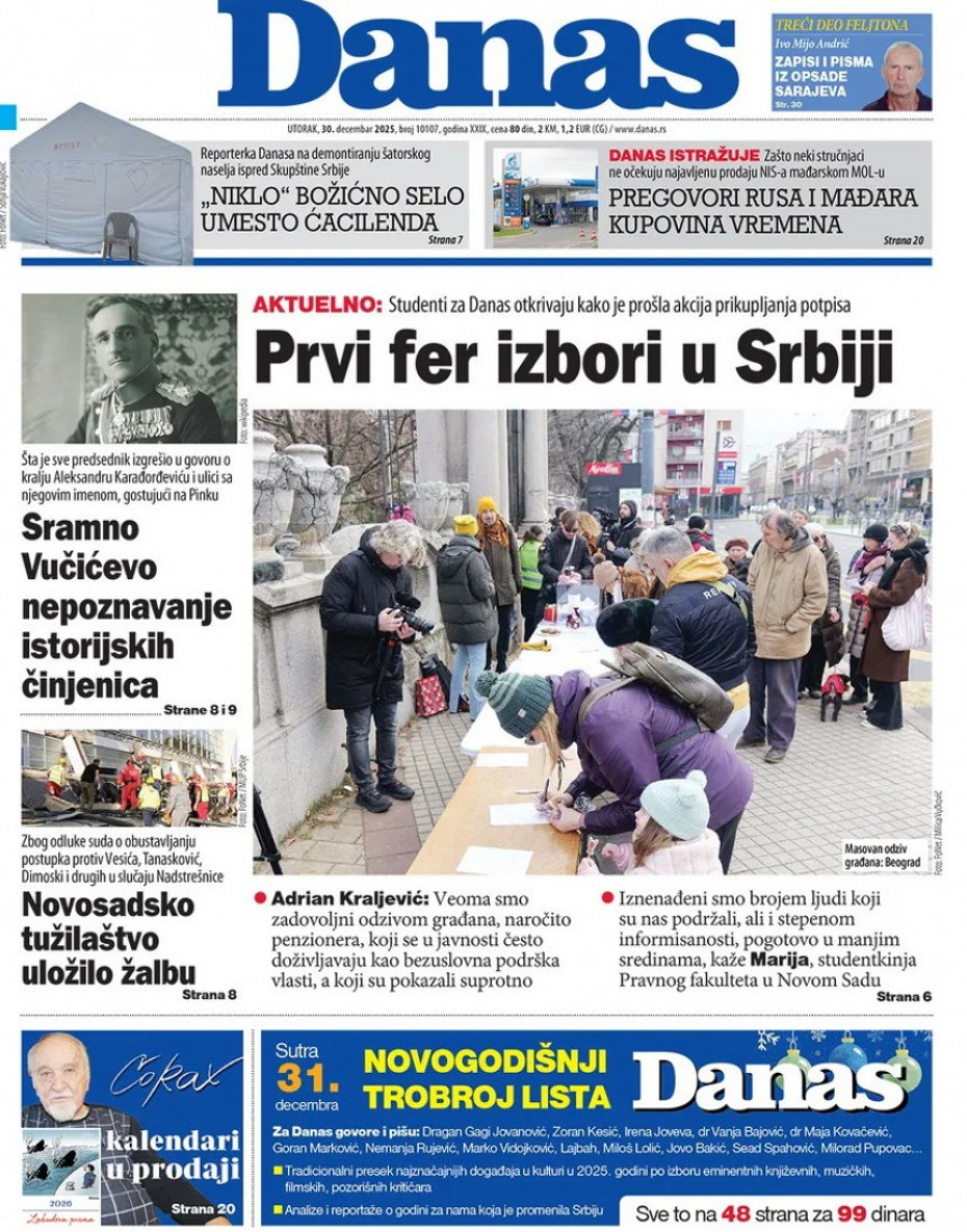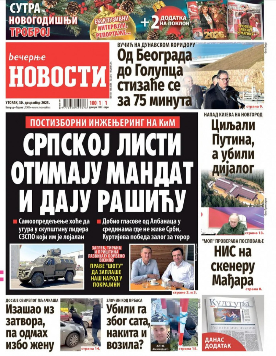 Naslovne strane dnevne štampe za utorak, 30. decembar