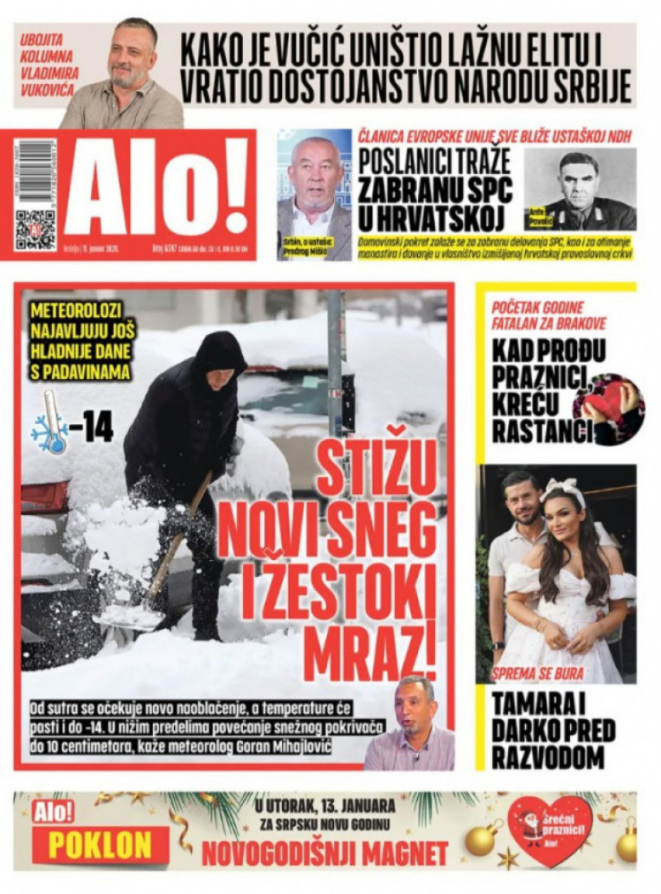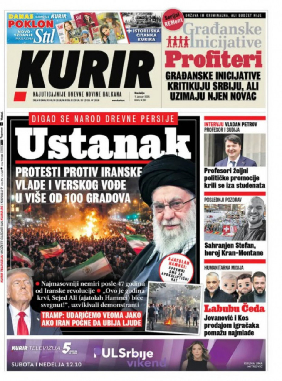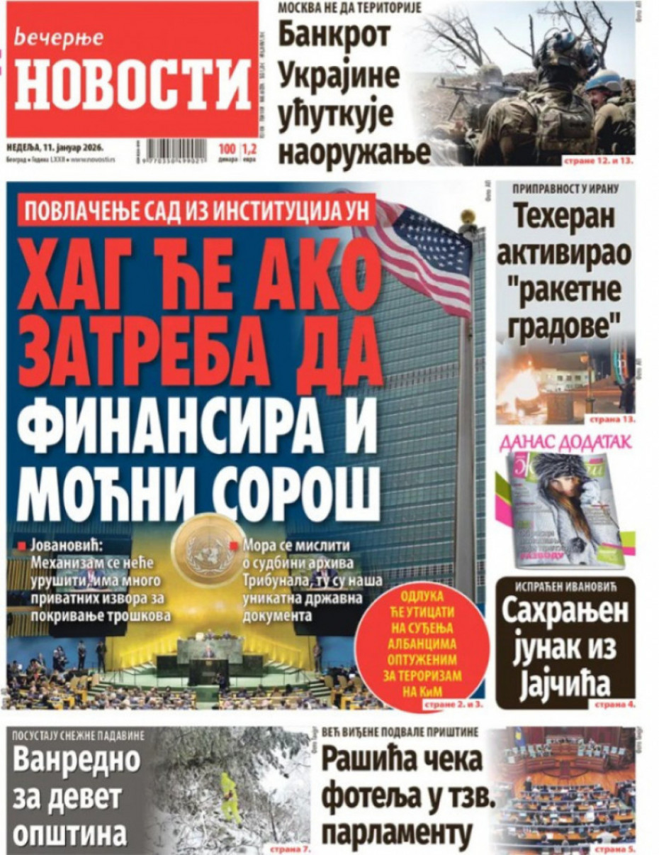 Naslovna Srbija Politika Politika Naslovne strane dnevne štampe za nedelju, 11. januar Komentari Naslovne strane dnevne štampe za nedelju, 11. januar - Copyright Profimedia, Logo Autor: Euronews Srbija 10/01/2026 - 21:10 Podeli veličina teksta Aa Aa Pogledajte šta na naslovnim stranama donose dnevne novine u Srbiji u izdanju za nedelju, 11. januar. Euronews Pogledaj galeriju Euronews Pogledaj galeriju Euronews Pogledaj galeriju Euronews Pogledaj galeriju Promo Pogledaj galeriju Euronews Pogledaj galeriju Više o... Naslovne strane Dnevne novine dnevne nvoine, 11. januar 2026. naslovne strane dnevnih novina za 11. januar 2026. Top tagovi Euronews Montenegro Kosovo i Metohija Rat u Ukrajini Kriza na Bliskom istoku