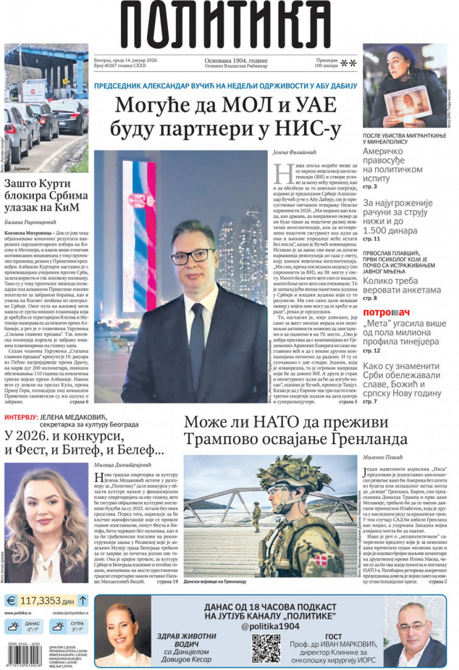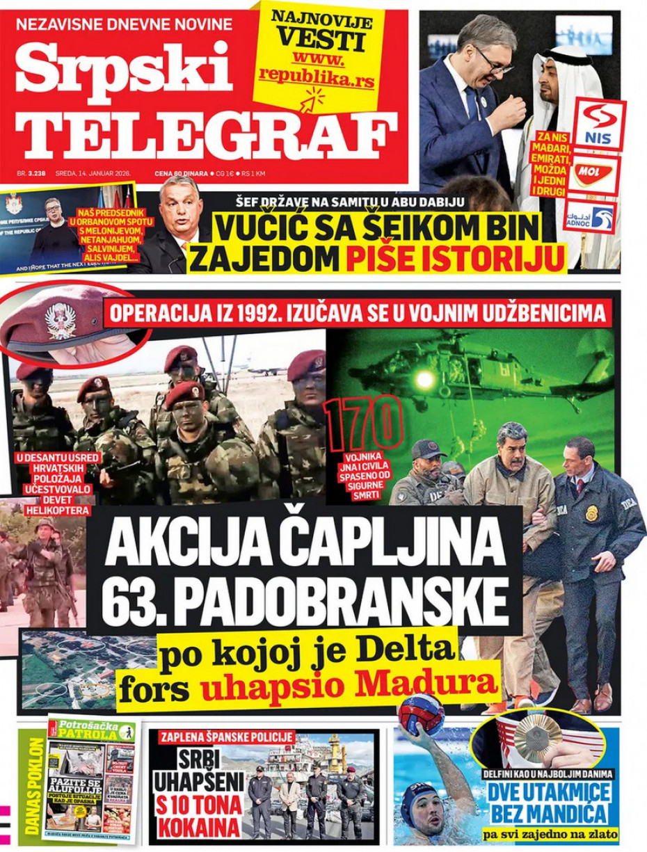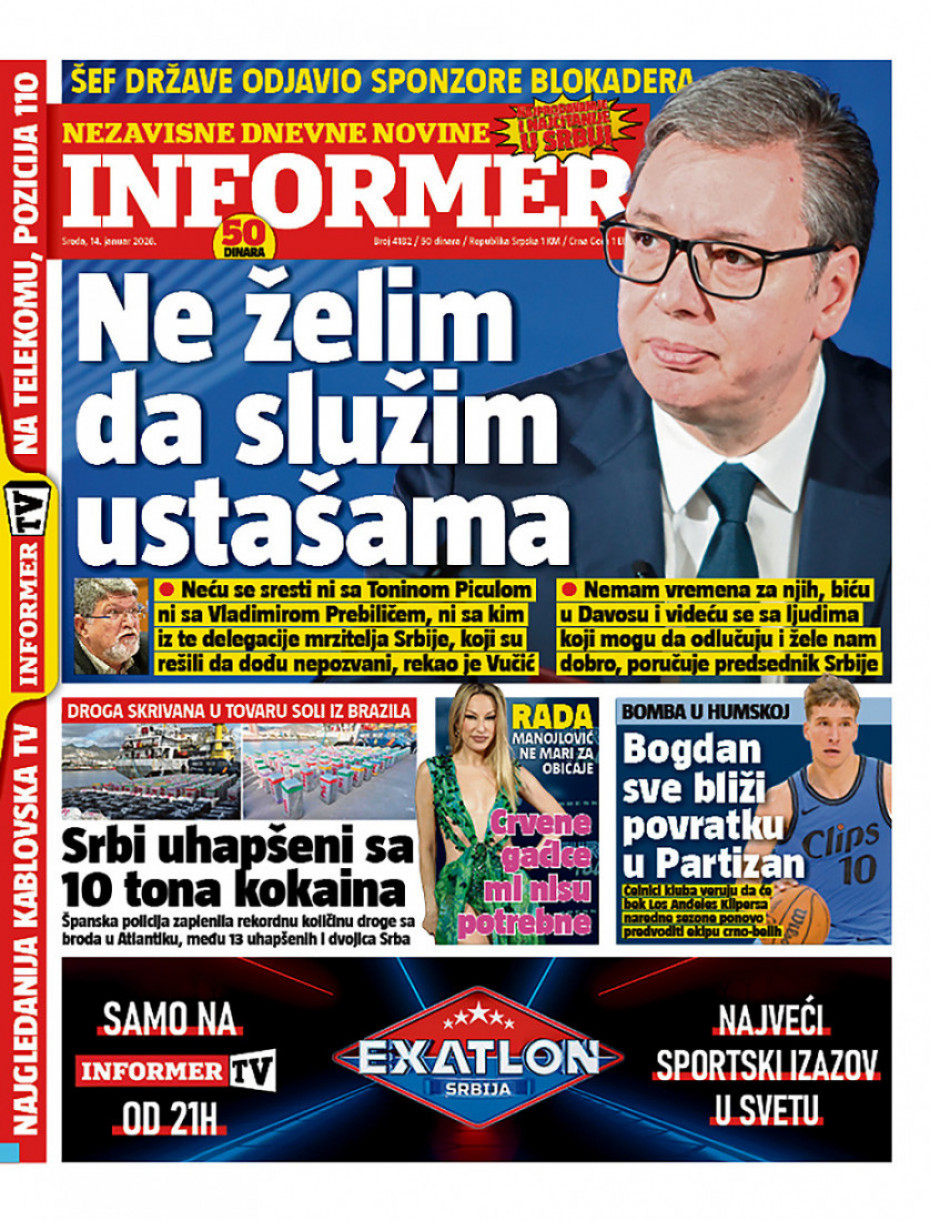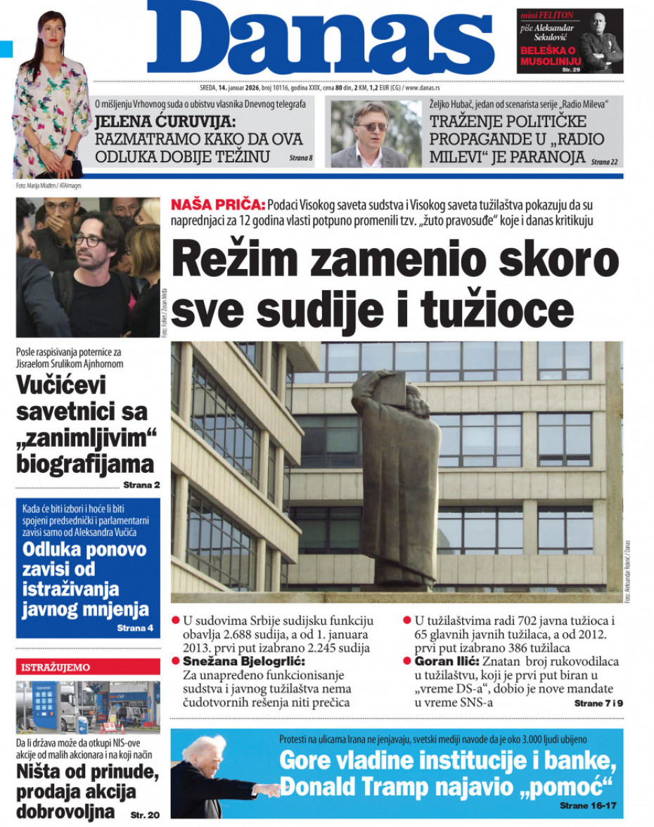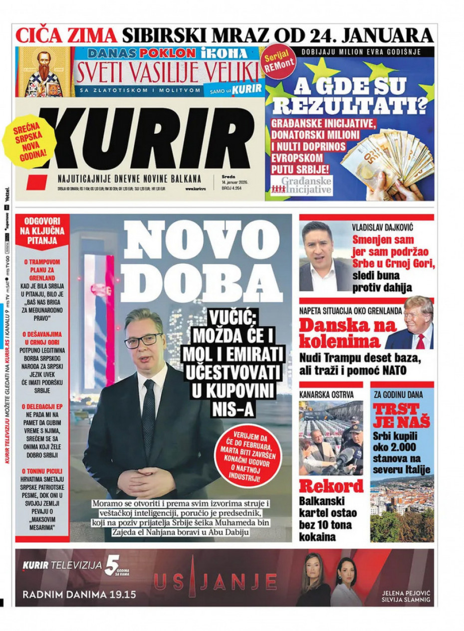 Naslovne strane dnevne štampe za sredu, 14. januar