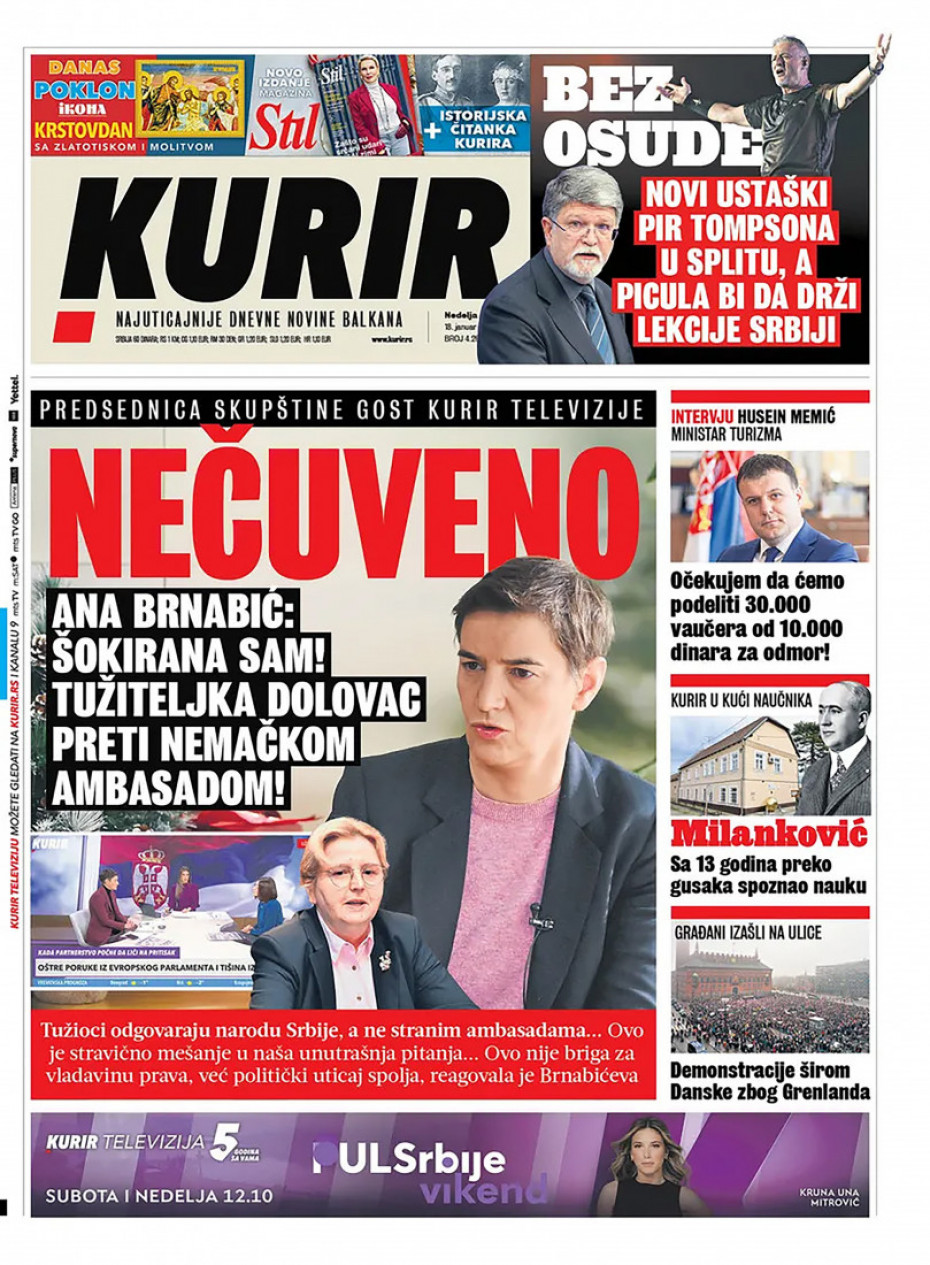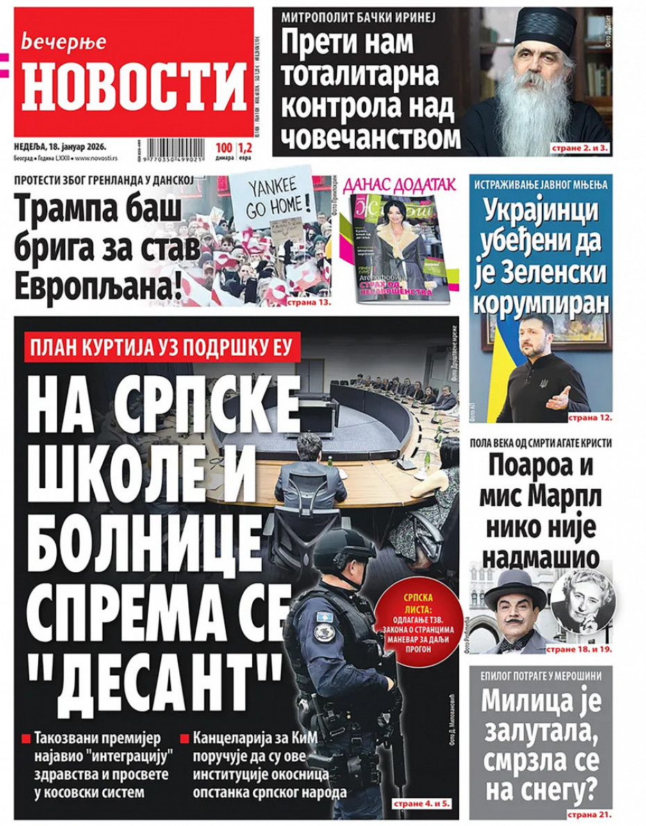 Naslovna Srbija Politika Politika Naslovne strane dnevne štampe za nedelju, 18. januar Komentari Naslovne strane dnevne štampe za nedelju, 18. januar - Copyright Profimedia, Logo Autor: Euronews Srbija 17/01/2026 - 20:19 Podeli veličina teksta Aa Aa Pogledajte šta na naslovnim stranama donose dnevne novine u Srbiji u izdanju za nedelju, 18. januar Promo Pogledaj galeriju Promo Pogledaj galeriju Promo Pogledaj galeriju Promo Pogledaj galeriju Promo Pogledaj galeriju Promo Pogledaj galeriju Promo Pogledaj galeriju Promo Pogledaj galeriju Više o... Dnevna štampa Naslovne strane Naslovne strane sutrašnjih novina Sutrašnje naslovnice Top tagovi Euronews Montenegro Kosovo i Metohija Rat u Ukrajini Kriza na Bliskom istoku