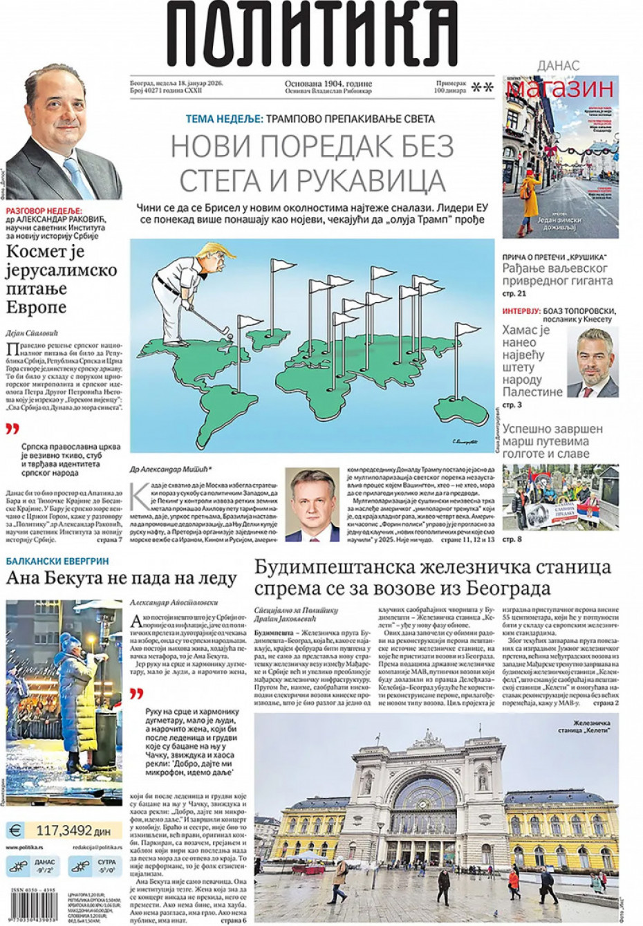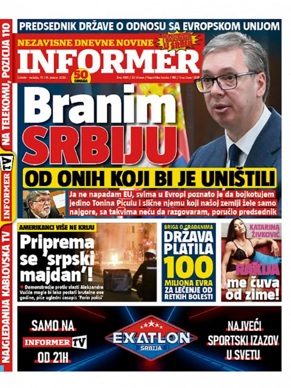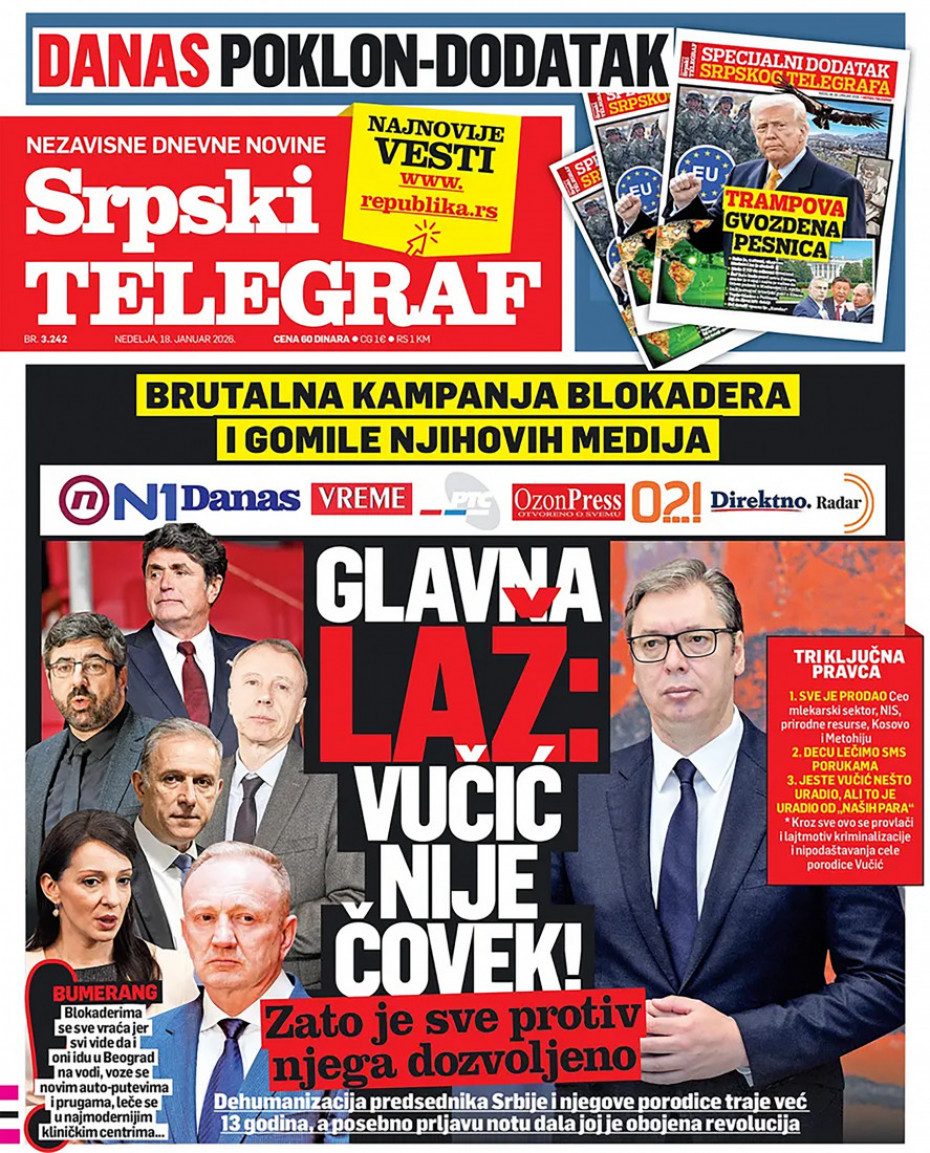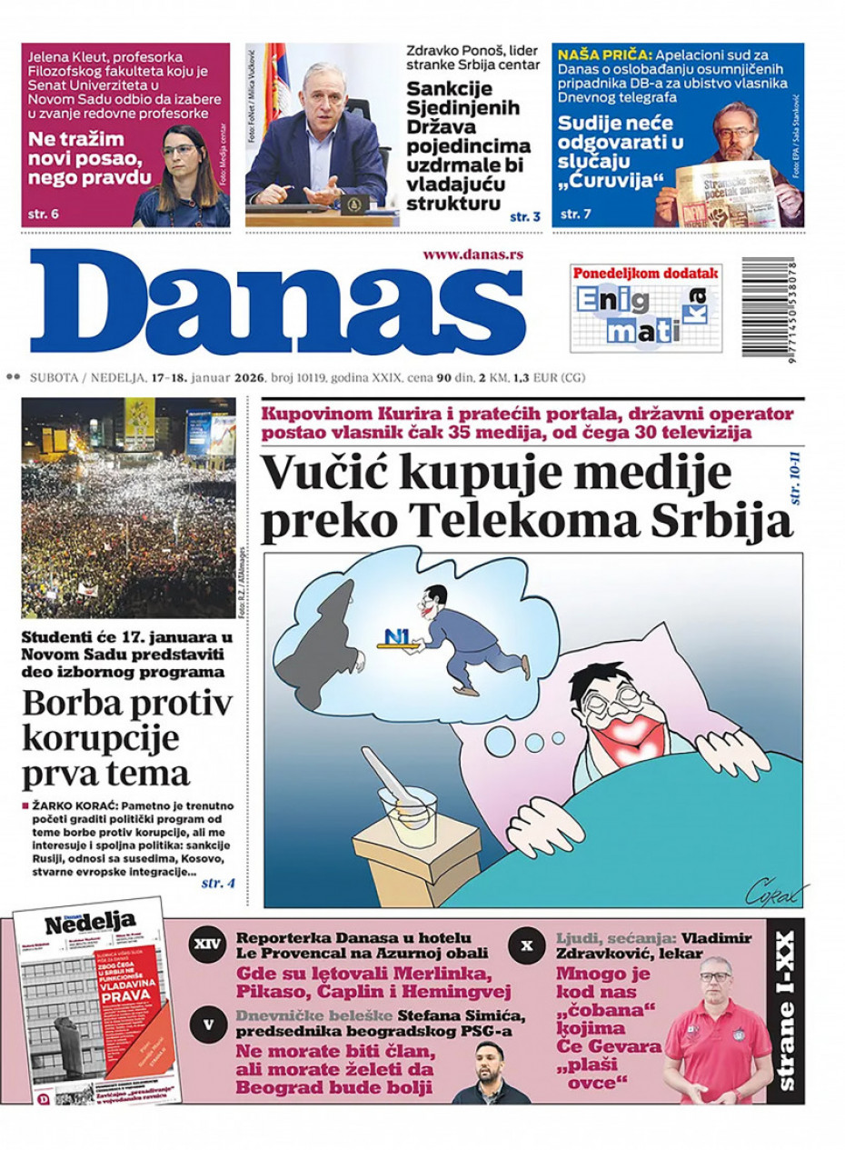 Politika Naslovne strane dnevne štampe za nedelju, 18. januar Pogledajte šta na naslovnim stranama donose dnevne novine u Srbiji u izdanju za nedelju, 18. januar 17/01/2026 20:19 https://www.euronews.rs/srbija/politika/206301/naslovne-strane-dnevne-stampe-za-nedelju-18-januar/vest pročitaj celu vest