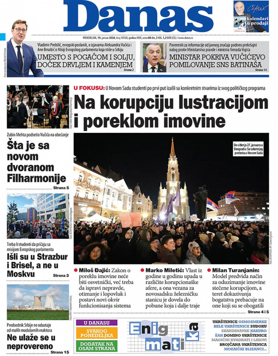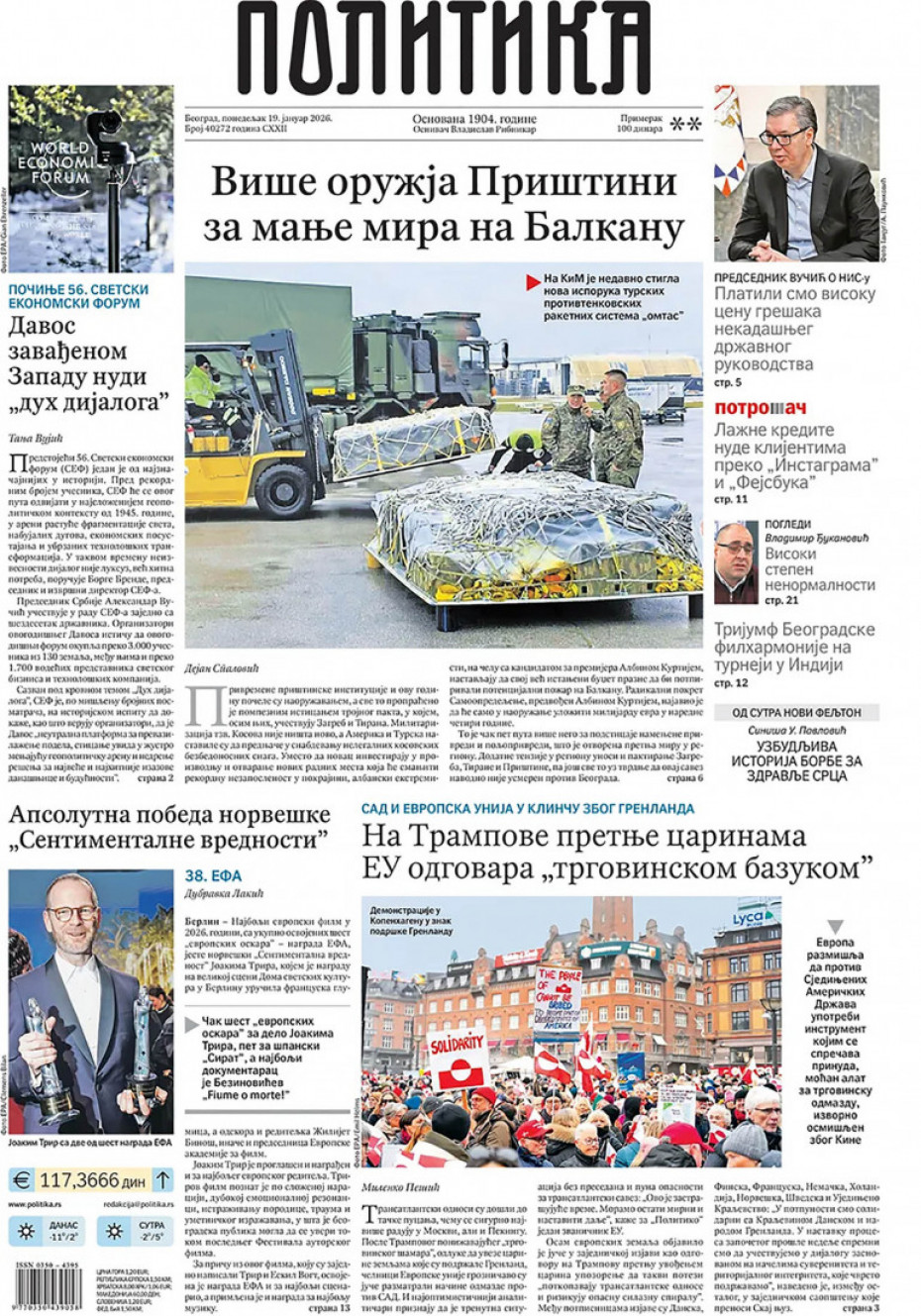 Naslovne strane dnevne štampe za ponedeljak, 19. januar