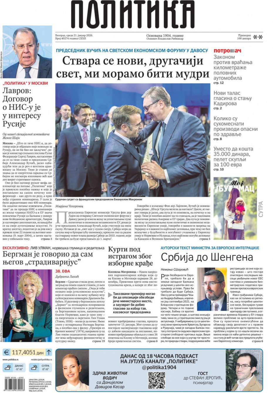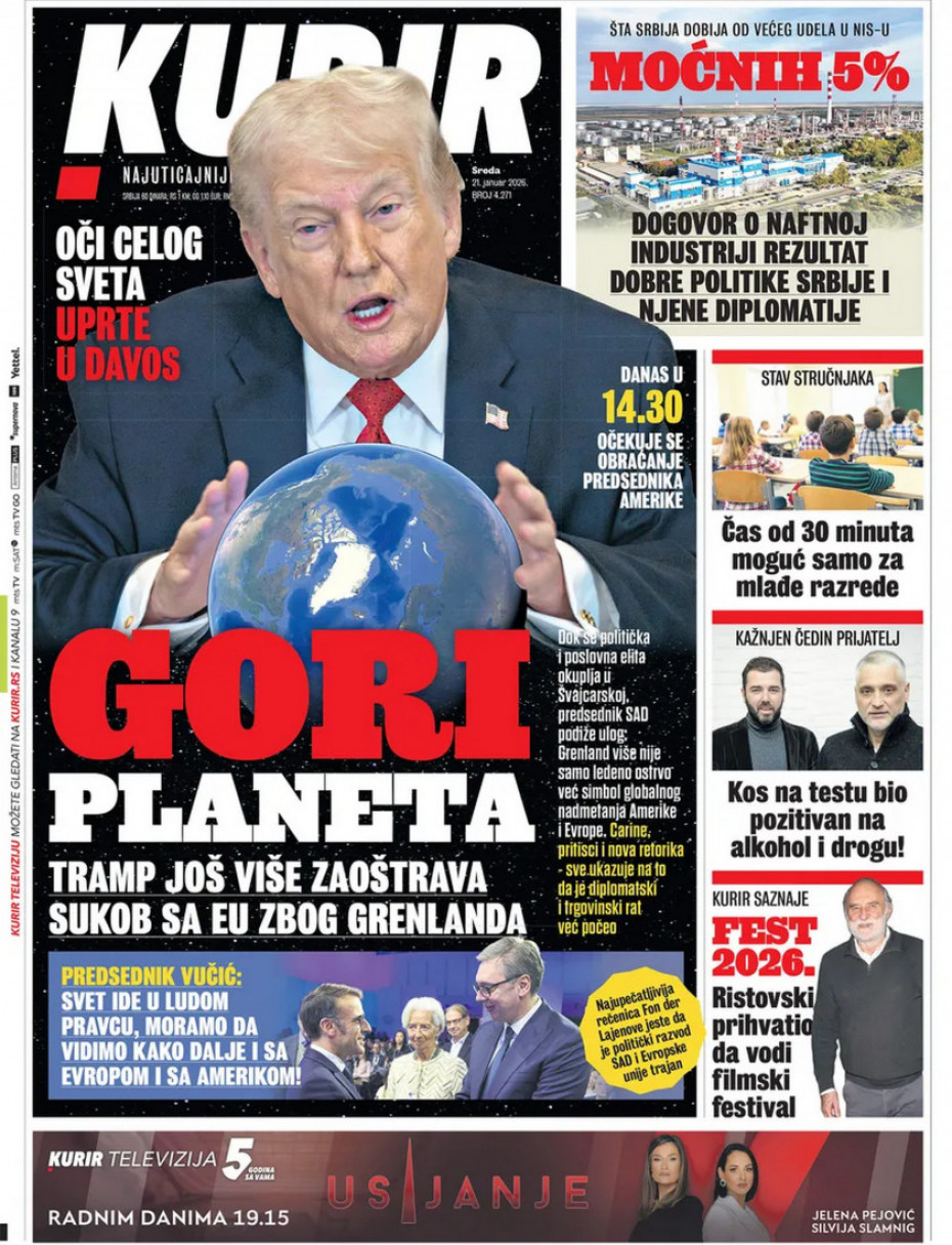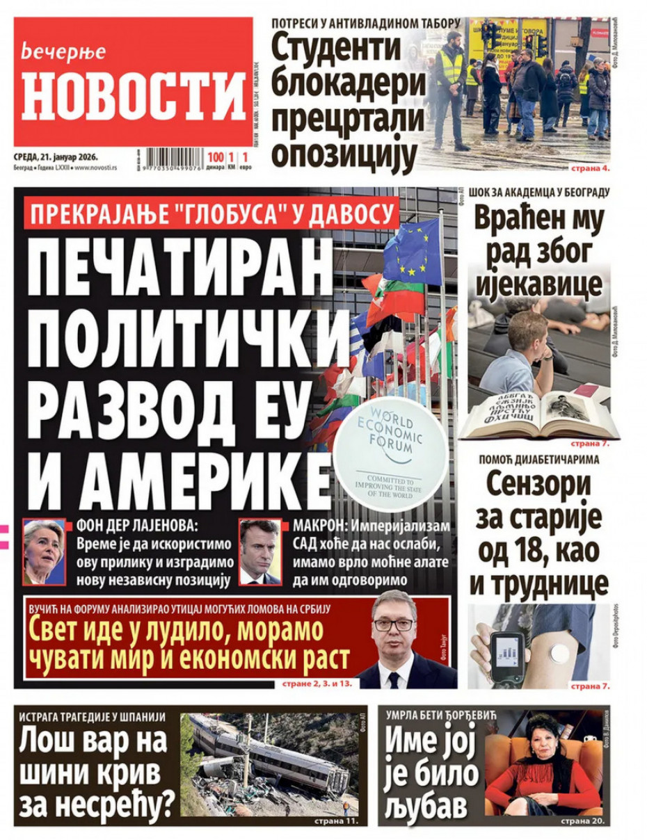 Naslovne strane dnevne štampe za sredu, 21. januar