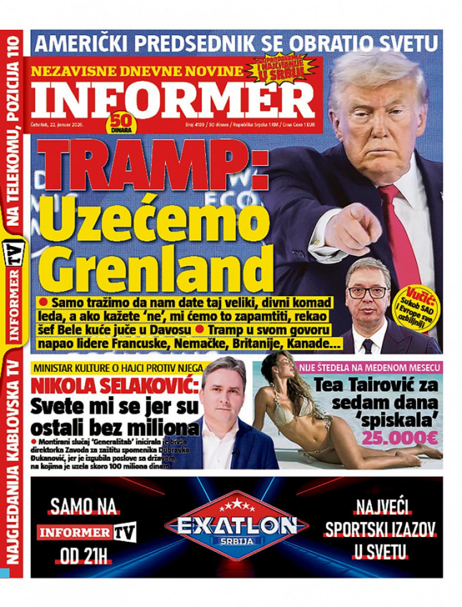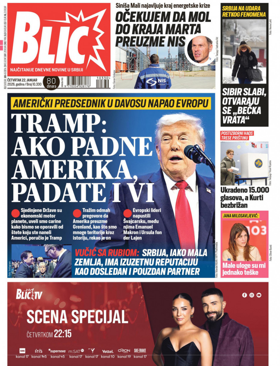 Pogledajte šta na naslovnim stranama donose dnevne novine u Srbiji u izdanju za četvrtak, 22. januar