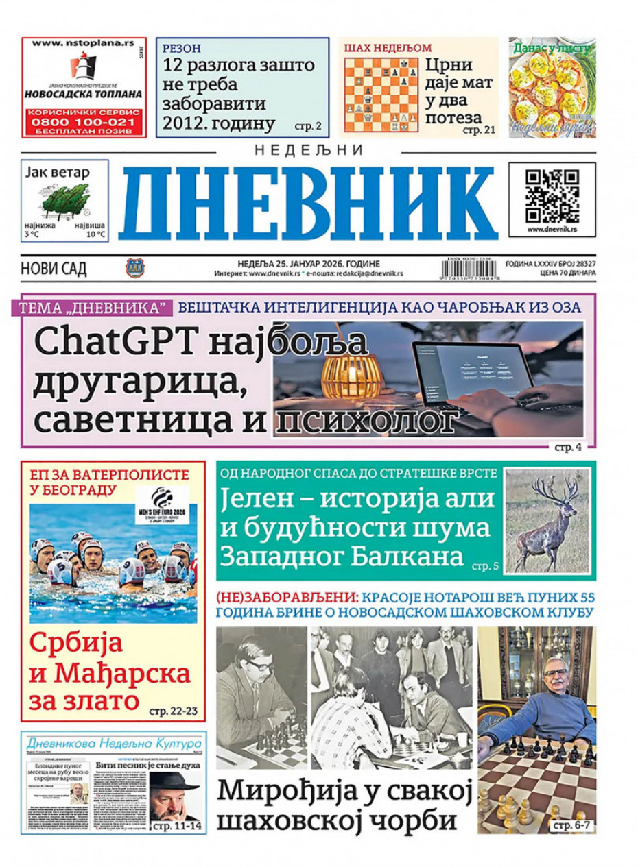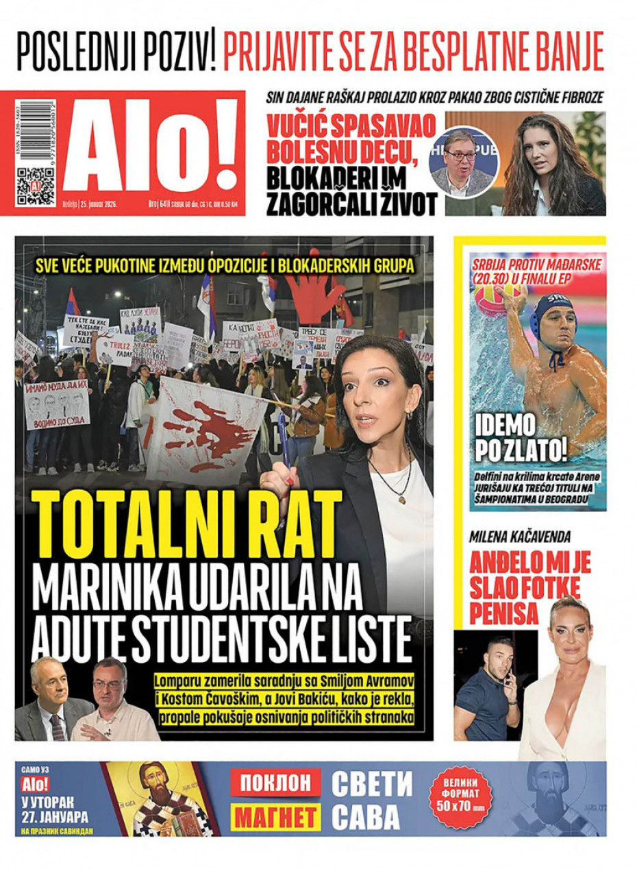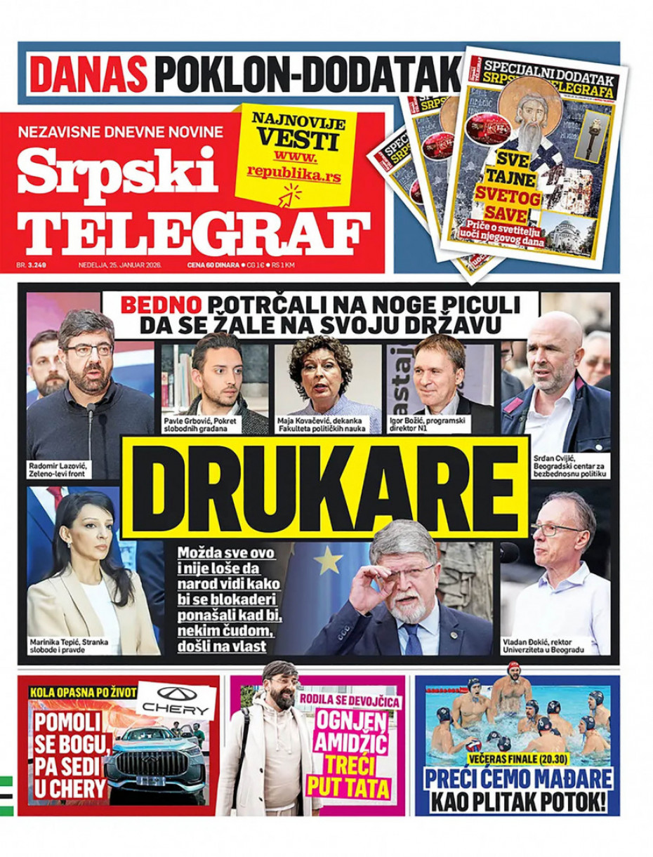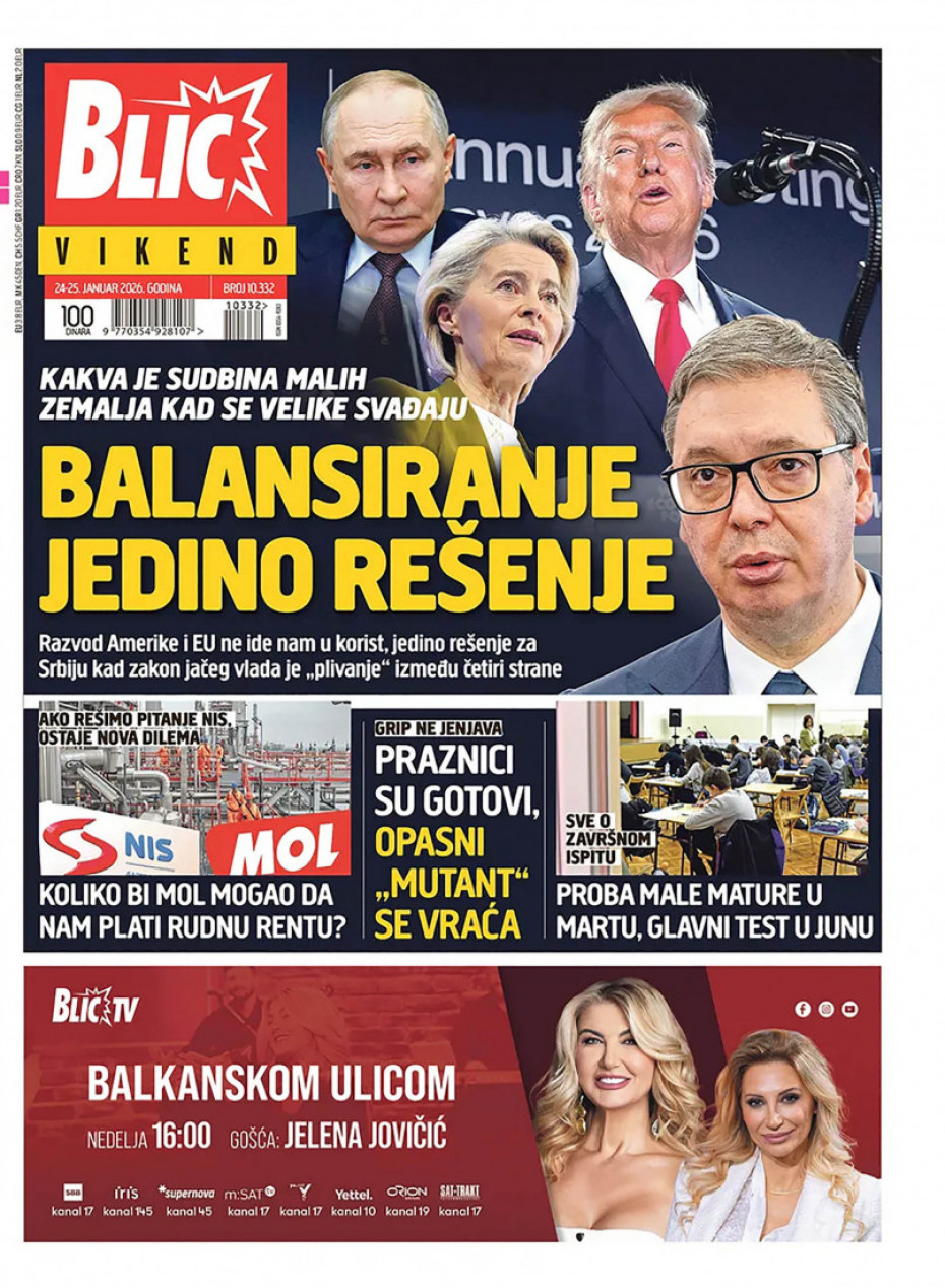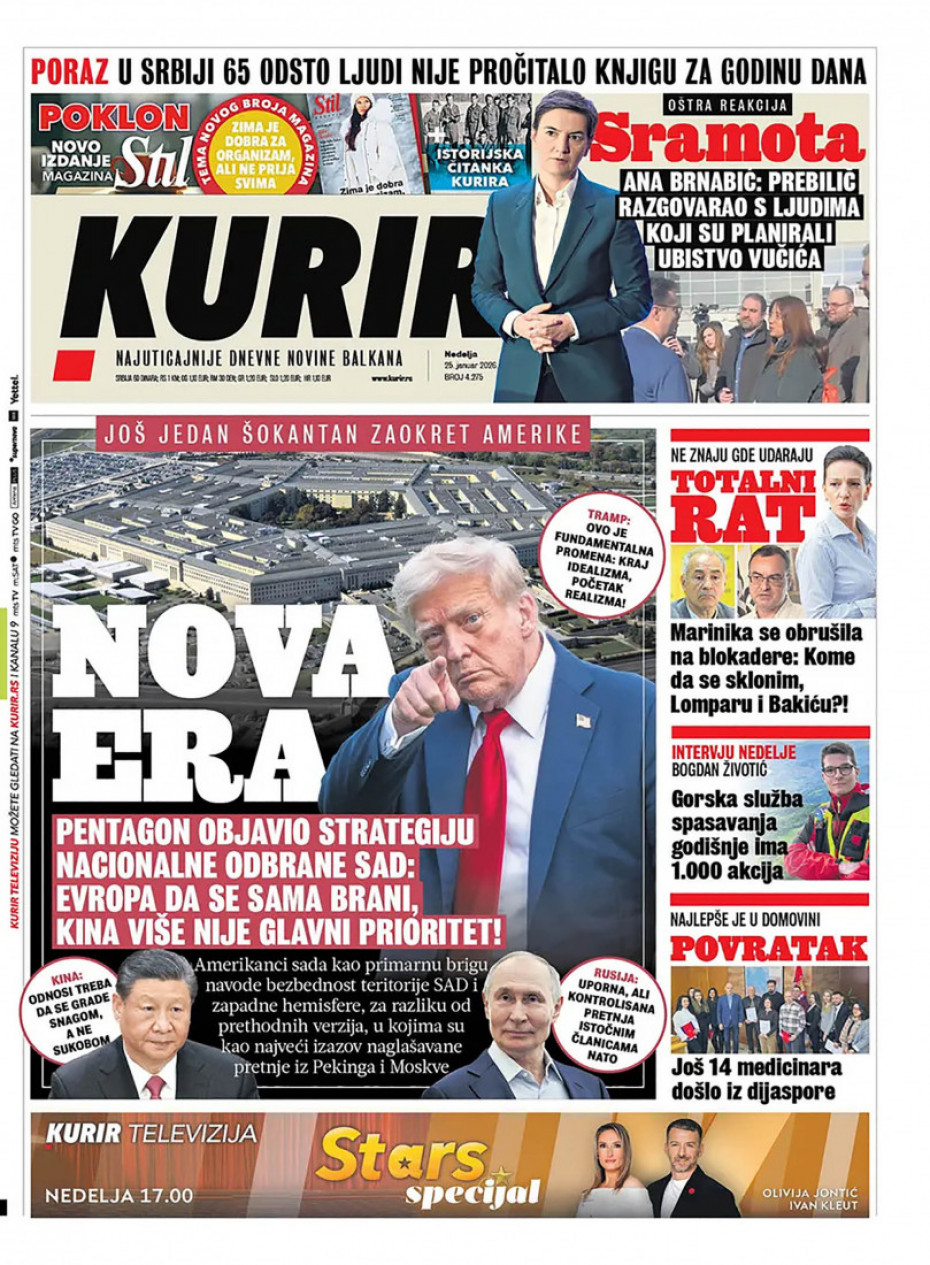 Naslovna Srbija Politika Politika Naslovne strane dnevne štampe za nedelju, 25. januar Komentari Naslovne strane dnevne štampe za nedelju, 25. januar - Copyright Profimedia, Logo Autor: Euronews Srbija 24/01/2026 - 20:31 Podeli veličina teksta Aa Aa Pogledajte šta na naslovnim stranama donose dnevne novine u Srbiji u izdanju za nedelju, 25. januar Promo Pogledaj galeriju Promo Pogledaj galeriju Promo Pogledaj galeriju Promo Pogledaj galeriju Promo Pogledaj galeriju Promo Pogledaj galeriju Promo Pogledaj galeriju Promo Pogledaj galeriju Promo Pogledaj galeriju Više o... Dnevna štampa Naslovne strane sutrašnjih novina Naslovne strane Sutrašnje naslovnice Top tagovi Euronews Montenegro Kosovo i Metohija Rat u Ukrajini Kriza na Bliskom istoku