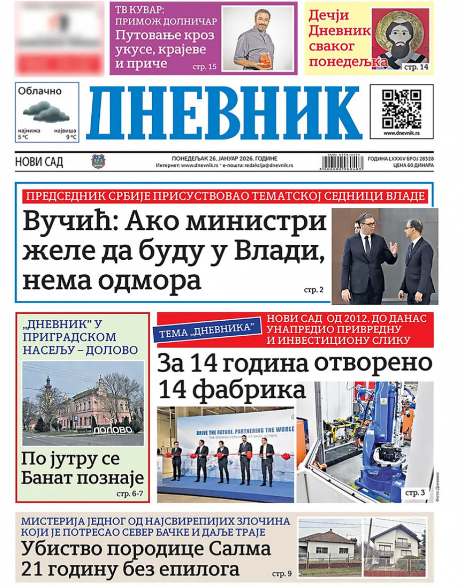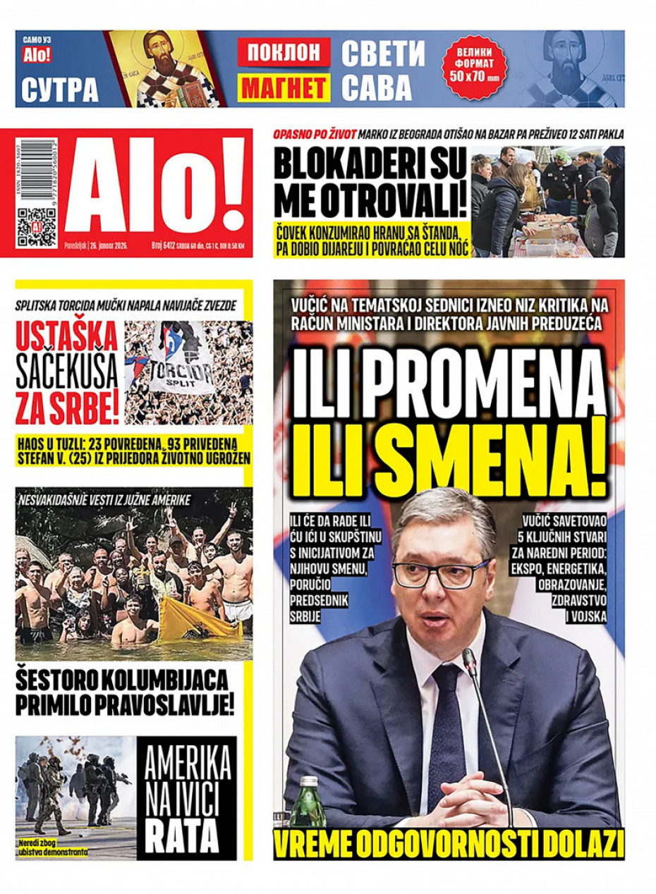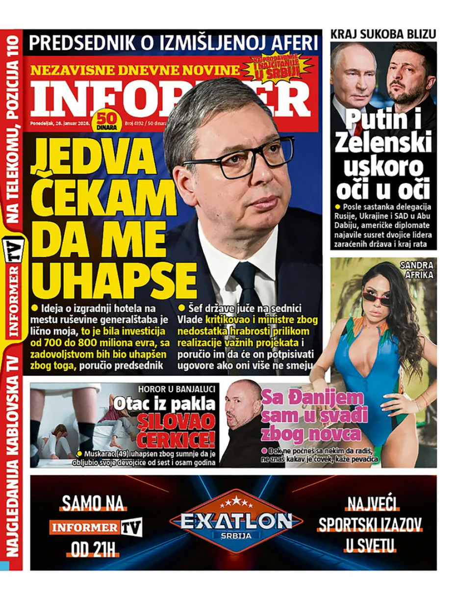 Pogledajte šta na naslovnim stranama donose dnevne novine u Srbiji u izdanju za ponedeljka, 26. januar