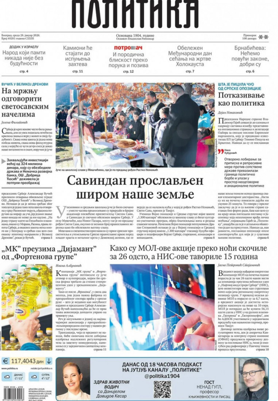 Naslovne strane dnevne štampe za sredu, 28. januar