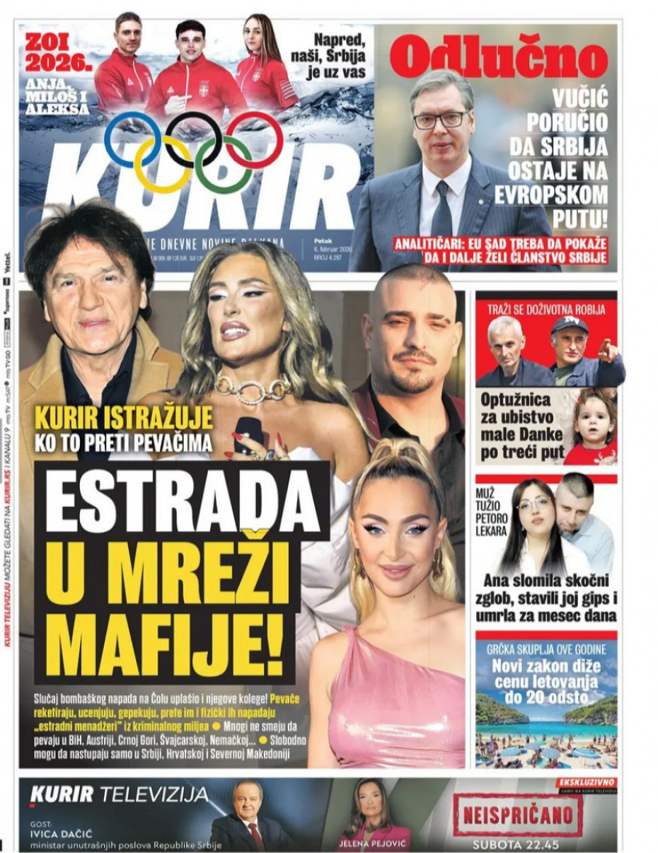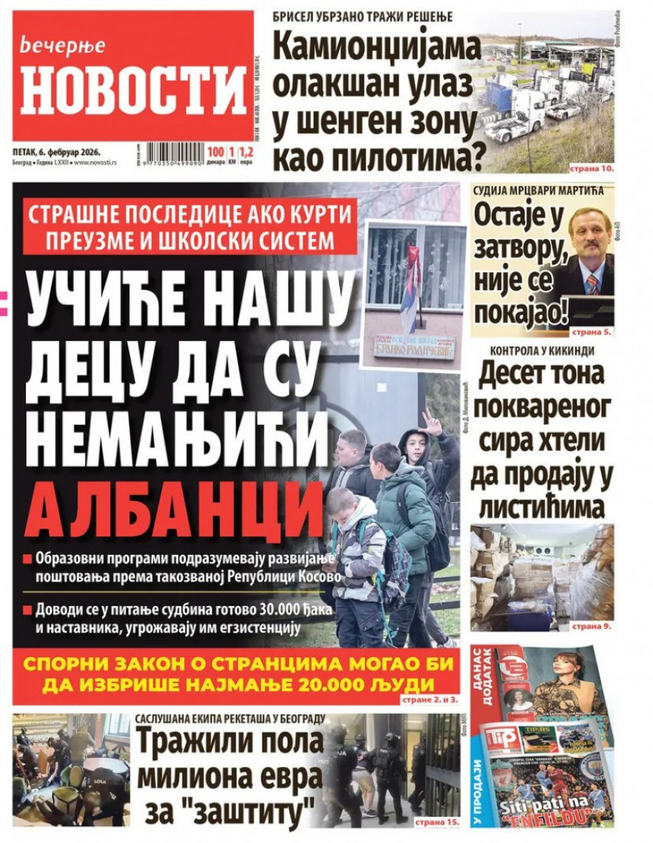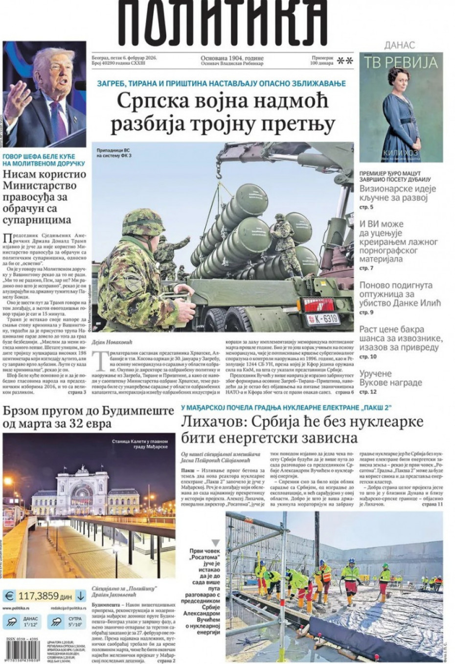 Pogledajte šta na naslovnim stranama donose dnevne novine u Srbiji u izdanju za petak, 6. februar