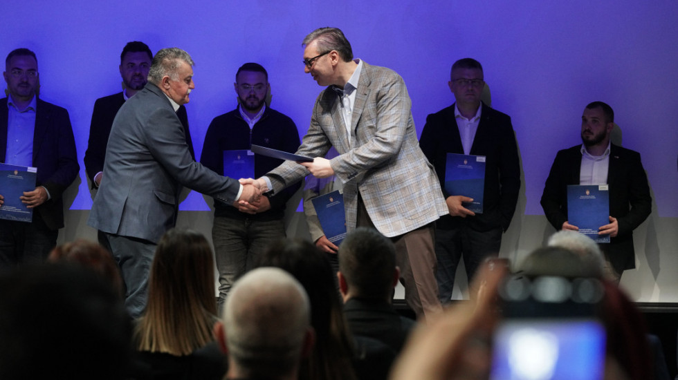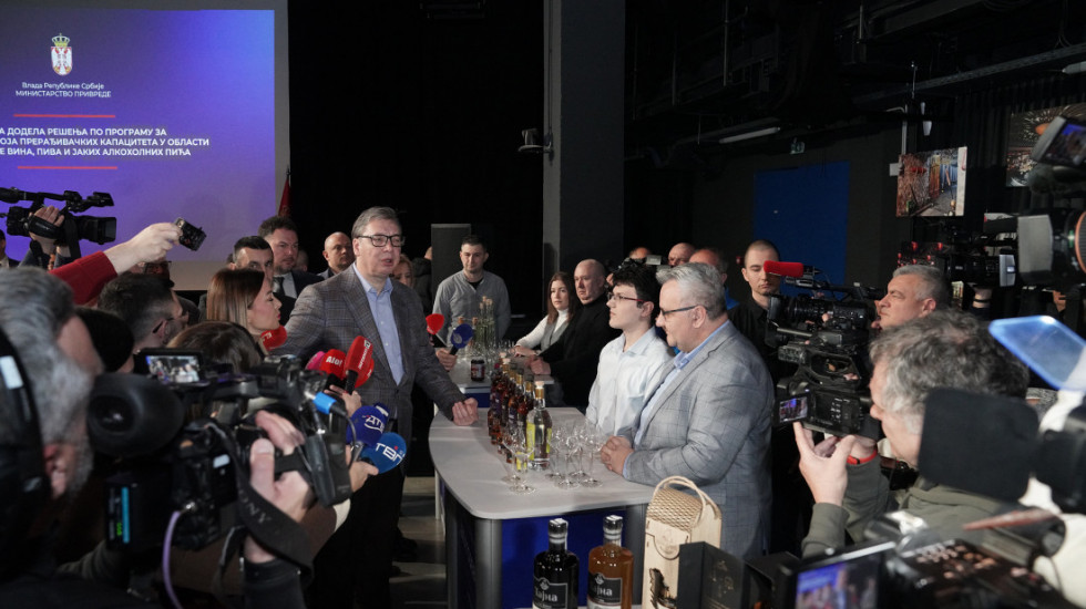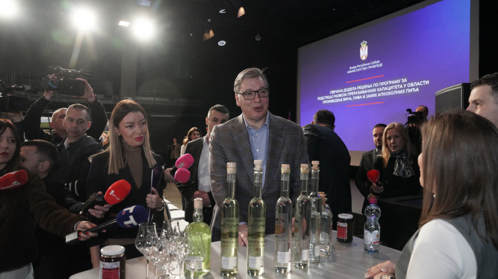 Predsednik Srbije Aleksandar Vučić svečano je danas uručio rešenja dobitnicima sredstava po programu za podsticaj razvoja prerađivačkih kapaciteta u oblasti proizvodnje vina, piva i jakih alkoholnih pića u 2025. godini i najavio da će kreditna sredstva za pomoć biti uvećana sa 10 na 20 miliona dinara.