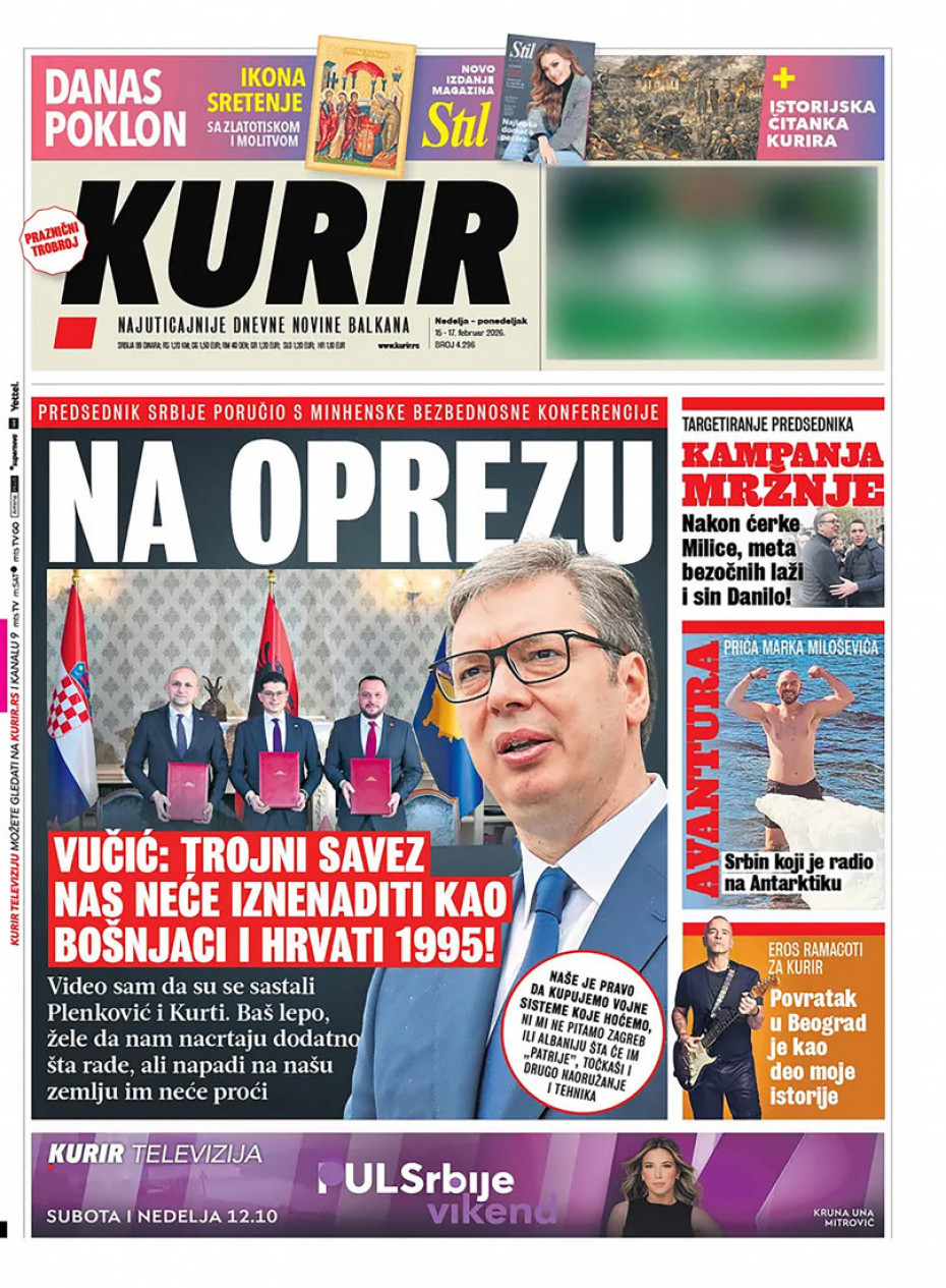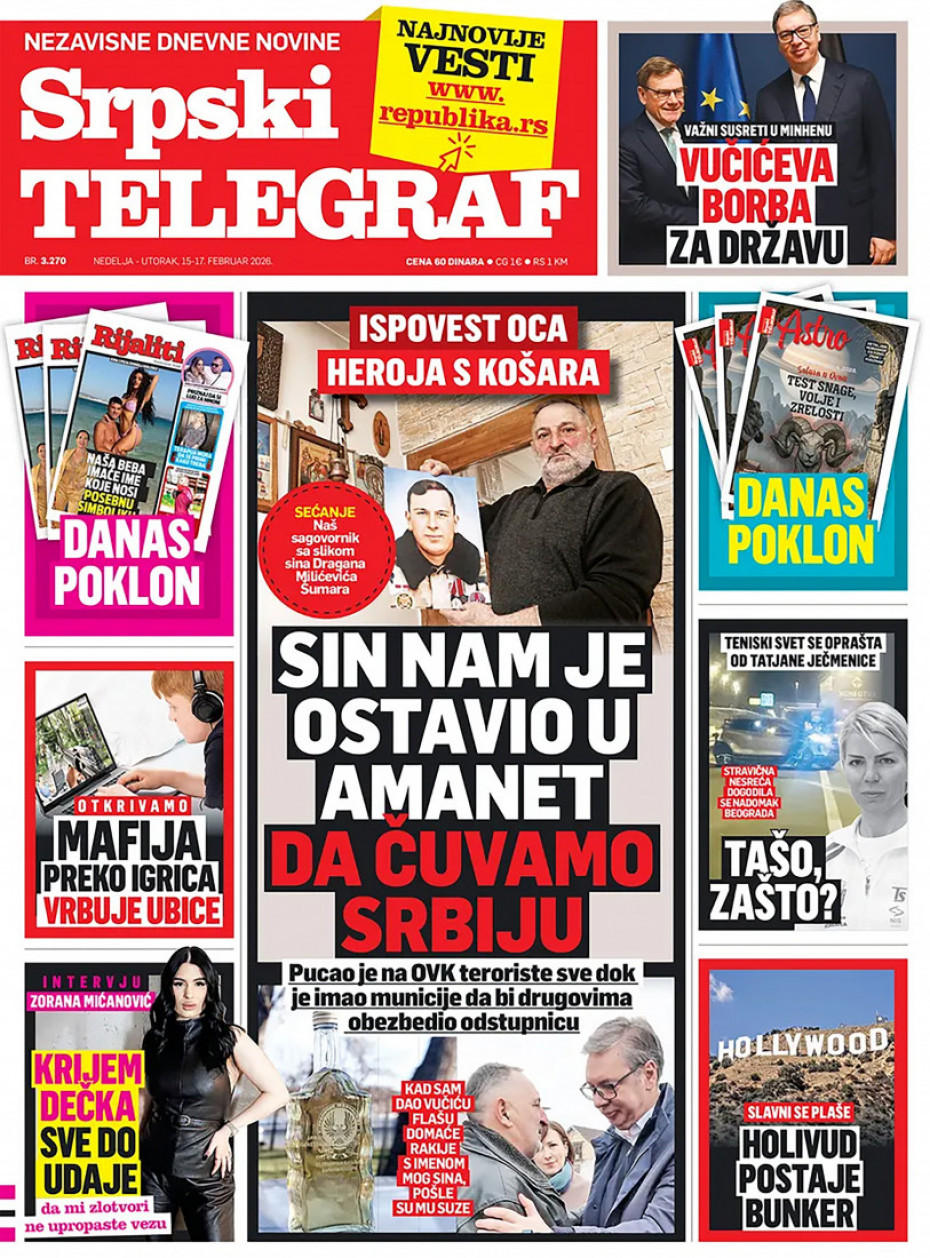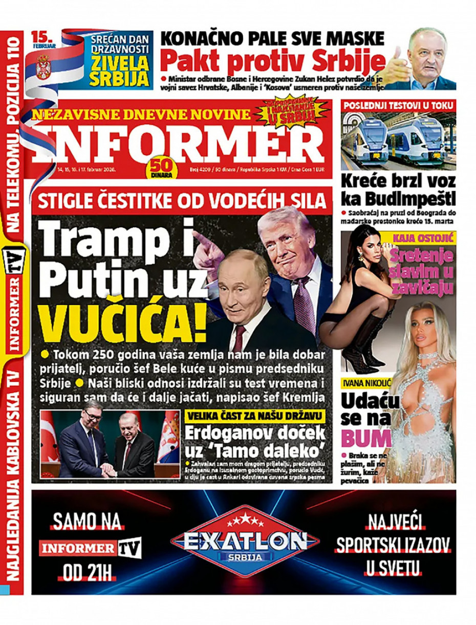 Pogledajte šta na naslovnim stranama donose dnevne novine u Srbiji u izdanju za za nedelju 15. februar.