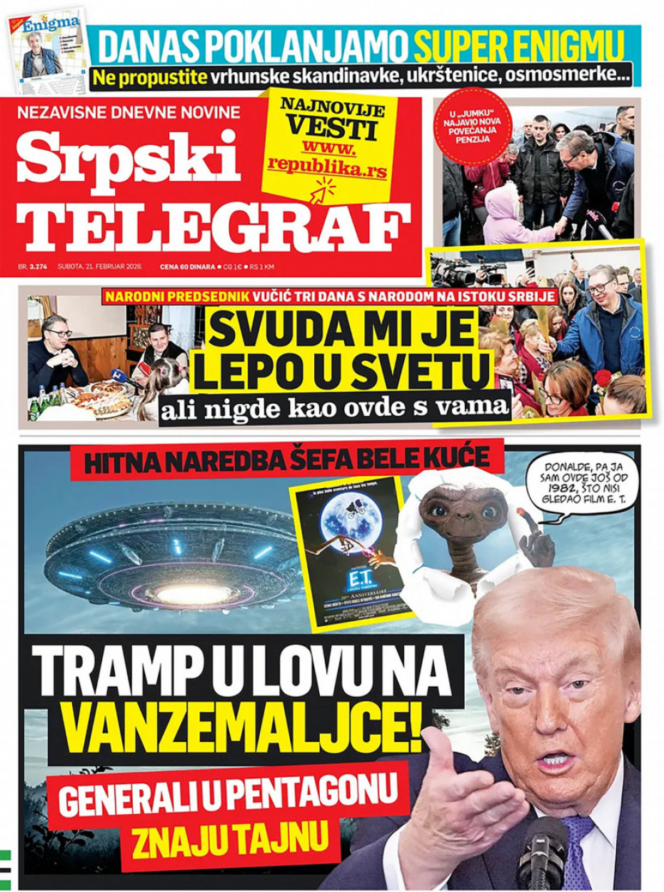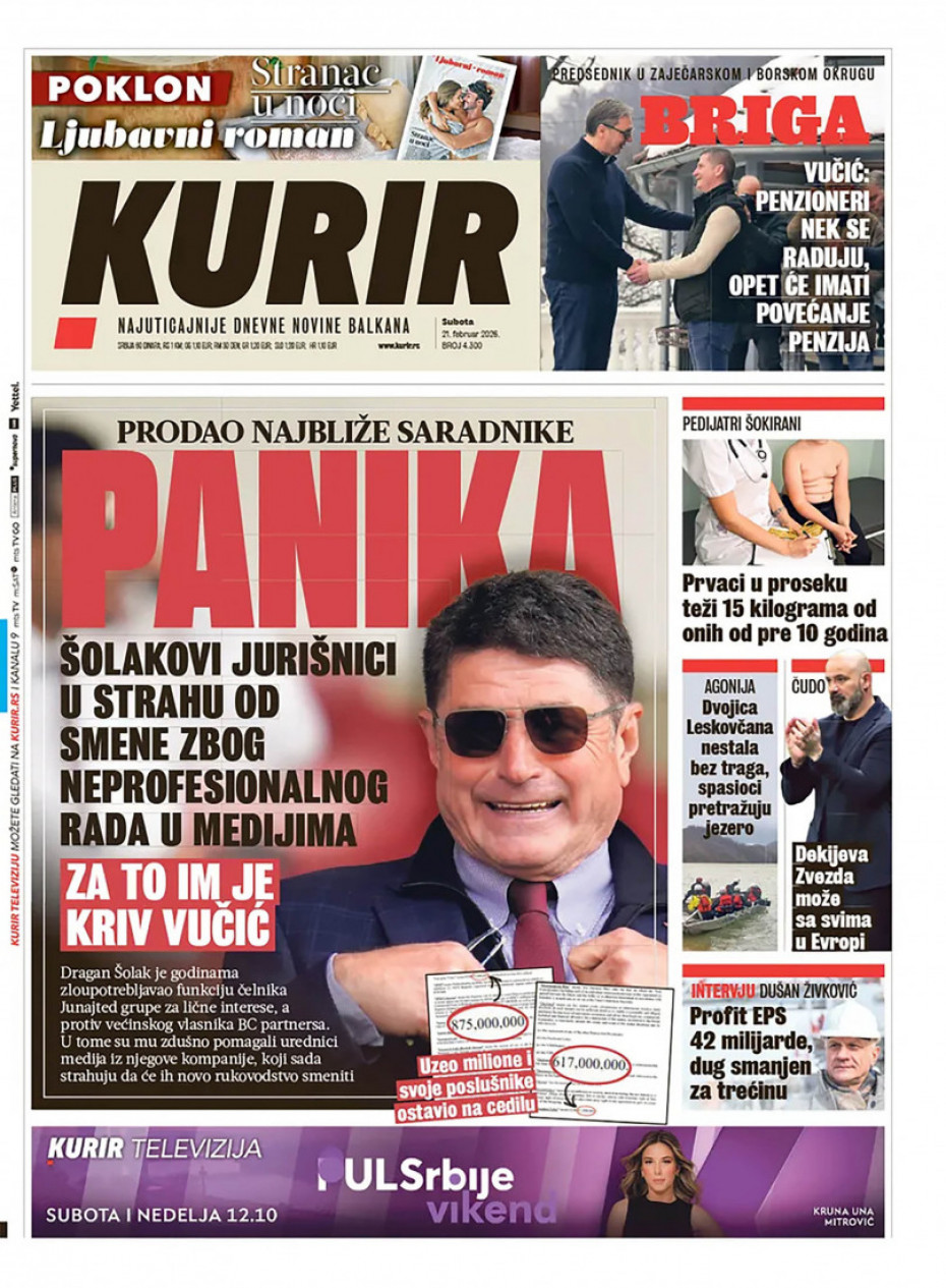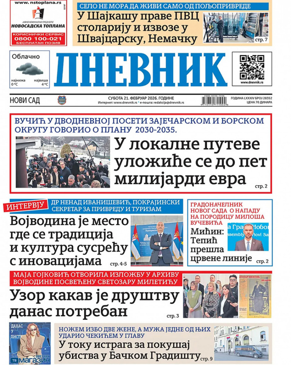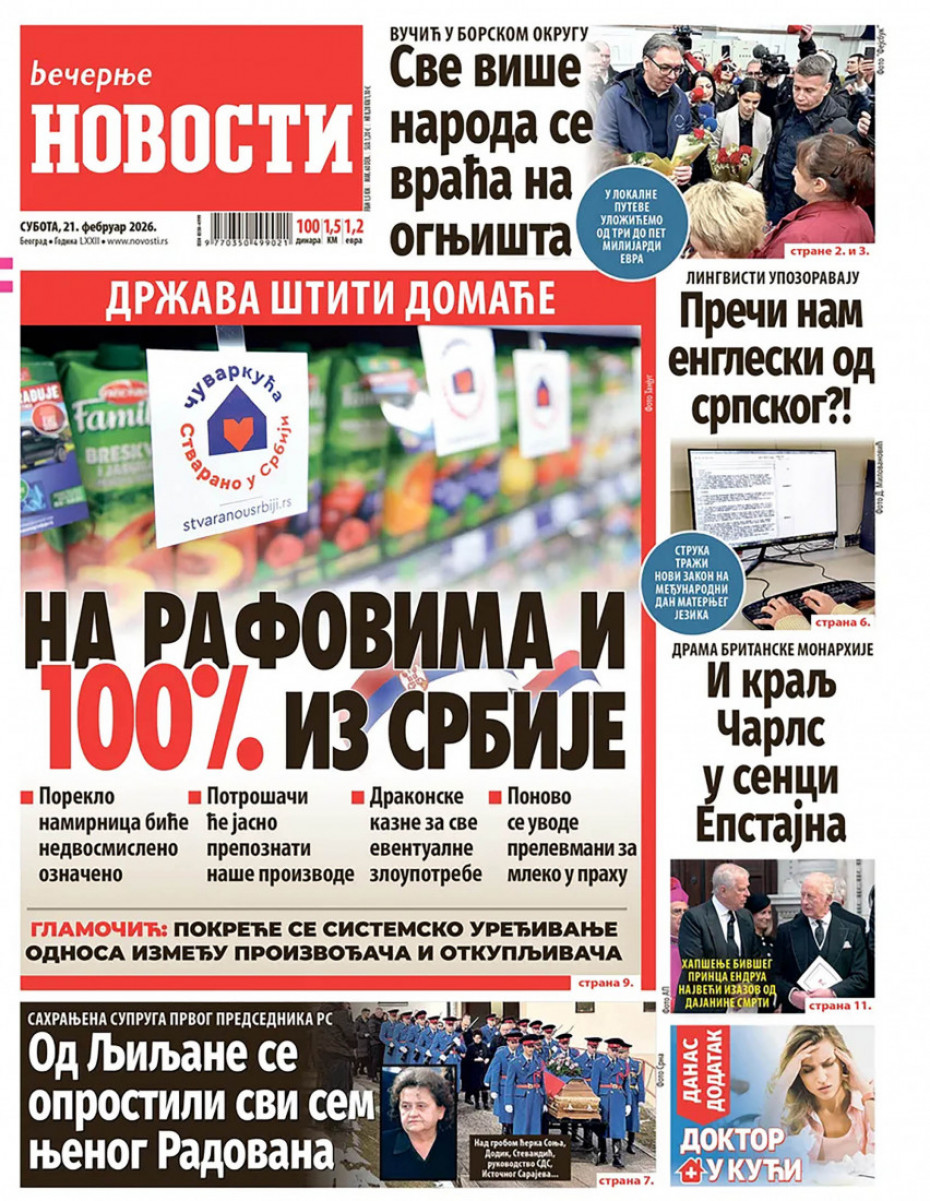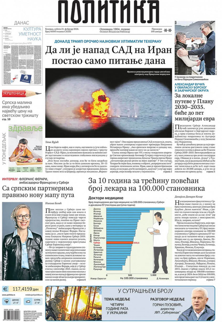 Naslovna Srbija Politika Politika Naslovne strane dnevne štampe za subotu, 21. februar Komentari Naslovne strane dnevne štampe za subotu, 21. februar - Copyright Profimedia, Logo Autor: Euronews Srbija 20/02/2026 - 20:55 Podeli veličina teksta Aa Aa Pogledajte šta na naslovnim stranama donose dnevne novine u Srbiji u izdanju za subotu, 21. februar Promo Pogledaj galeriju Promo Pogledaj galeriju Promo Pogledaj galeriju Promo Pogledaj galeriju Promo Pogledaj galeriju Promo Pogledaj galeriju Promo Pogledaj galeriju Promo Pogledaj galeriju Promo Pogledaj galeriju Više o... Naslovne strane Naslovne strane sutrašnjih novina Sutrašnje naslovnice Dnevna štampa Top tagovi Euronews Montenegro Kosovo i Metohija Rat u Ukrajini Kriza na Bliskom istoku