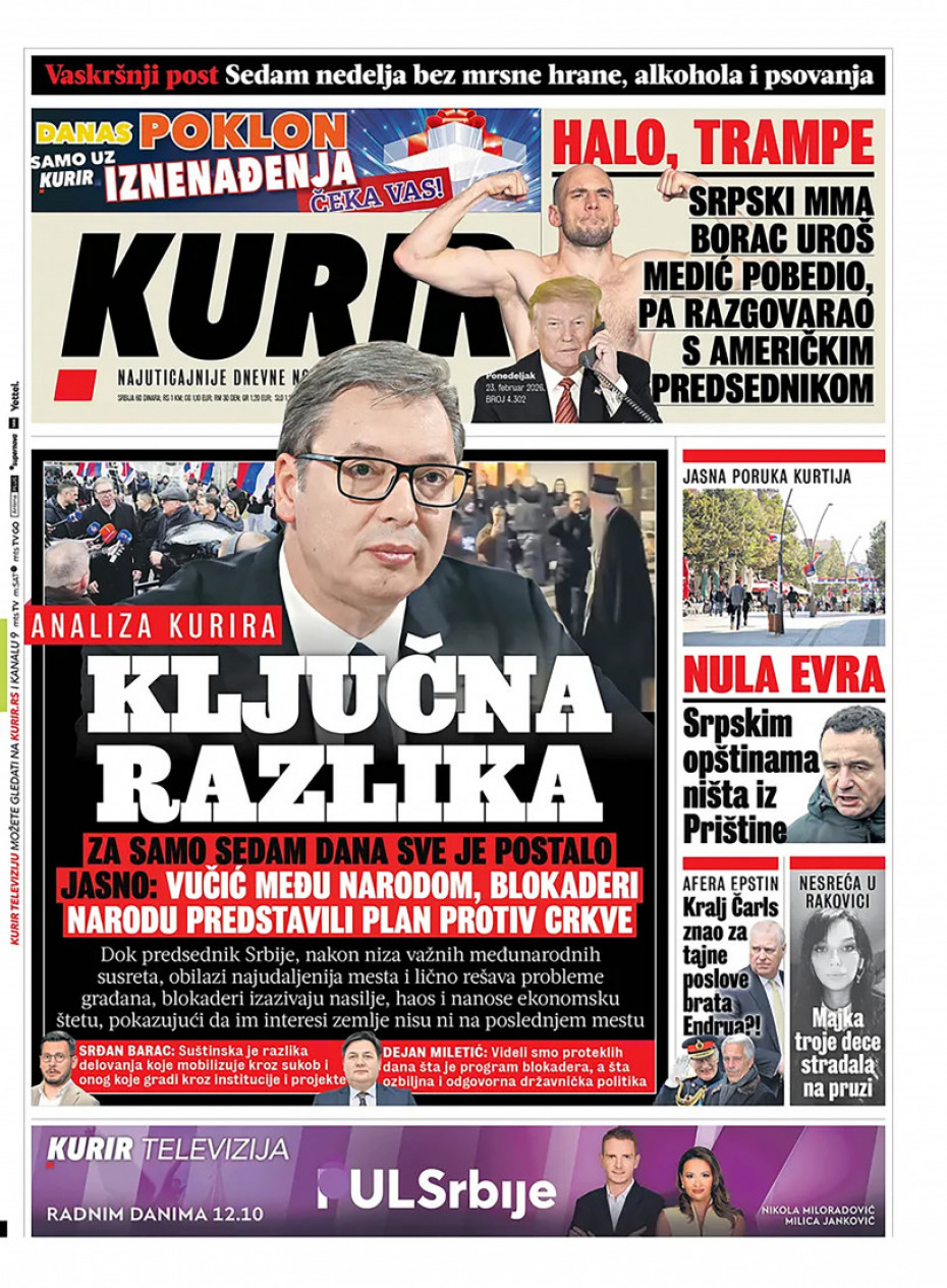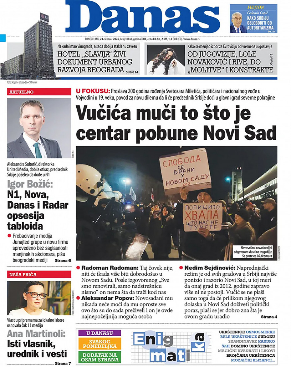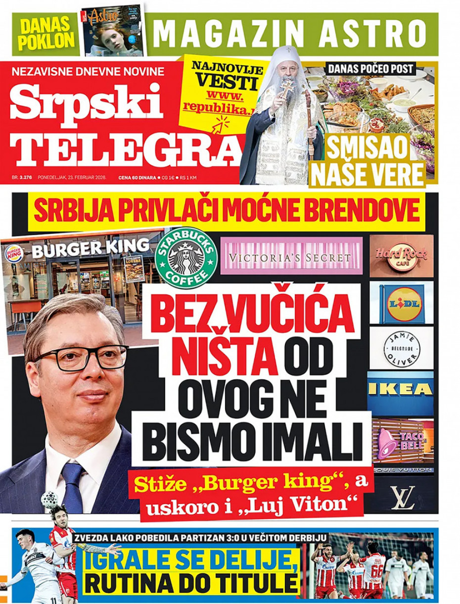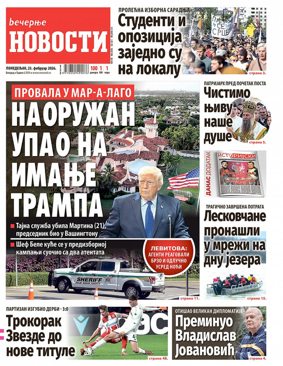 Pogledajte šta na naslovnim stranama donose dnevne novine u Srbiji u izdanju za ponedeljak, 23. februar