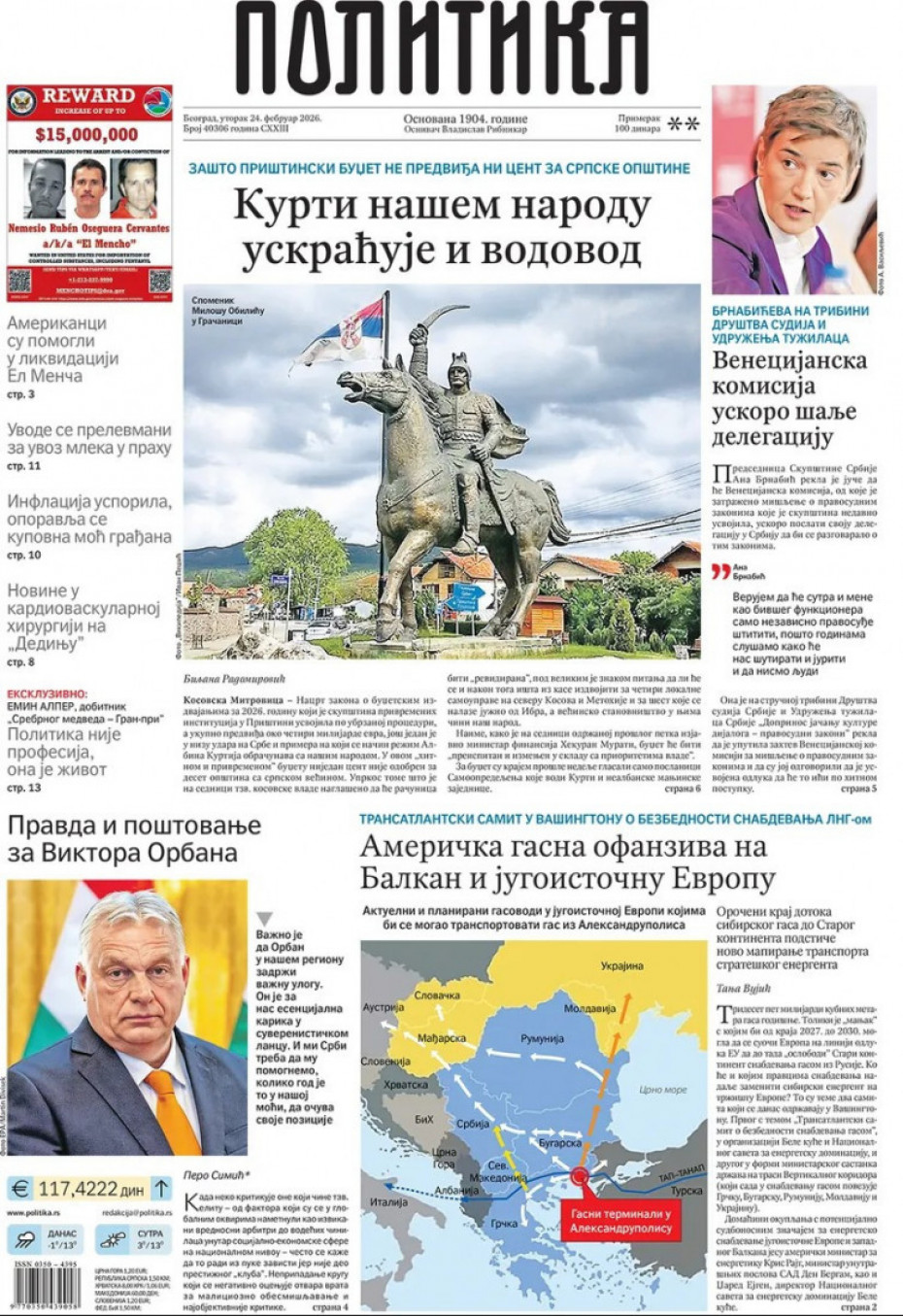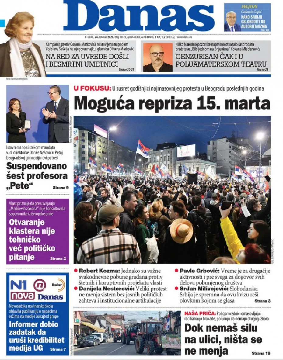 Naslovne strane dnevne štampe za utorak, 24. februar