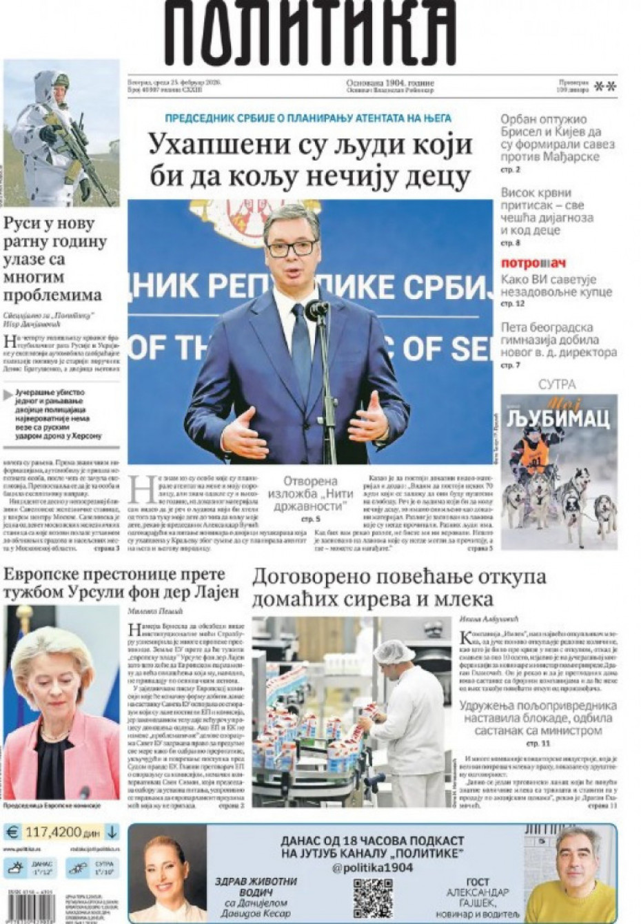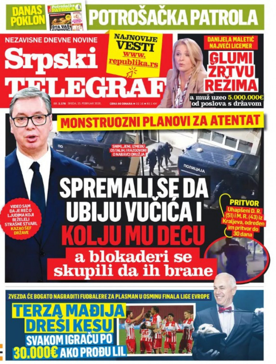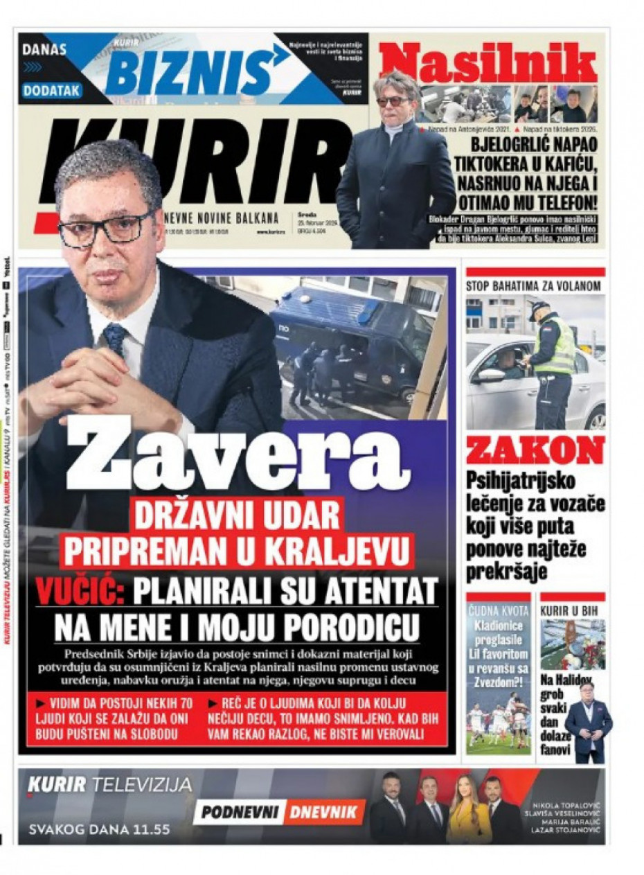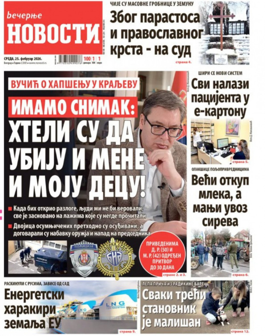 Pogledajte šta na naslovnim stranama donose dnevne novine u Srbiji u izdanju za sredu, 25. februar