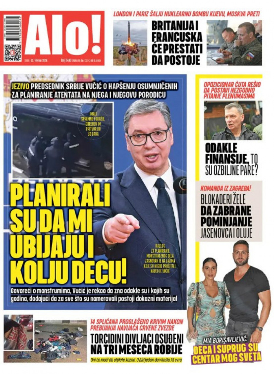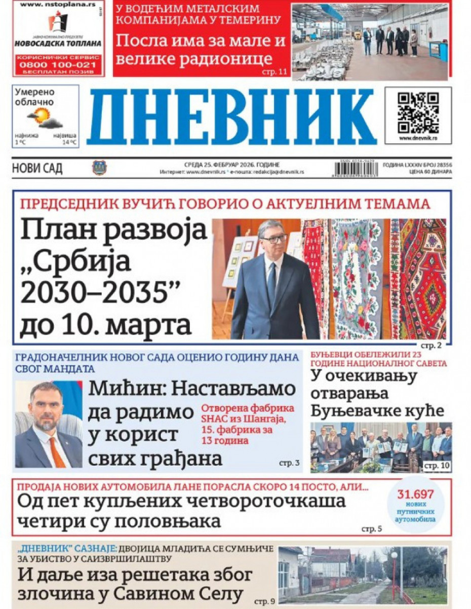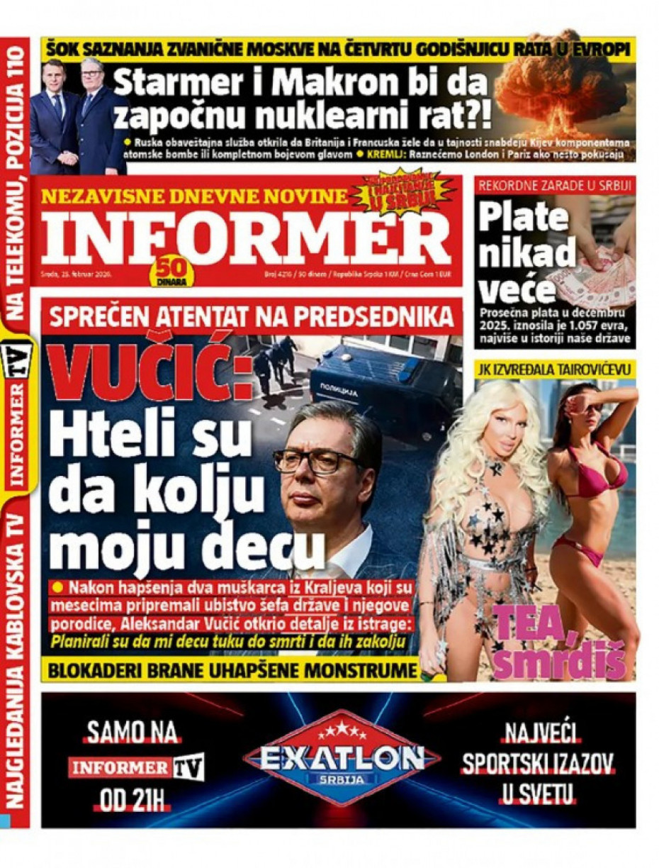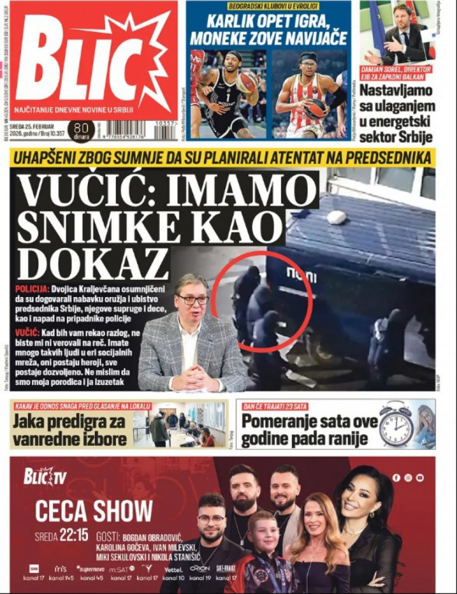 Pogledajte šta na naslovnim stranama donose dnevne novine u Srbiji u izdanju za sredu, 25. februar