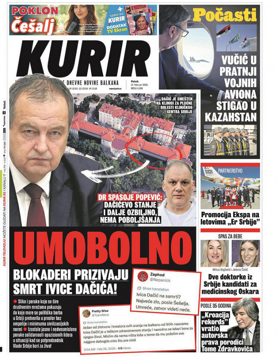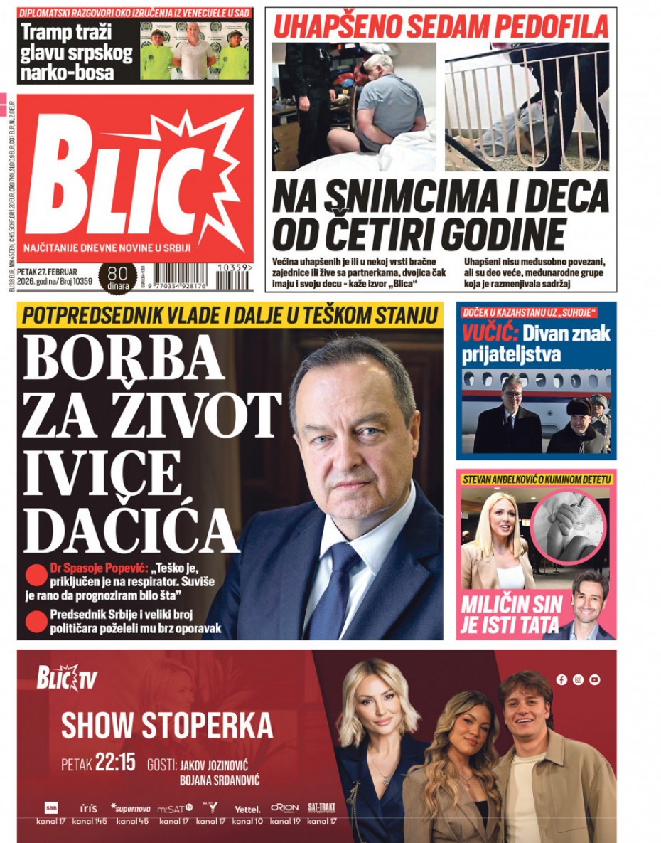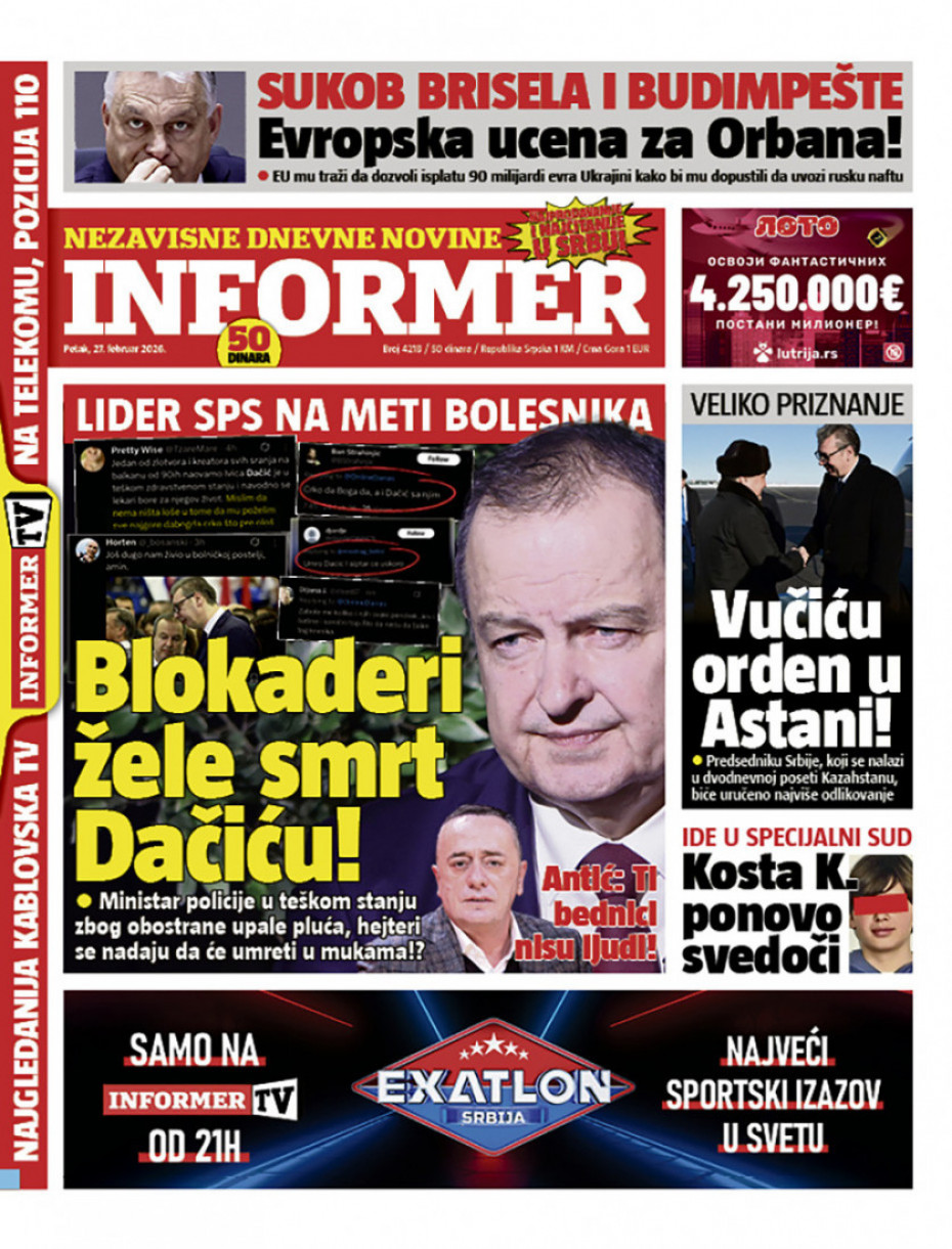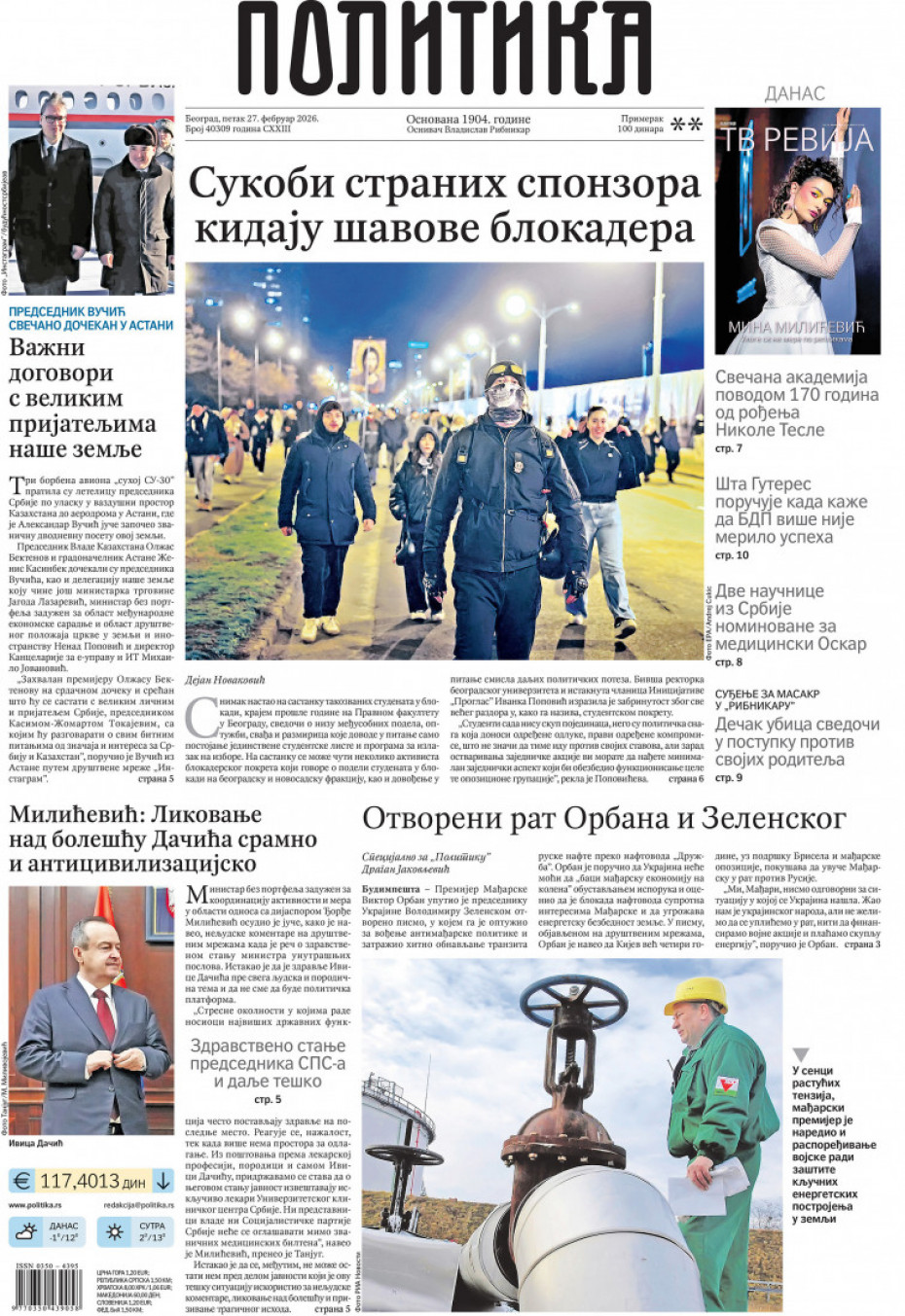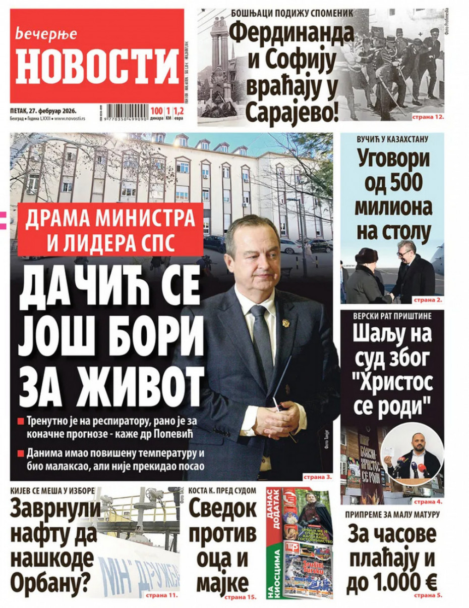 Pogledajte šta na naslovnim stranama donose dnevne novine u Srbiji u izdanju za petak, 27. februar