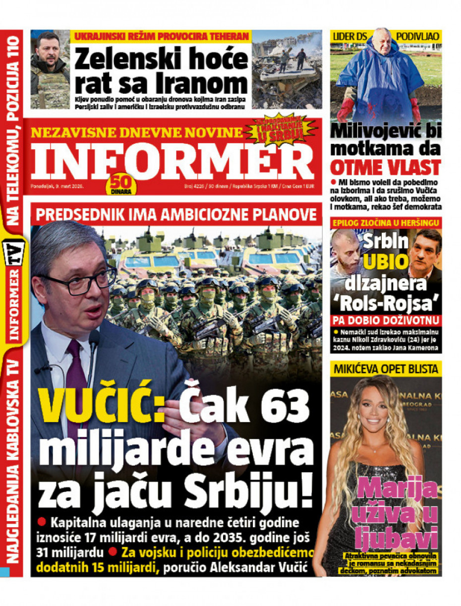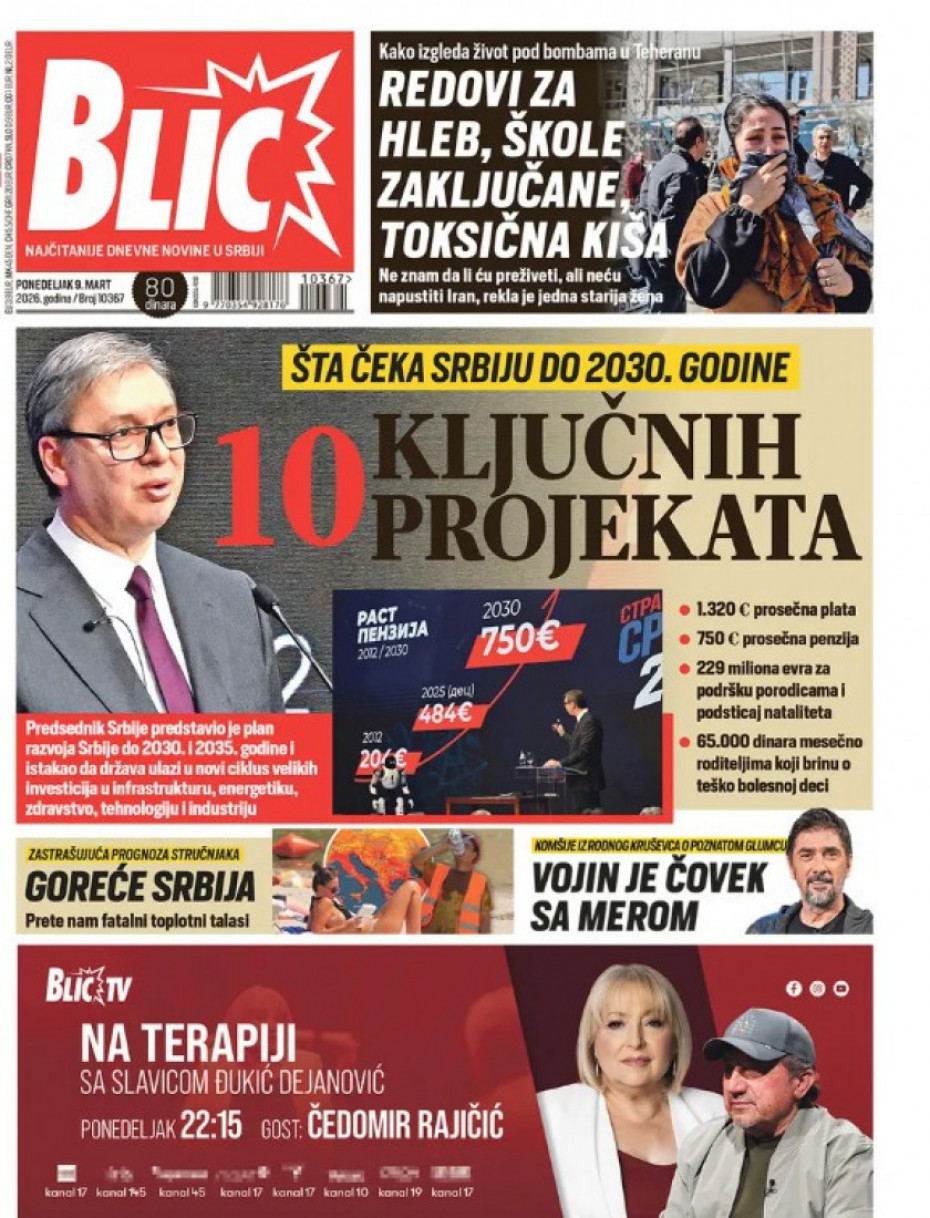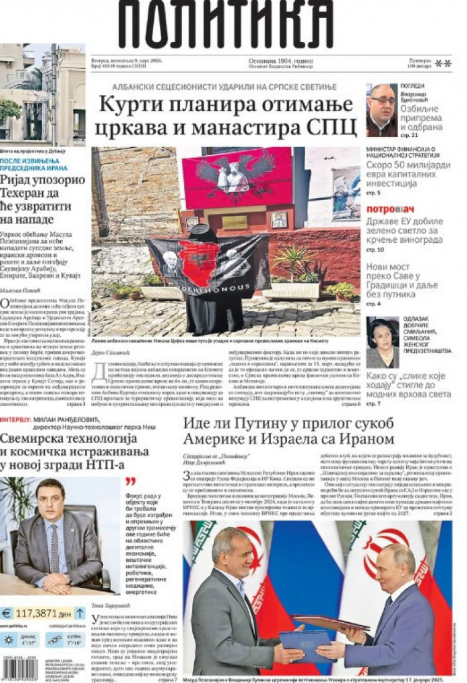 Pogledajte šta na naslovnim stranama donose dnevne novine u Srbiji u izdanju za ponedeljak, 9. mart
