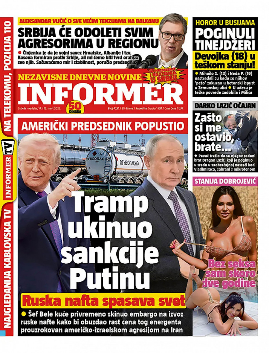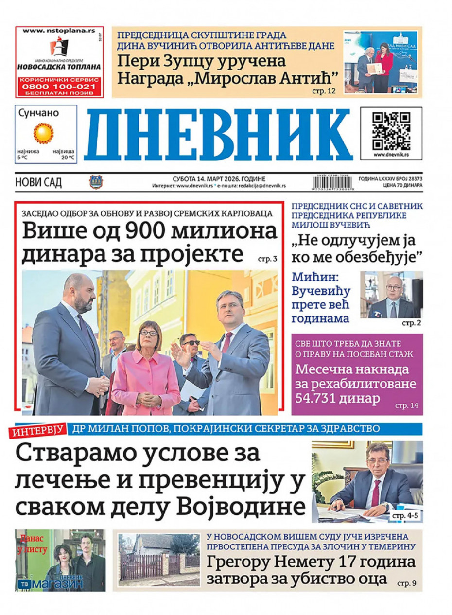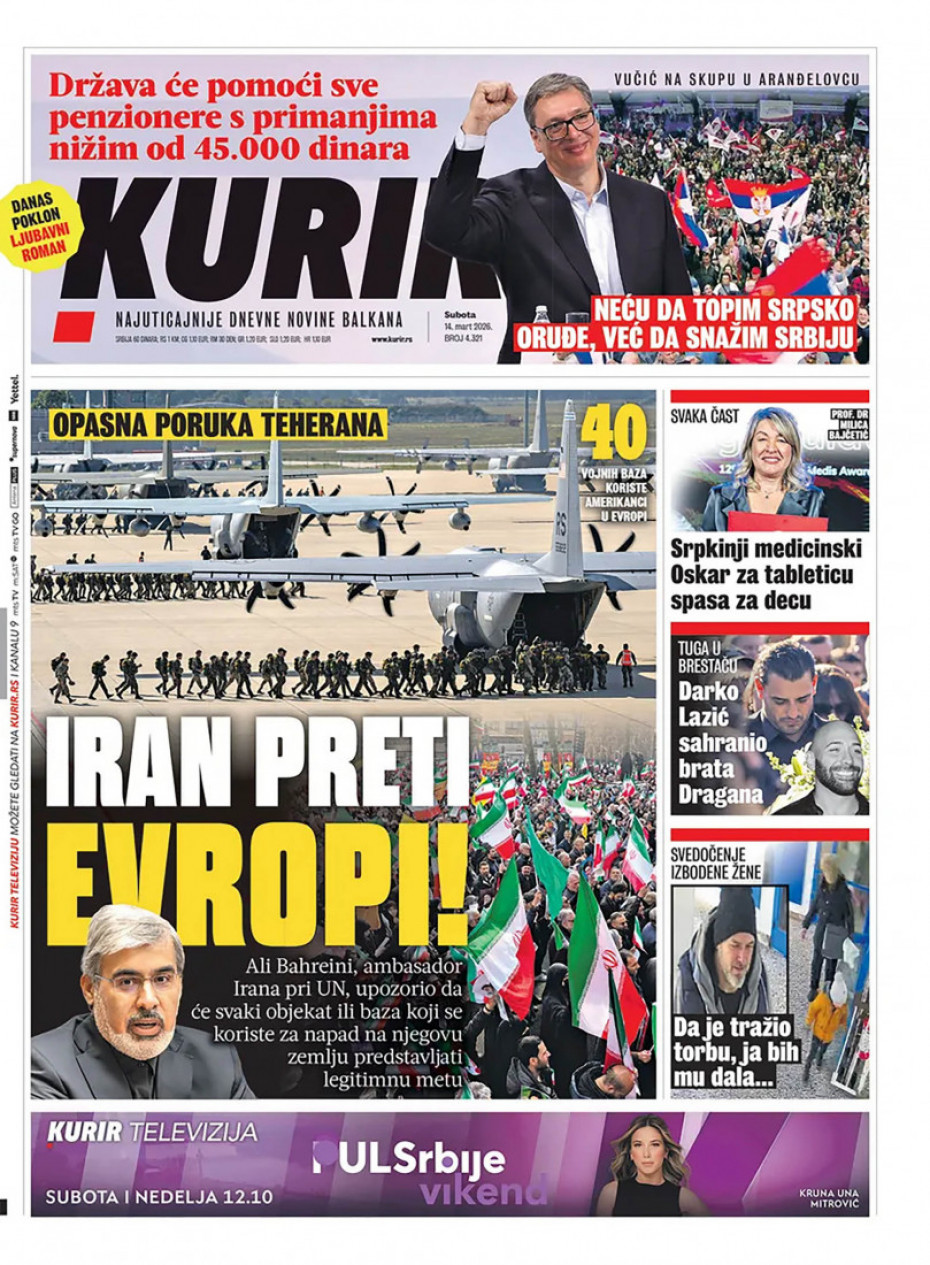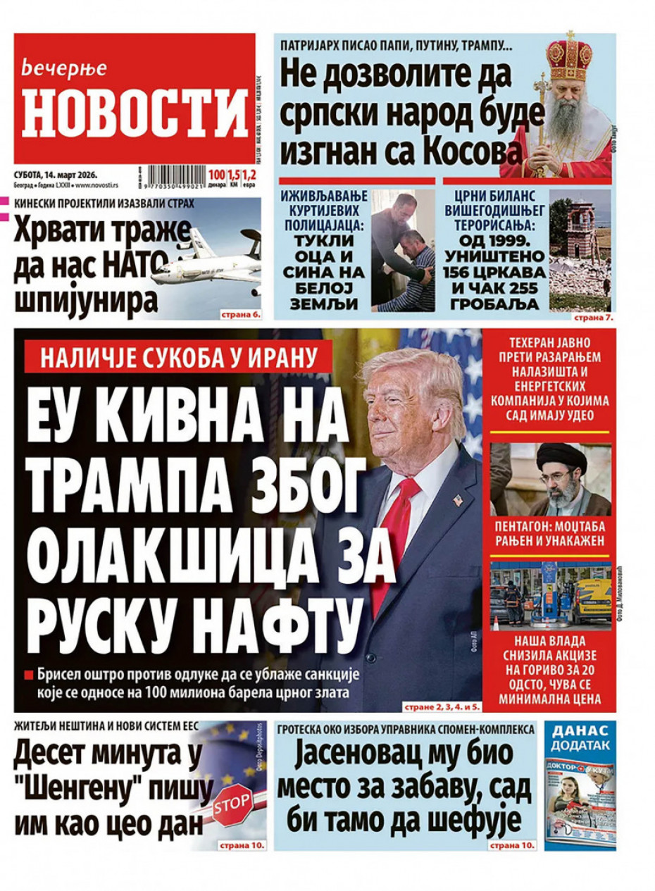 Naslovna Srbija Politika Politika Naslovne strane dnevne štampe za subota, 14. mart Komentari Naslovne strane dnevne štampe za subota, 14. mart - Copyright Profimedia, Logo Autor: Euronews Srbija 13/03/2026 - 20:41 Podeli veličina teksta Aa Aa Pogledajte šta na naslovnim stranama donose dnevne novine u Srbiji u izdanju za subotu, 14. mart. Promo Pogledaj galeriju Promo Pogledaj galeriju Promo Pogledaj galeriju Promo Pogledaj galeriju Promo Pogledaj galeriju Promo Pogledaj galeriju Promo Pogledaj galeriju Promo Pogledaj galeriju Promo Pogledaj galeriju Više o... Naslovne strane Dnvena štampa Novine Naslovne strane dnevne štampe Top tagovi Euronews Montenegro Kosovo i Metohija Rat u Ukrajini Kriza na Bliskom istoku
