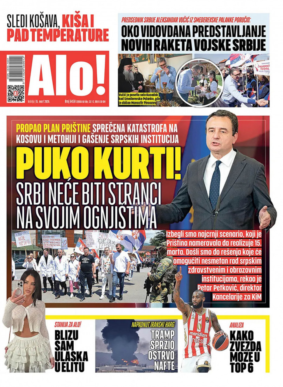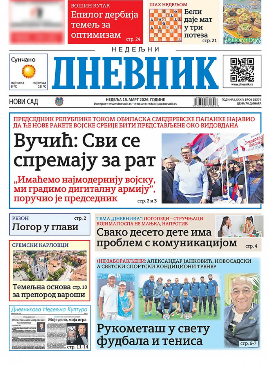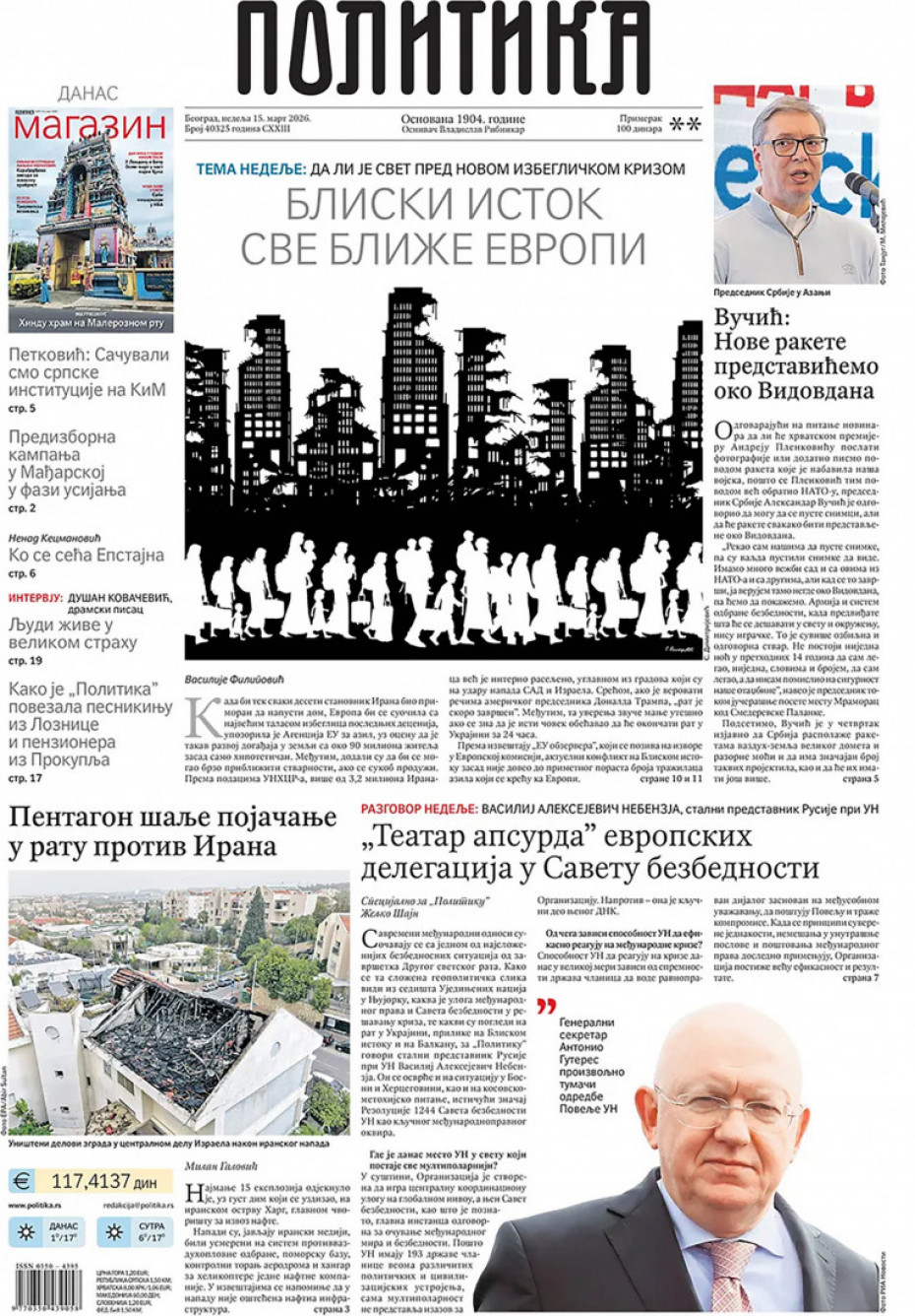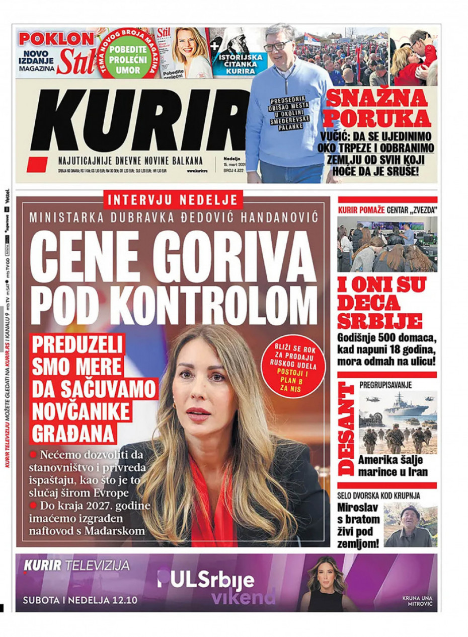 Naslovna Srbija Politika Politika Naslovne strane dnevne štampe za nedelju, 15. mart Komentari Naslovne strane dnevne štampe za nedelju, 15. mart - Copyright Profimedia, Logo Autor: Euronews Srbija 14/03/2026 - 20:43 Podeli veličina teksta Aa Aa Pogledajte šta na naslovnim stranama donose dnevne novine u Srbiji u izdanju za nedelju,15. mart Promo Pogledaj galeriju Promo Pogledaj galeriju Promo Pogledaj galeriju Promo Pogledaj galeriju Promo Pogledaj galeriju Promo Pogledaj galeriju Promo Pogledaj galeriju Promo Pogledaj galeriju Promo Pogledaj galeriju Više o... Dnevna štampa Naslovne strane sutrašnjih novina Naslovne strane Sutrašnje naslovnice Top tagovi Euronews Montenegro Kosovo i Metohija Rat u Ukrajini Kriza na Bliskom istoku