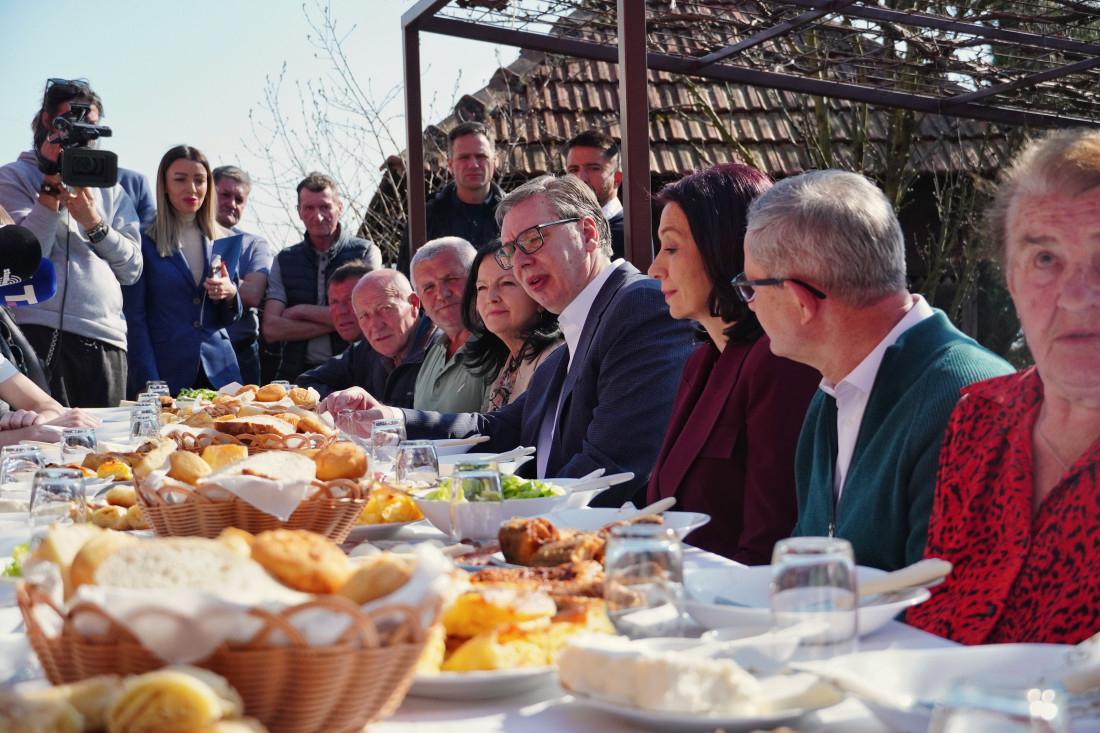 Vučić je u poseti porodici Raković u Sevojnu kod Užica. Zajedno sa predsednikom su ministarka privrede Adrijana Mesarović, ministar poljoprivrede, vodoprivrede i šumarstva Dragan Glamočić i savetnik predsednika za regionalna pitanja i predsednik SNS Miloš Vučević.