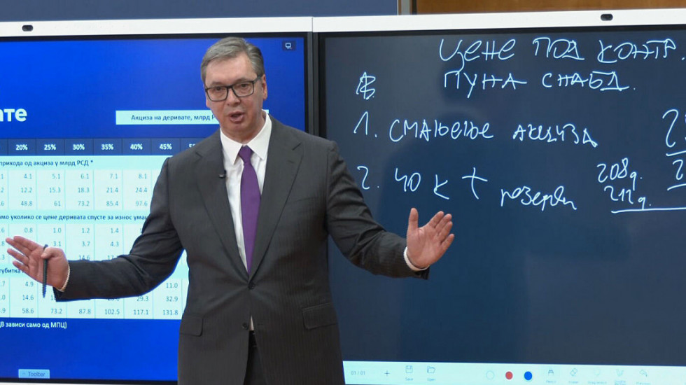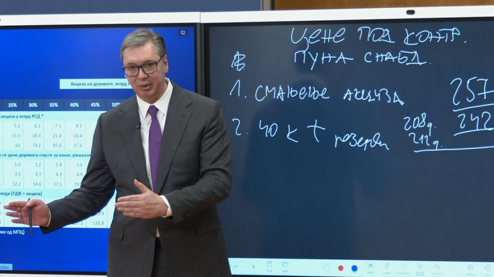 "Prvi cilj za građane je da cene budu pod kontrolom, a drugi cilj je puna snabdevenost. Naša prva mera je smanjenje akciza. Mi godišnje oko dve milijarde evra dobijamo preko akciza nafte. Pronašli smo mogućnost da smanjimo i više od 20 posto akcize. Da vam objasnim kako to funkcioniše. Današnja cena bi bila 257 dinara, ovo je cena dizela. Mi smo rekli 20 posto, to je 15 dinara manje, to dođe do 242 dinara. Danas je na pumpama 208 dinara. Razlika u ceni je 34 dinara. Mi ćemo danas ići na povećanje od samo 4 dinara. Benzin samo dva dinara. Dizel će biti 212 dinara, a benzin će od danas biti 188 dinara. Da kažem građanima da ne brinu, imamo sve, brinuli smo na vreme", rekao je Vučić.