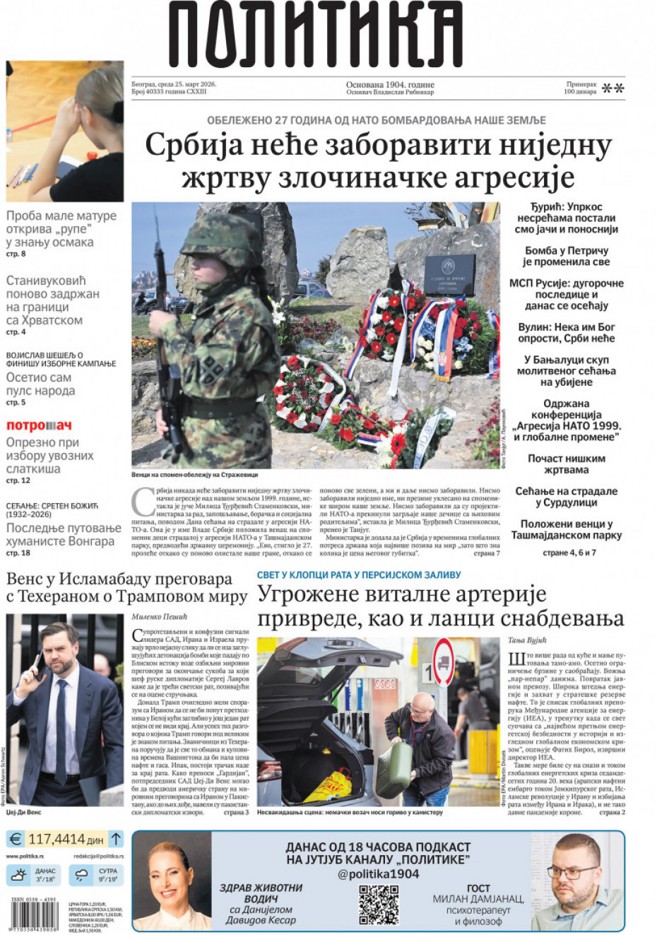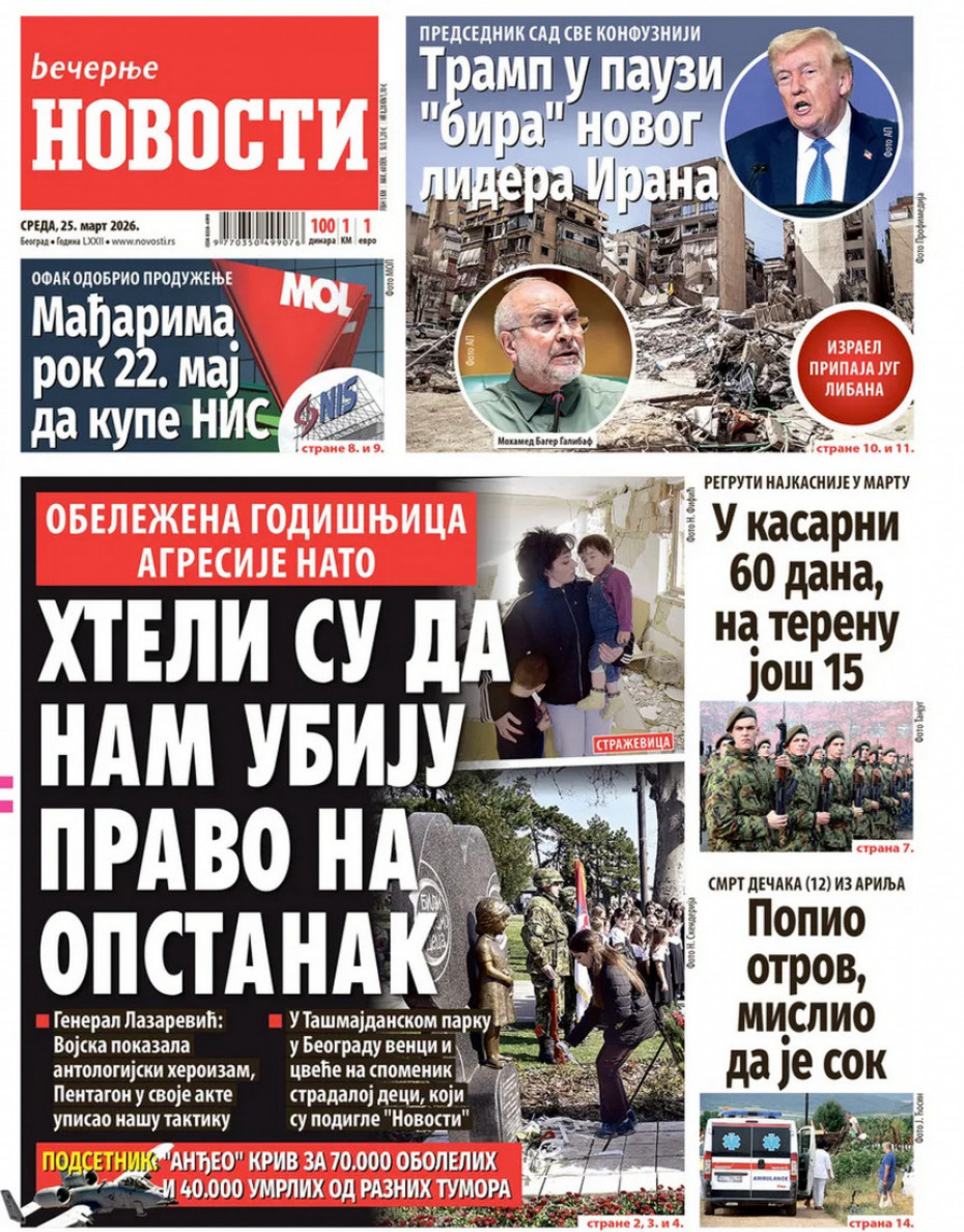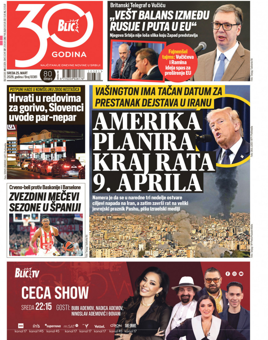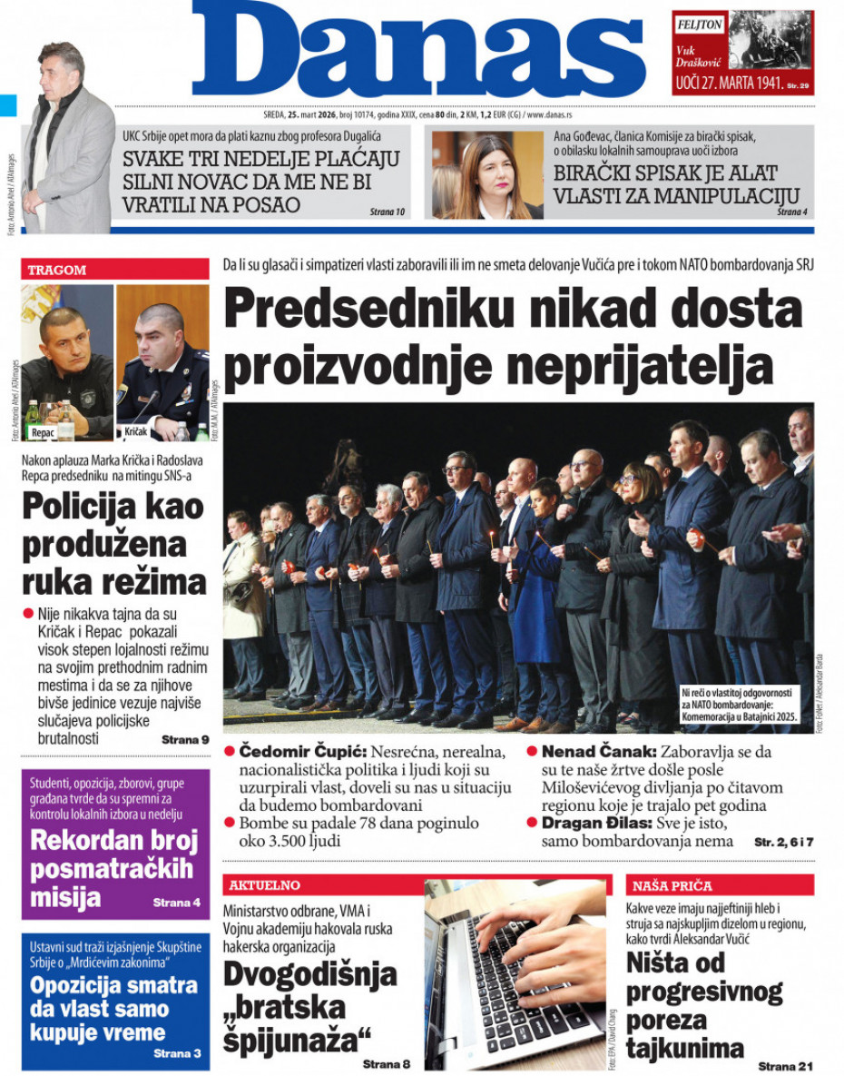Naslovne strane dnevne štampe za sredu, 25. mart