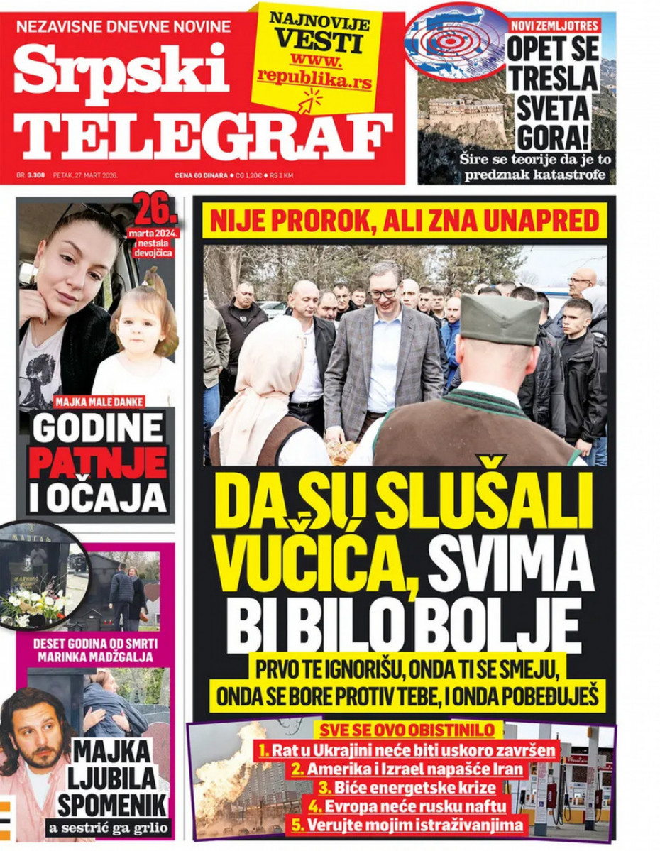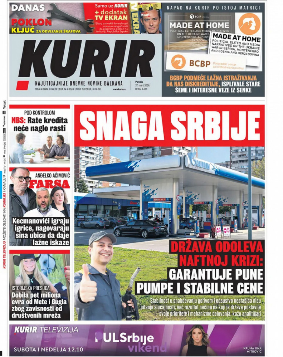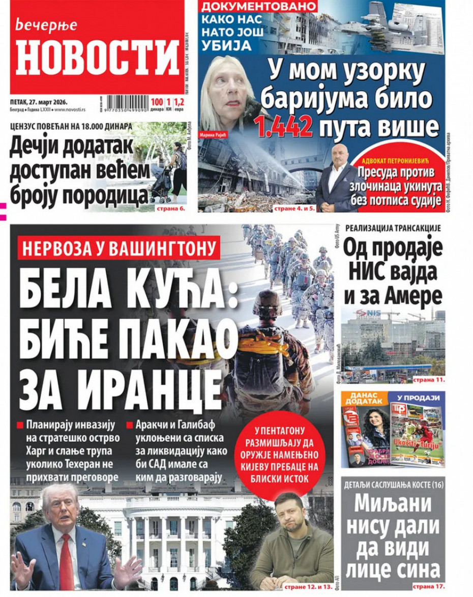 Pogledajte šta na naslovnim stranama donose dnevne novine u Srbiji u izdanju za petak, 27. mart