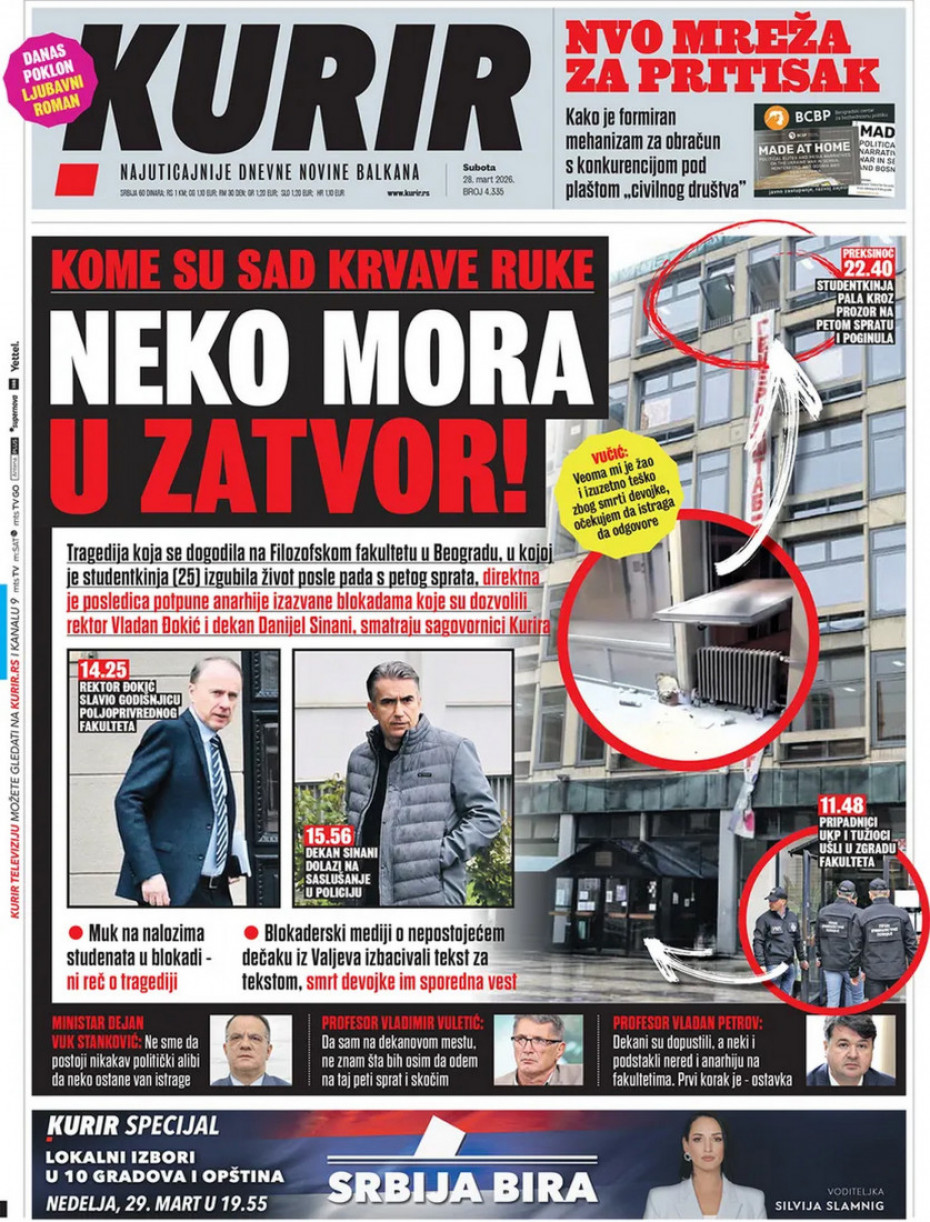 Aktuelno Dekan i troje zaposlenih sa Filozofskog došli u MUP na saslušanje zbog smrti devojke Policija je danas po nalogu Višeg javnog tužilaštva u Beogradu, kako je Tanjug ranije objavio, uputila pozive za saslušanje 27/03/2026 16:36 https://www.euronews.rs/srbija/aktuelno/216635/dekan-filozofskog-fakulteta-na-saslusanju/vest pročitaj celu vest