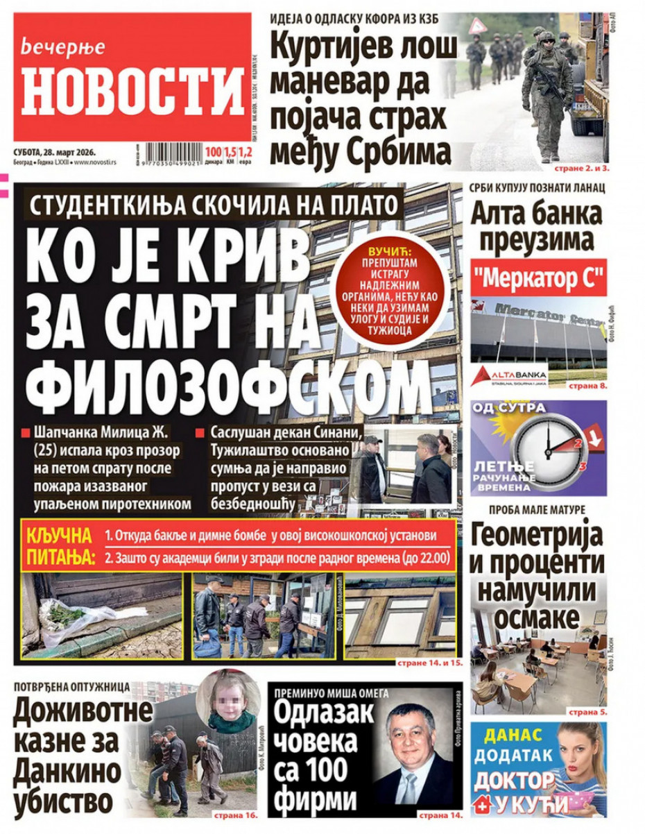 Aktuelno Probudite se uz Euronews Jutro: Šta do sada znamo o tragediji na Filozofskom fakultetu Emisiju vodi Iva Jovančić 27/03/2026 21:46 https://www.euronews.rs/srbija/aktuelno/216667/sta-do-sada-znamo-o-tragediji-na-filozofskom-fakultetu/vest pročitaj celu vest