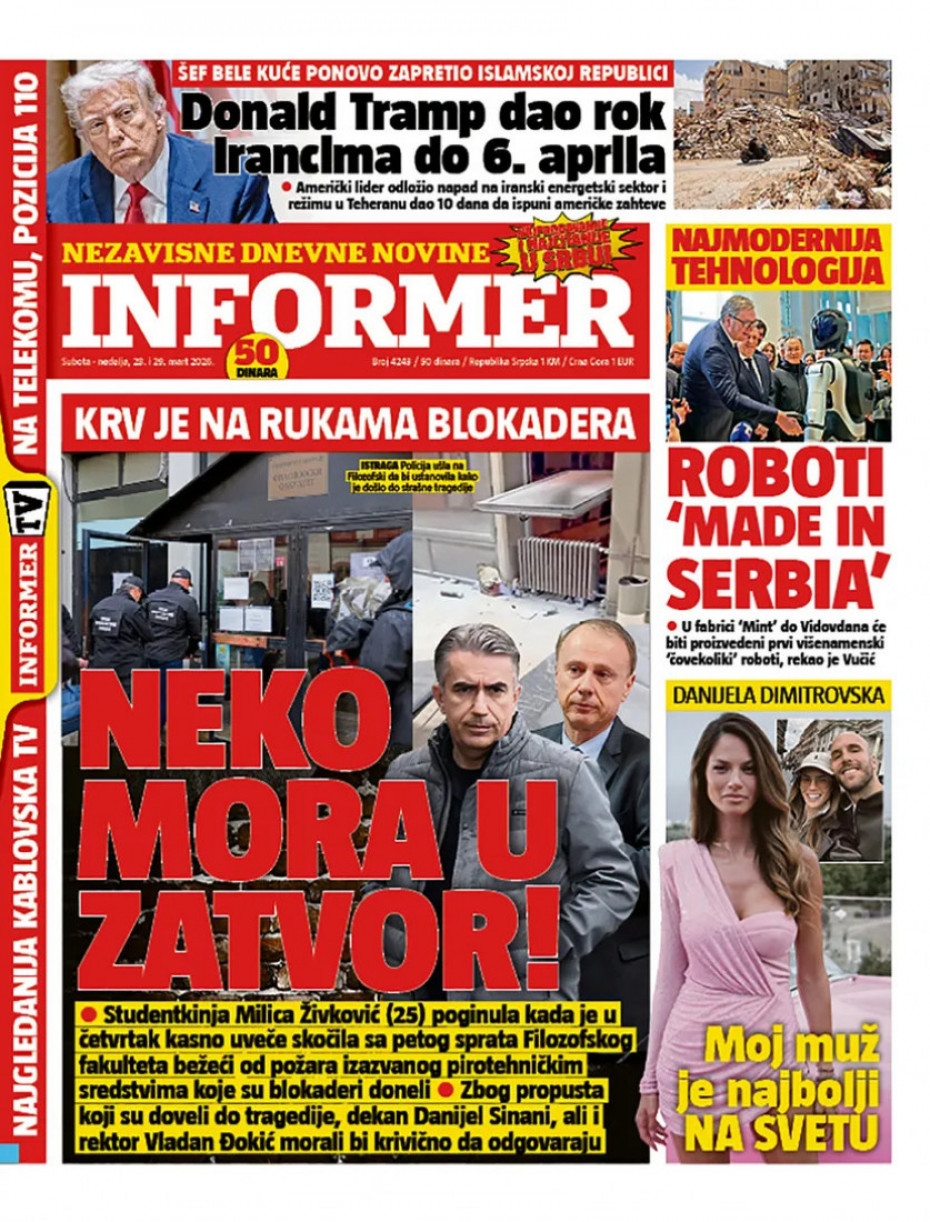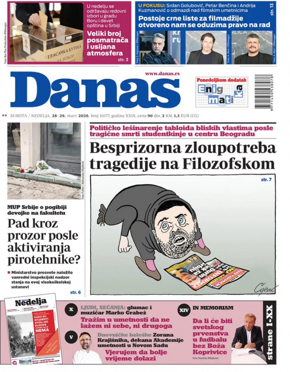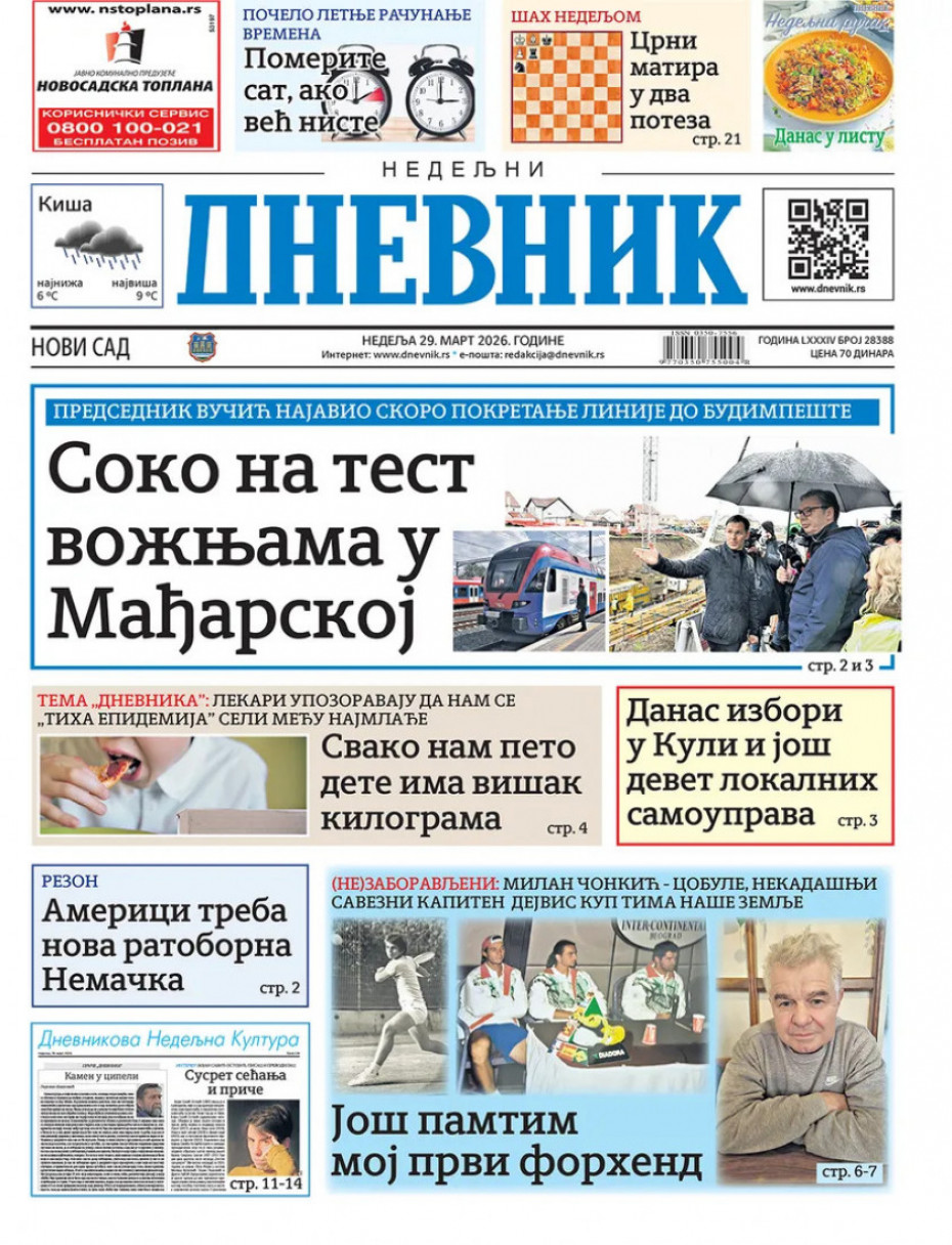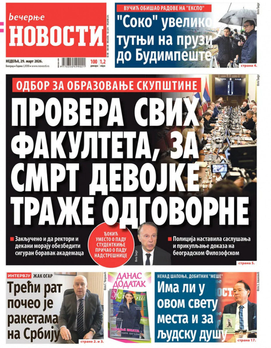 Naslovna Srbija Politika Politika Naslovne strane dnevne štampe za nedelju, 29. mart Komentari Naslovne strane dnevne štampe za nedelju, 29. mart - Copyright Profimedia, Logo Autor: Euronews Srbija 28/03/2026 - 20:42 Podeli veličina teksta Aa Aa Pogledajte šta na naslovnim stranama donose dnevne novine u Srbiji u izdanju za nedelju, 29. mart Promo Pogledaj galeriju Promo Pogledaj galeriju Promo Pogledaj galeriju Promo Pogledaj galeriju Promo Pogledaj galeriju Promo Pogledaj galeriju Promo Pogledaj galeriju Promo Pogledaj galeriju Promo Pogledaj galeriju Više o... Naslovne strane Dnevne novine Srbija Naslovne strane za nedelju 29.mart Top tagovi Euronews Montenegro Kosovo i Metohija Rat u Ukrajini Kriza na Bliskom istoku