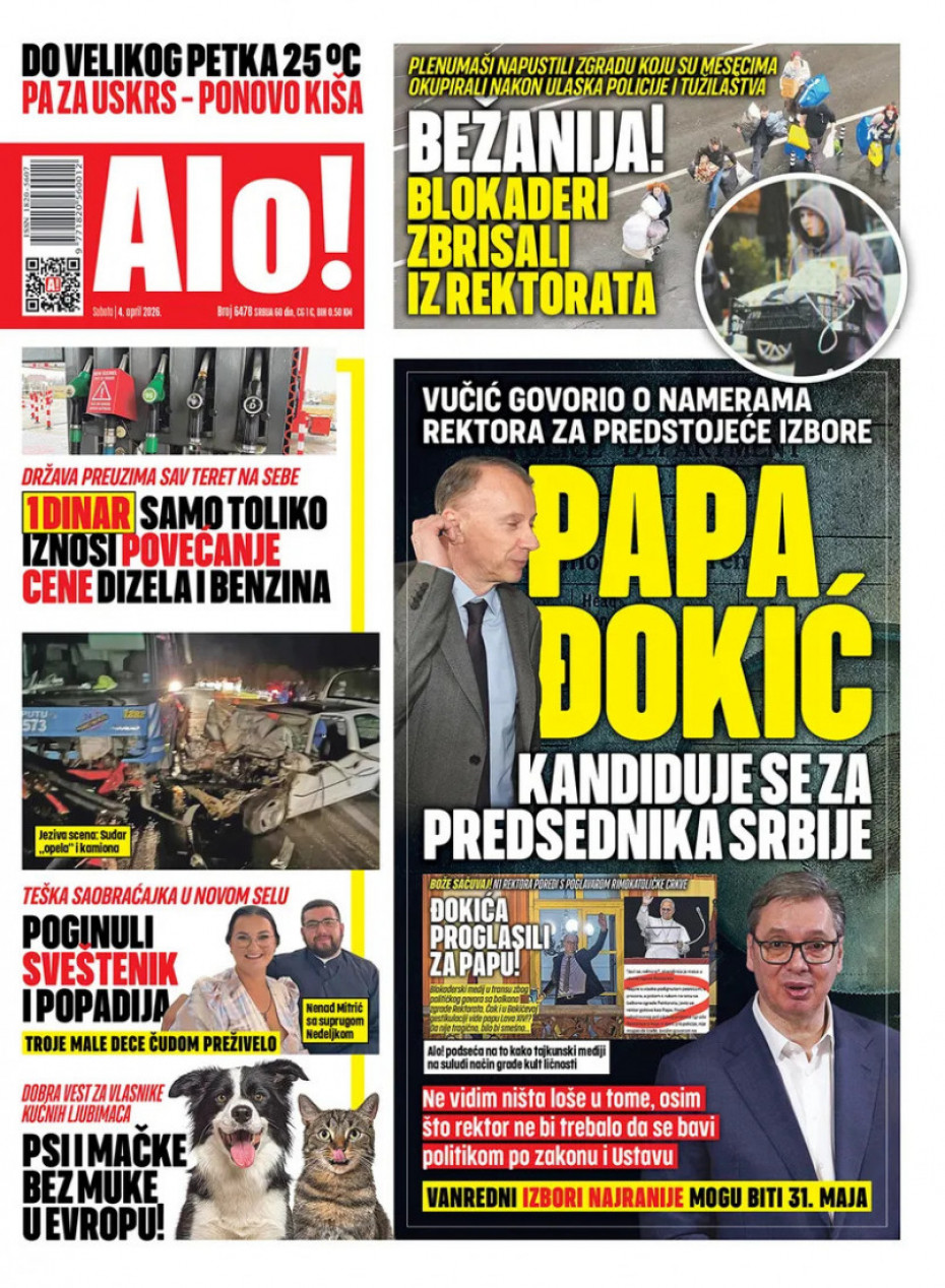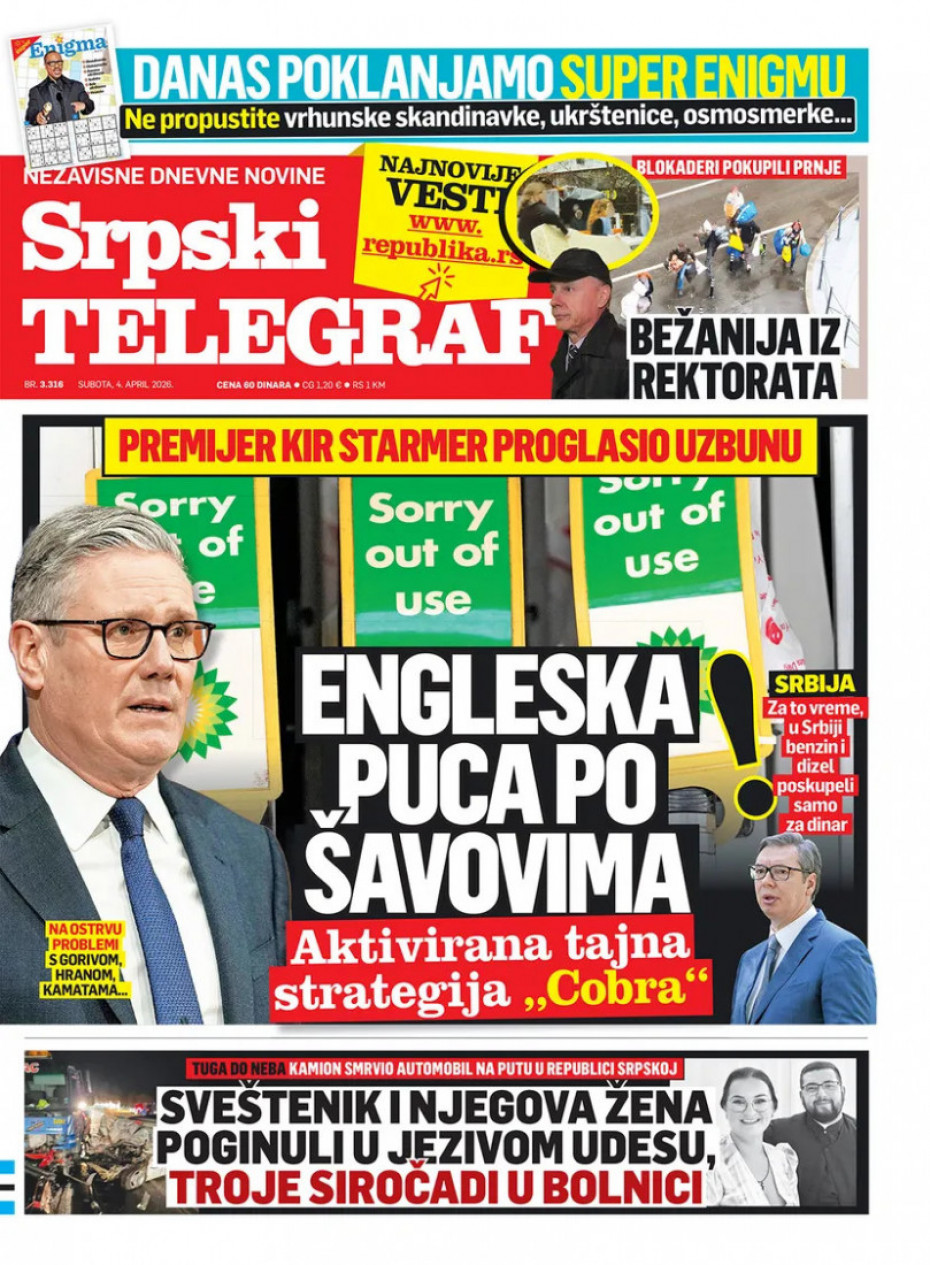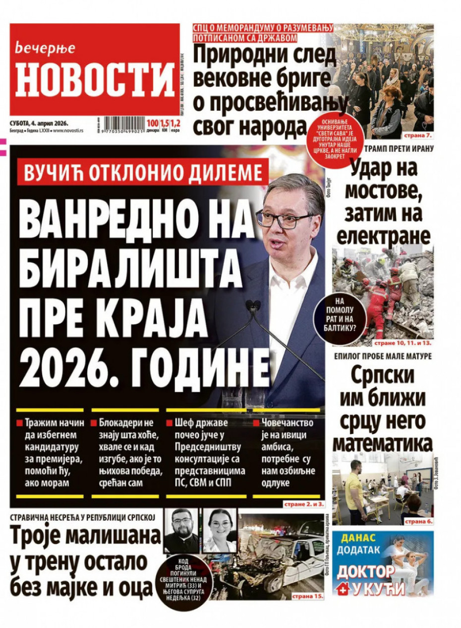 Naslovna Srbija Politika Politika Naslovne strane dnevne štampe za subotu, 4. april Komentari Naslovne strane dnevne štampe za subotu, 4. april - Copyright Profimedia, Logo Autor: Euronews Srbija 03/04/2026 - 20:45 Podeli veličina teksta Aa Aa Pogledajte šta na naslovnim stranama donose dnevne novine u Srbiji u izdanju za subotu, 4. april. Promo Pogledaj galeriju Promo Pogledaj galeriju Promo Pogledaj galeriju Promo Pogledaj galeriju Promo Pogledaj galeriju Promo Pogledaj galeriju Promo Pogledaj galeriju Promo Pogledaj galeriju Promo Pogledaj galeriju Više o... Naslovne strane Naslovne strane sutrašnjih novina Dnevne novine naslovnice Dnevne novine u Srbiji Top tagovi Euronews Montenegro Kosovo i Metohija Rat u Ukrajini Kriza na Bliskom istoku