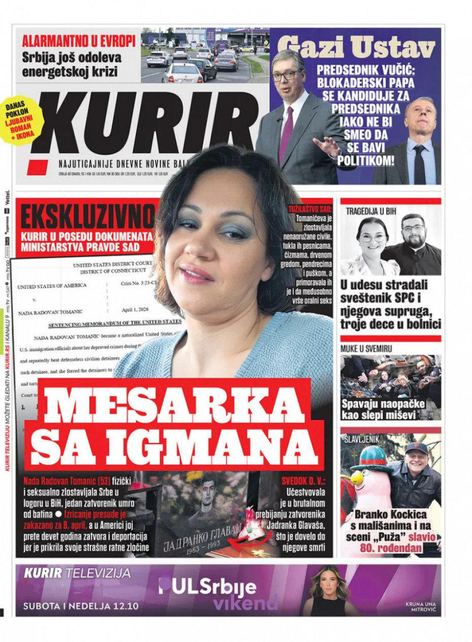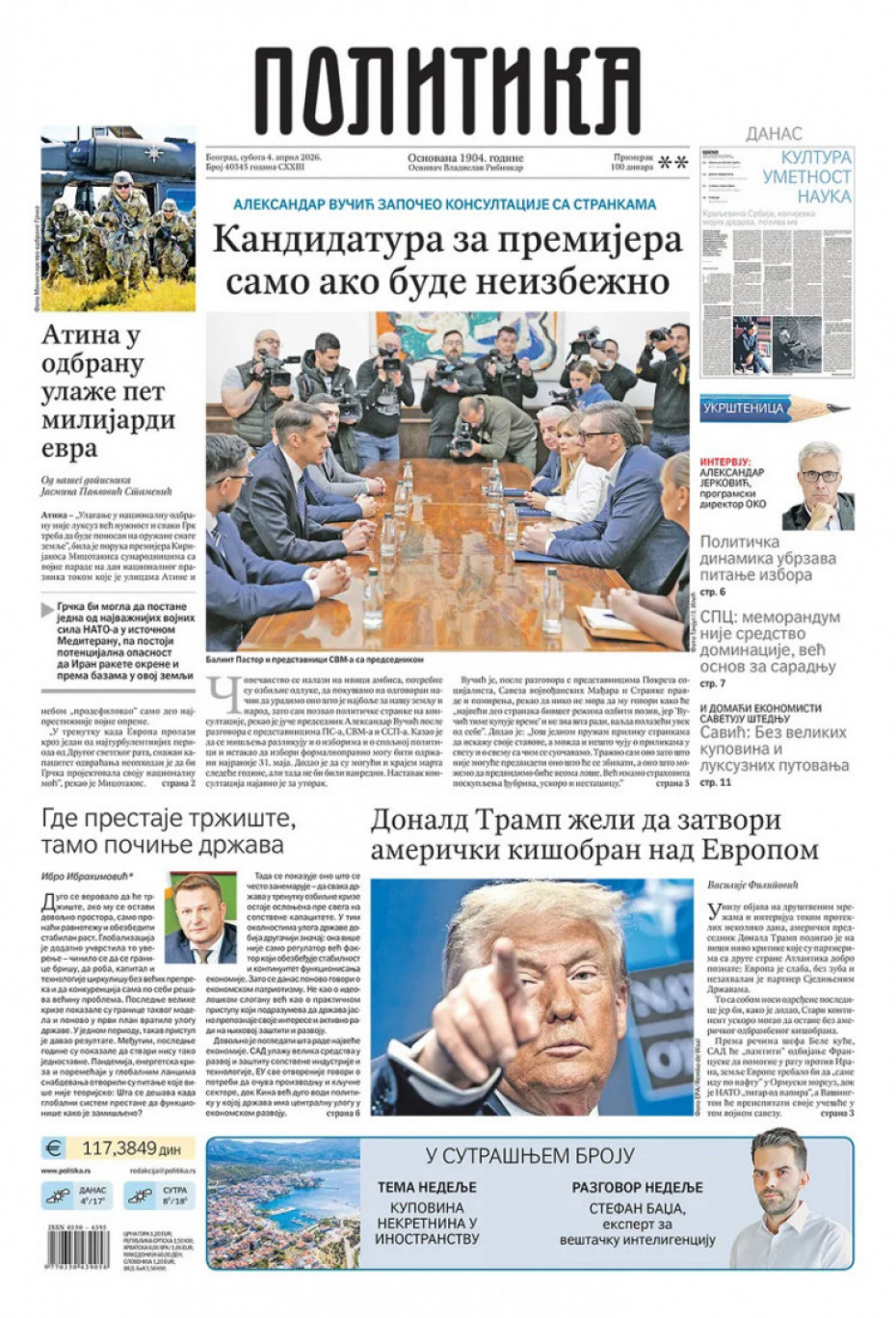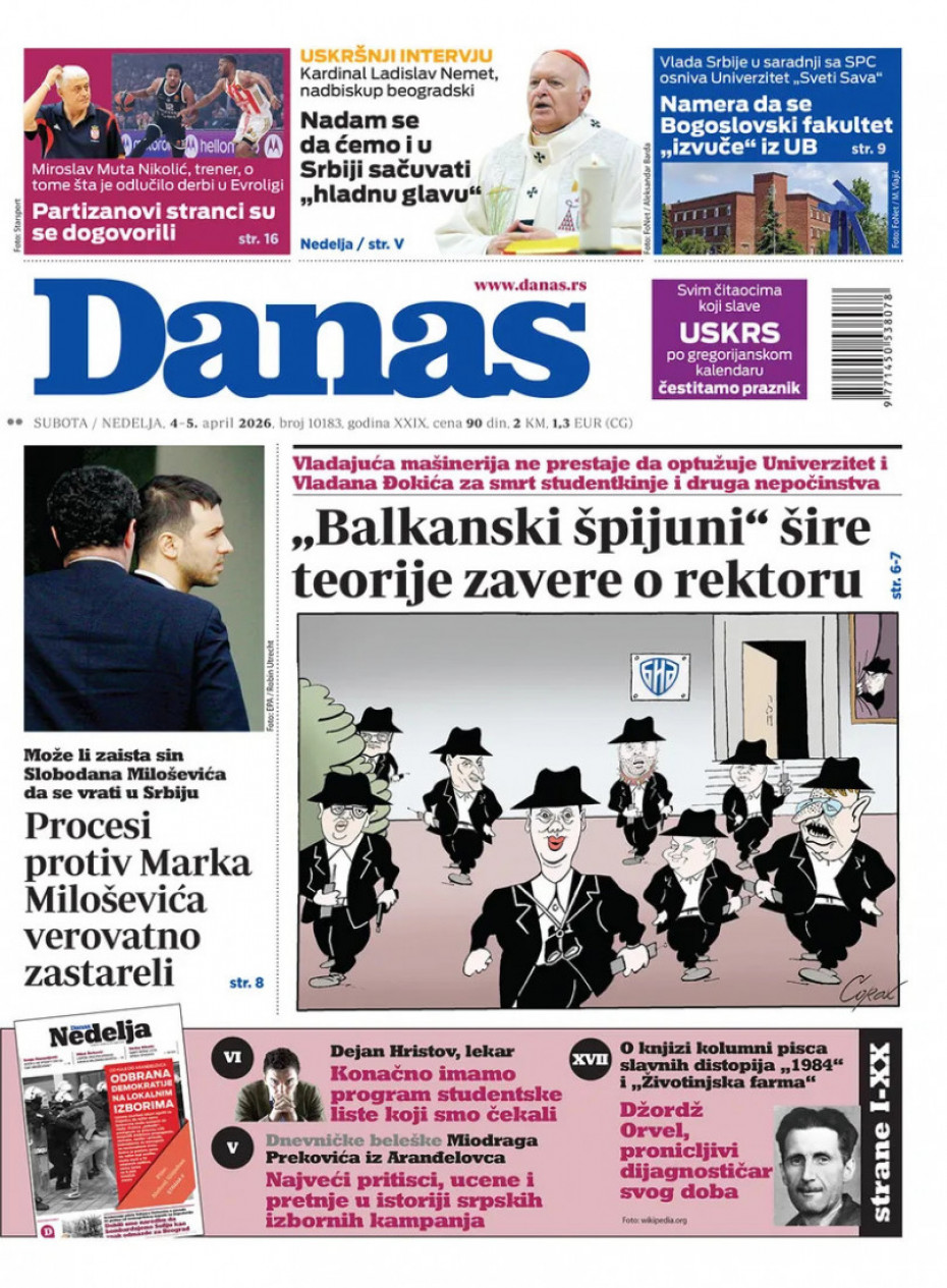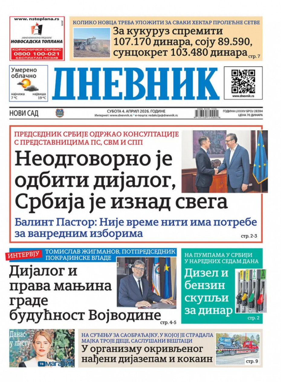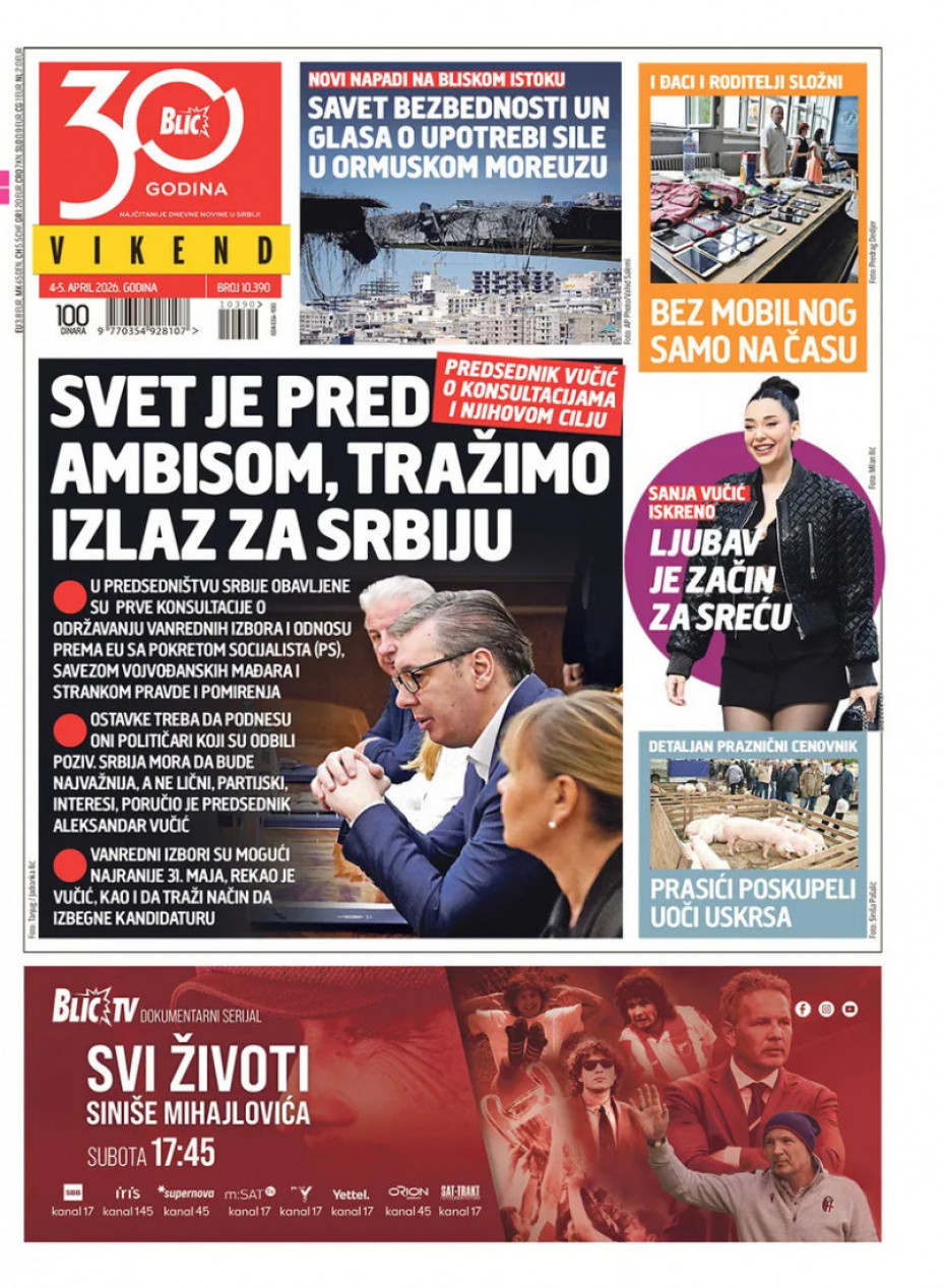 Politika Naslovne strane dnevne štampe za subotu, 4. april Pogledajte šta na naslovnim stranama donose dnevne novine u Srbiji u izdanju za subotu, 4. april 03/04/2026 20:45 https://www.euronews.rs/srbija/politika/217638/naslovne-strane-dnevne-stampe-za-subotu-4-april/vest pročitaj celu vest