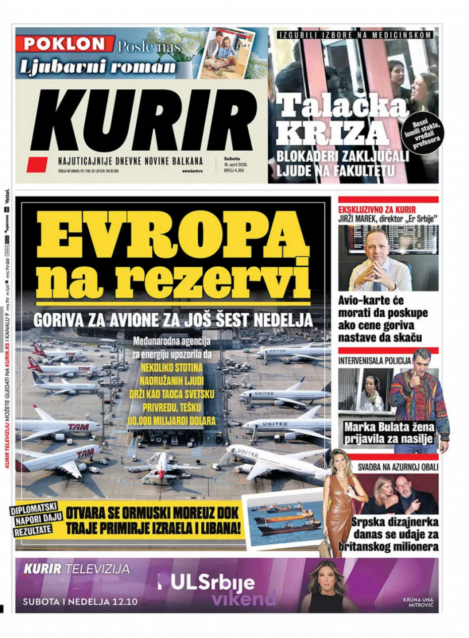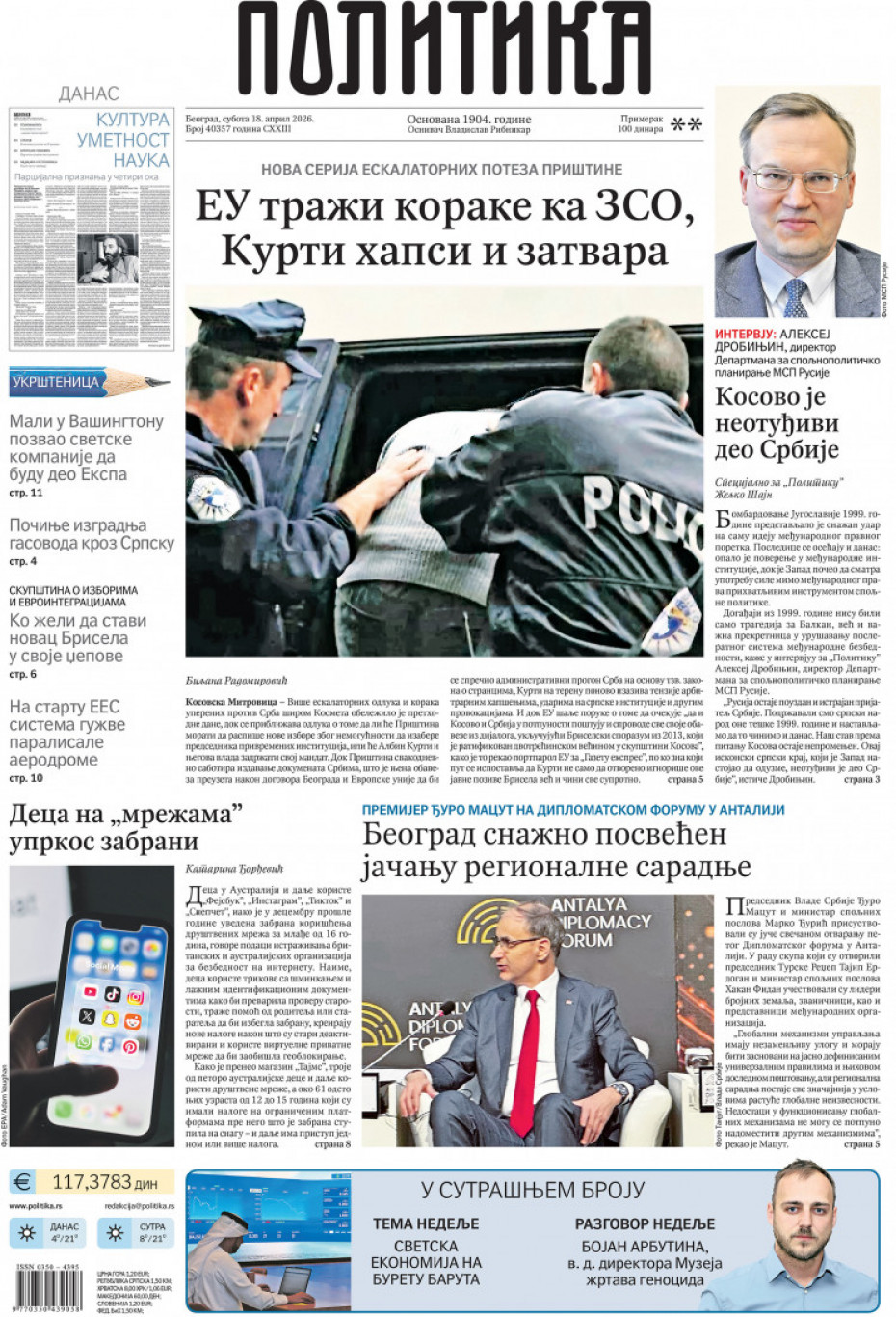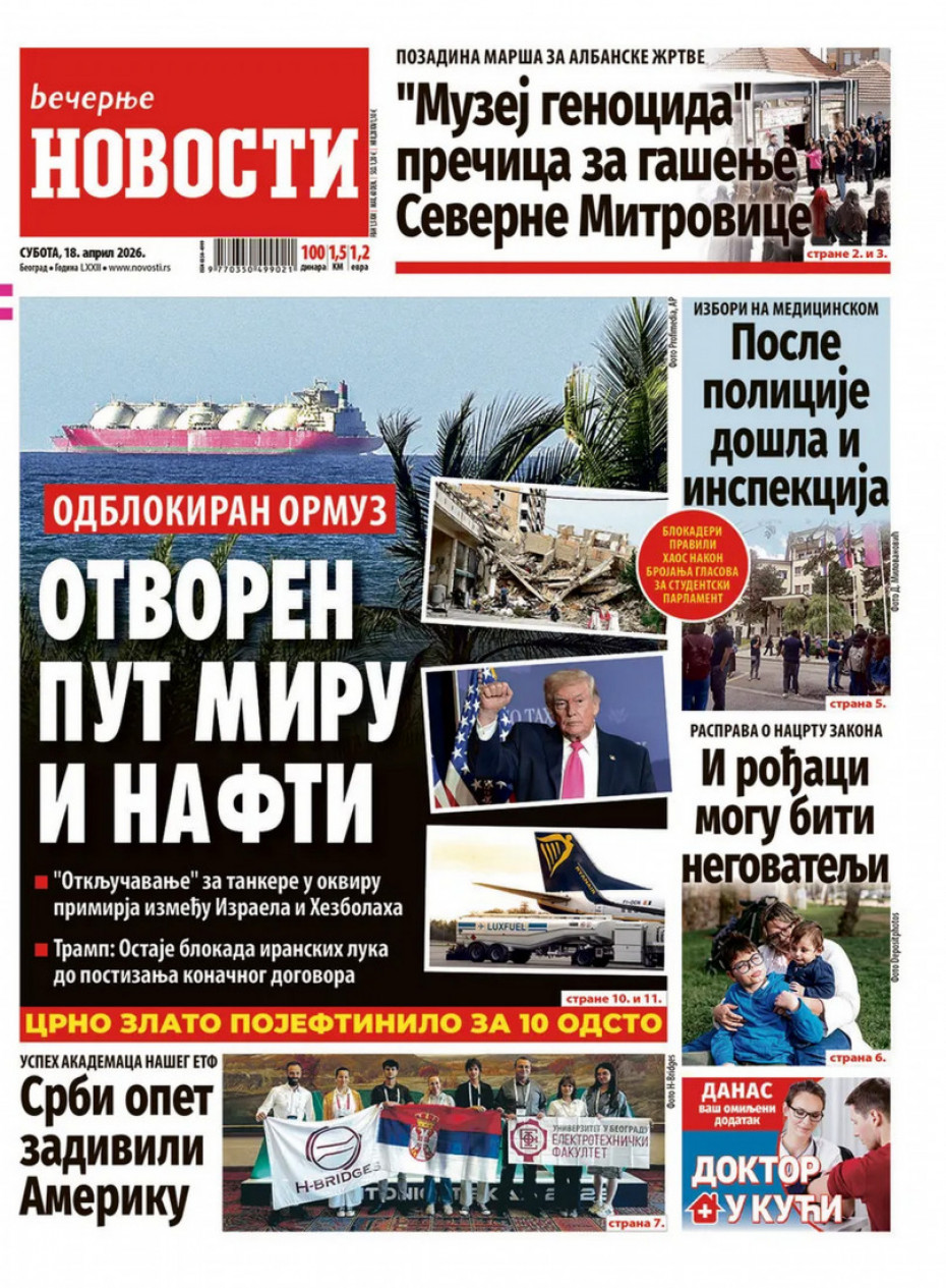Politika Naslovne strane dnevne štampe za subotu, 18. april Pogledajte šta na naslovnim stranama donose dnevne novine u Srbiji u izdanju za subotu, 18. april 17/04/2026 20:23 https://www.euronews.rs/srbija/politika/219633/naslovne-strane-dnevne-stampe-za-subotu-18-april/vest pročitaj celu vest