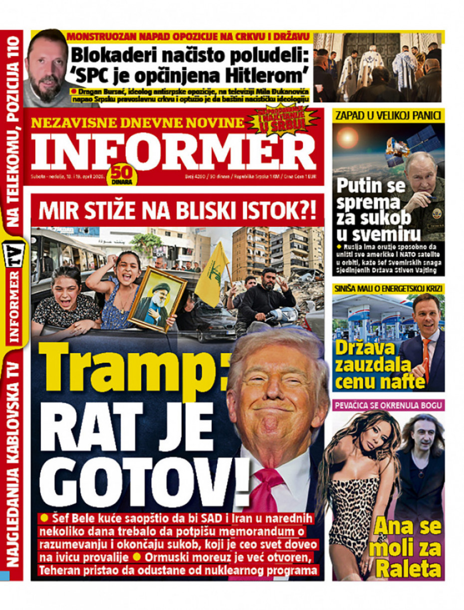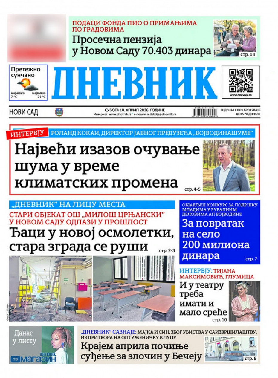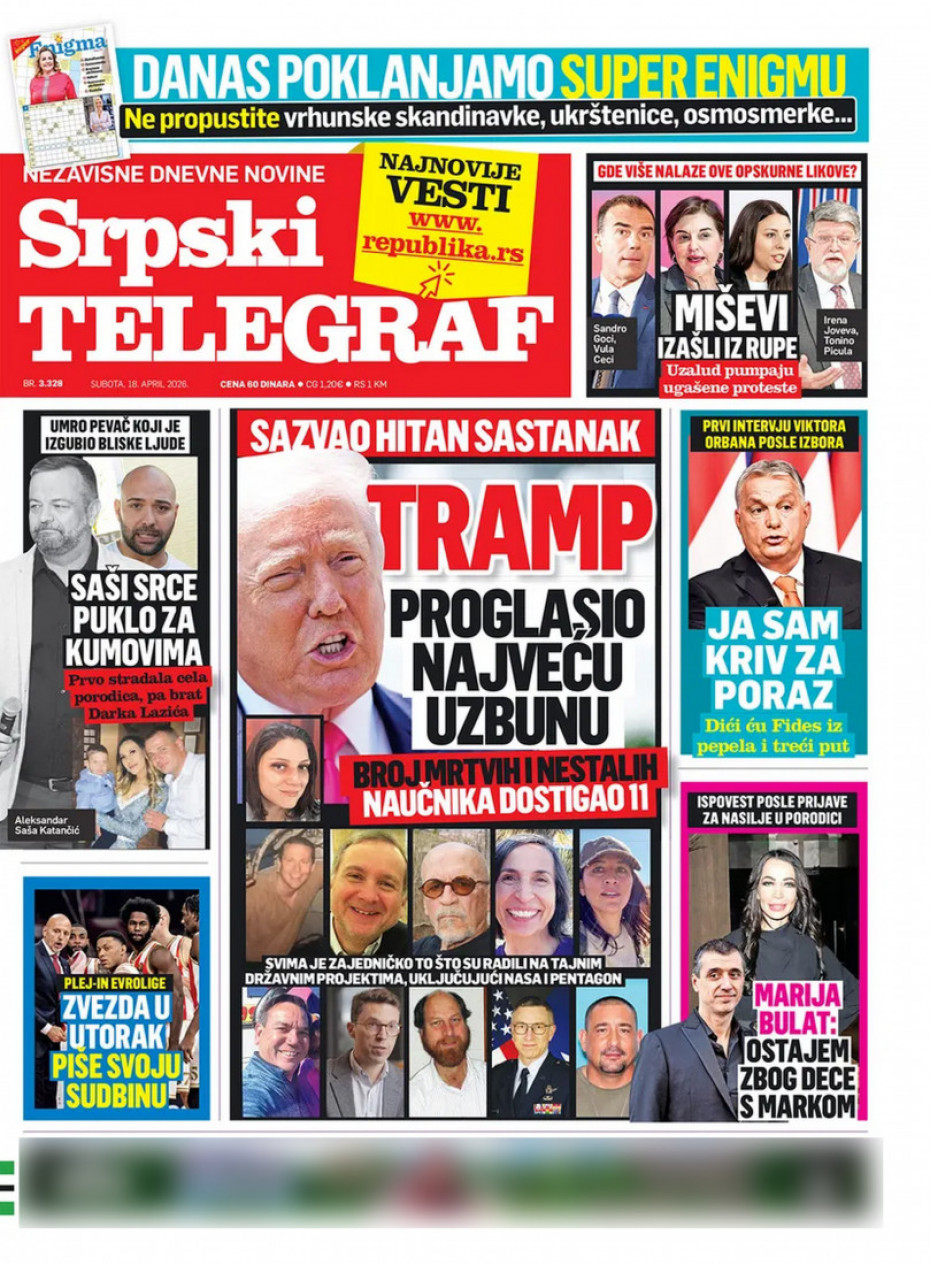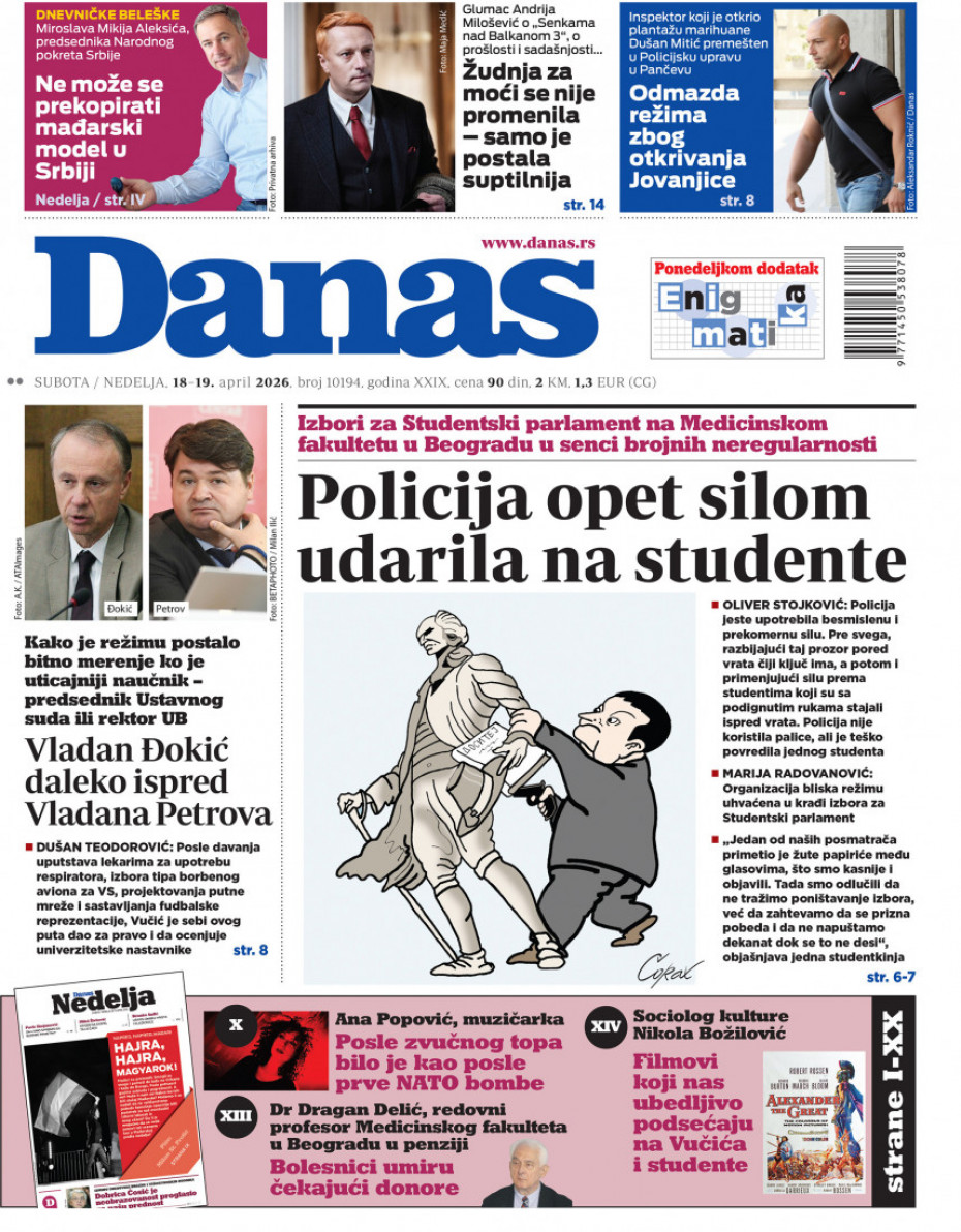 Politika Naslovne strane dnevne štampe za subotu, 18. april Pogledajte šta na naslovnim stranama donose dnevne novine u Srbiji u izdanju za subotu, 18. april 17/04/2026 20:23 https://www.euronews.rs/srbija/politika/219633/naslovne-strane-dnevne-stampe-za-subotu-18-april/vest pročitaj celu vest