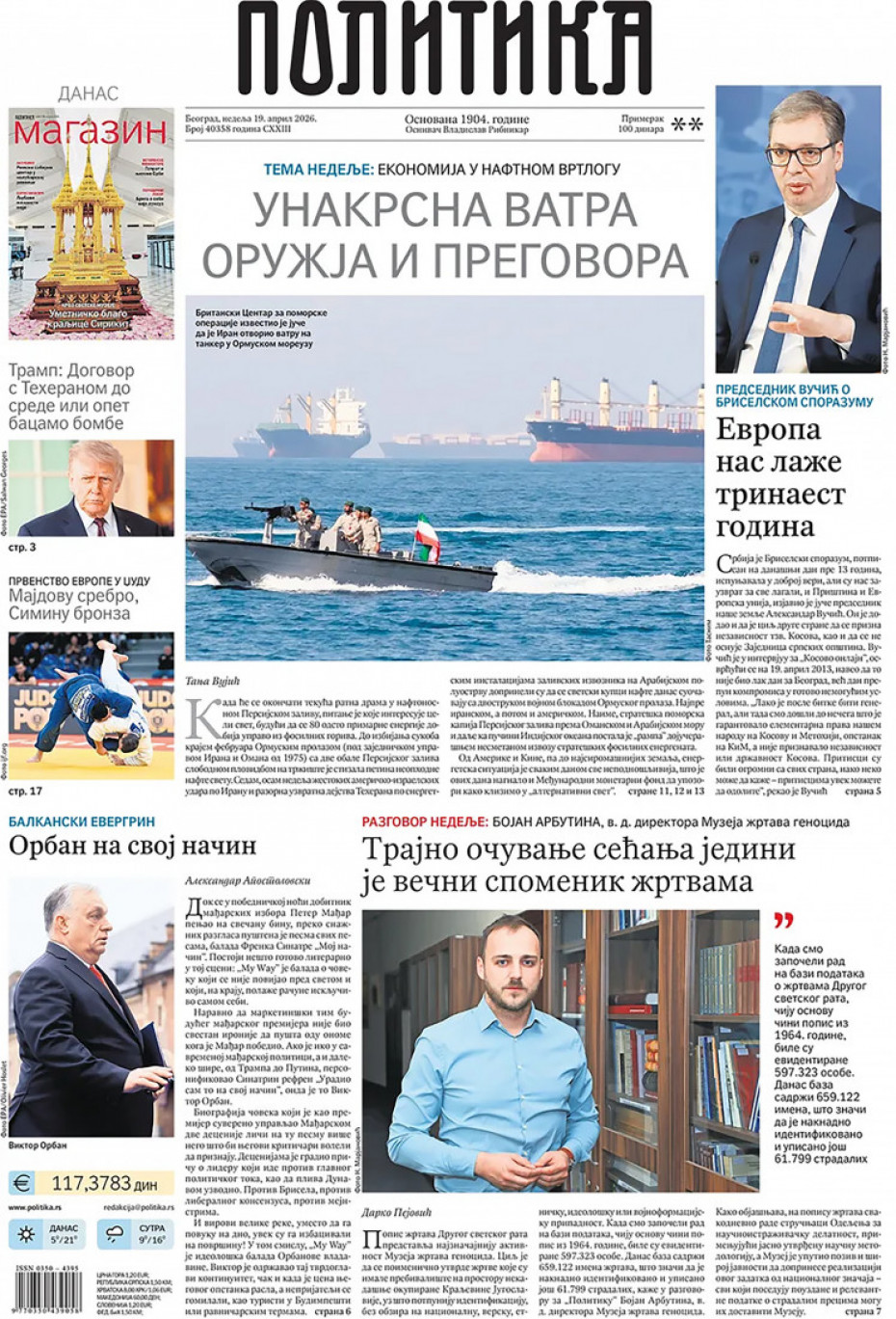 Naslovne strane dnevne štampe za nedelju, 19. april