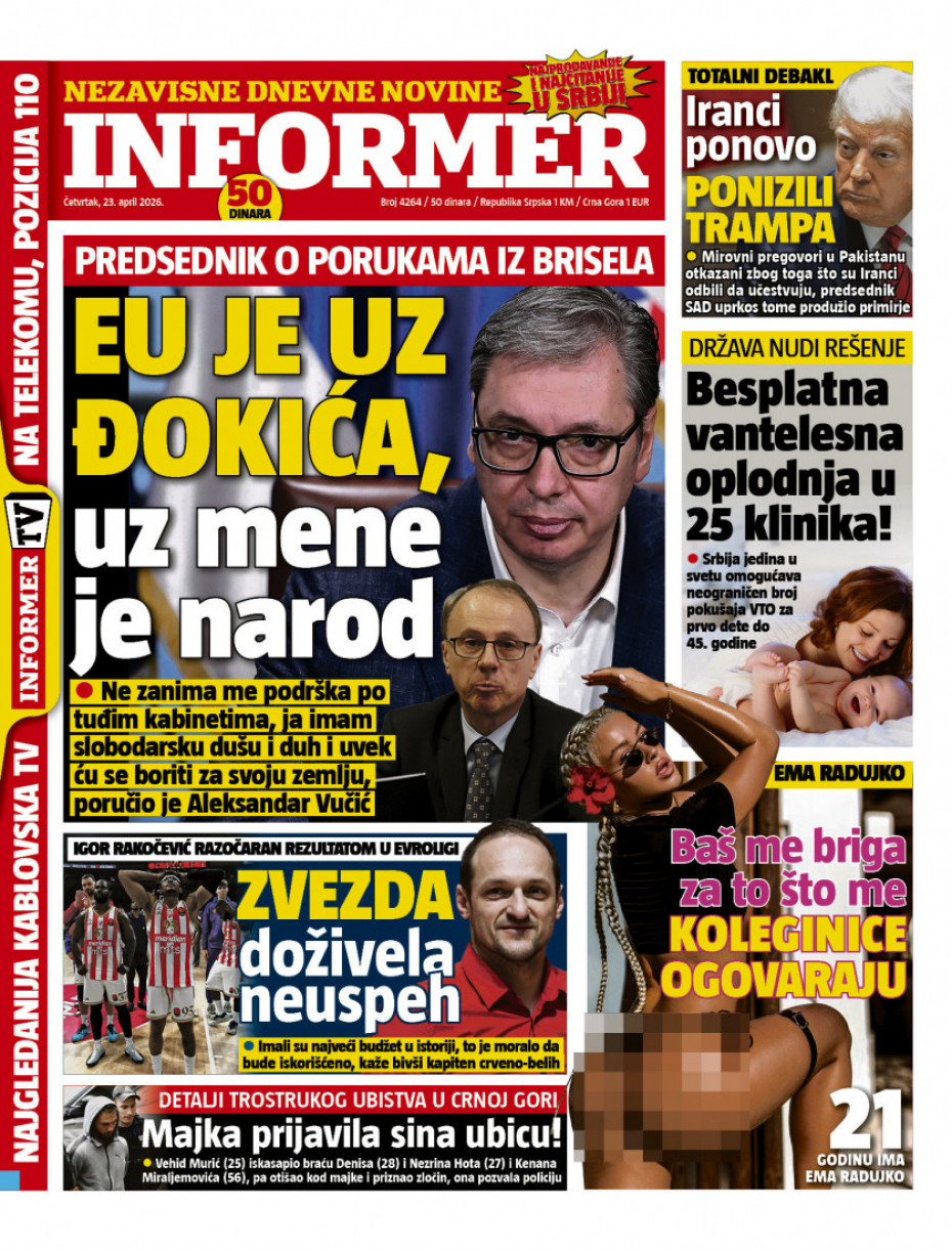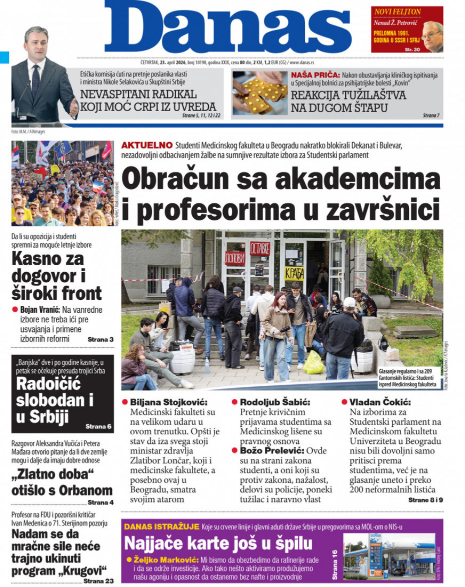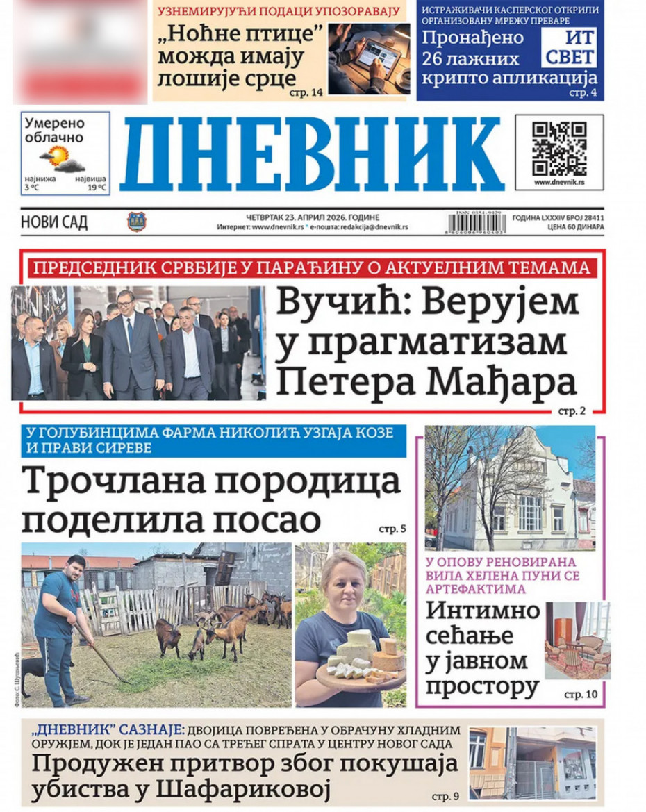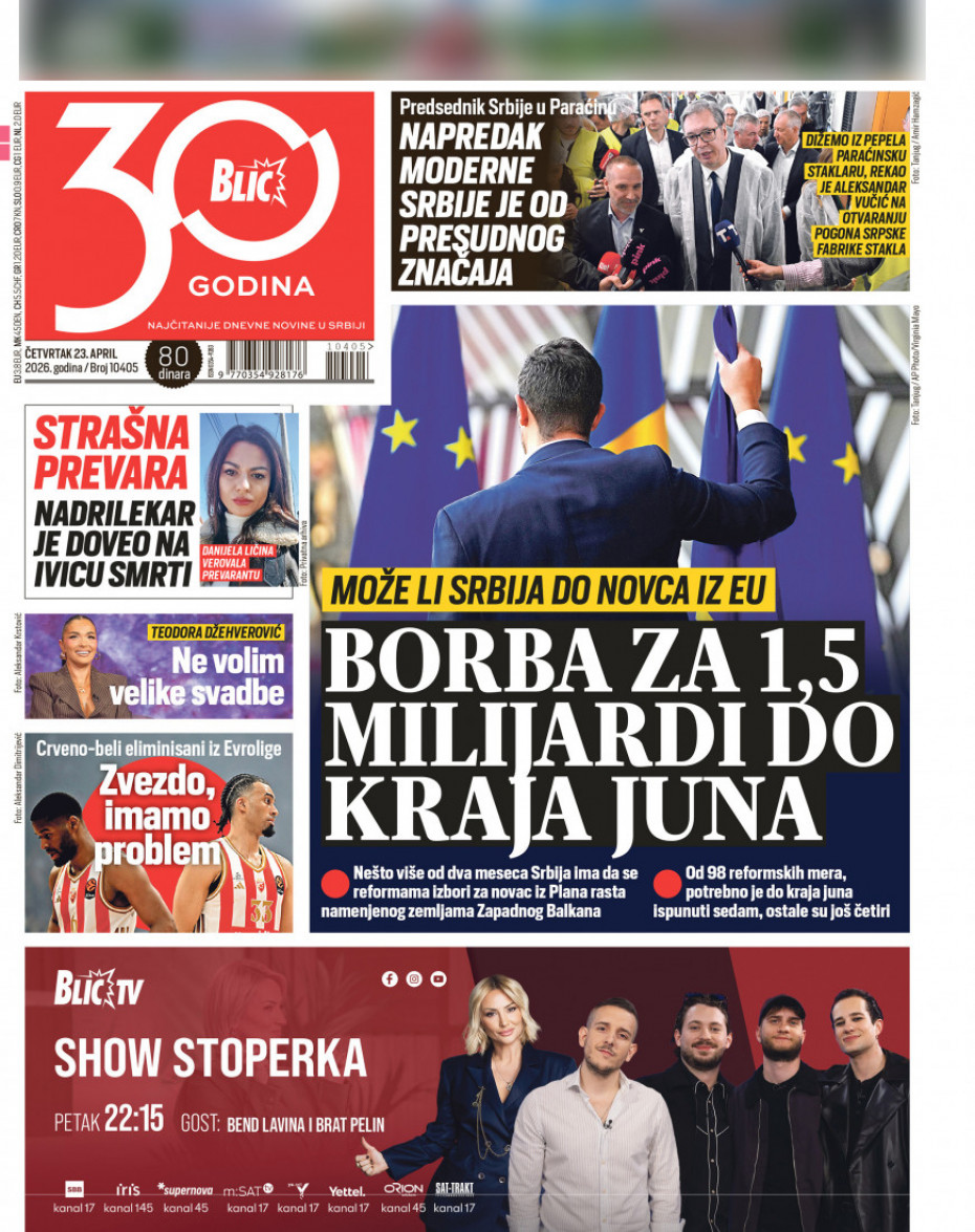 Pogledajte šta na naslovnim stranama donose dnevne novine u Srbiji u izdanju za četvrtak, 23. april